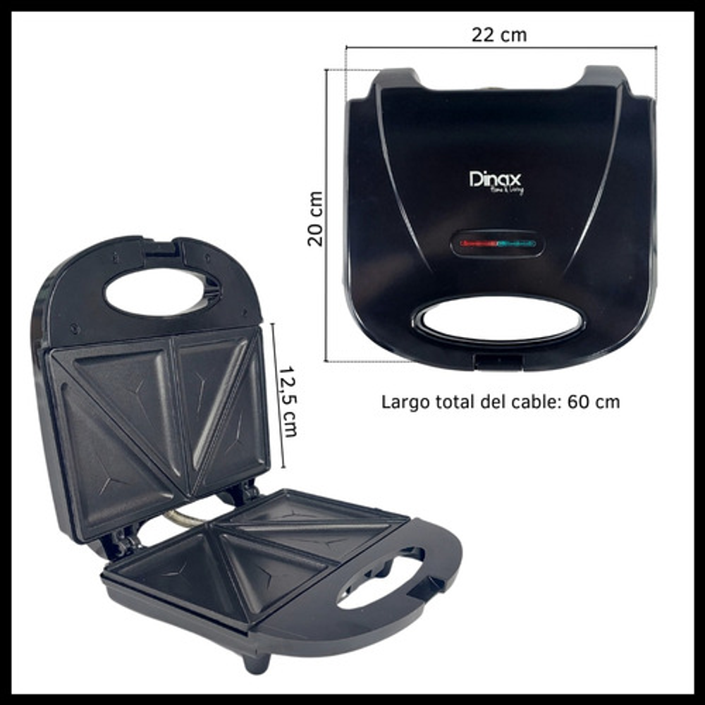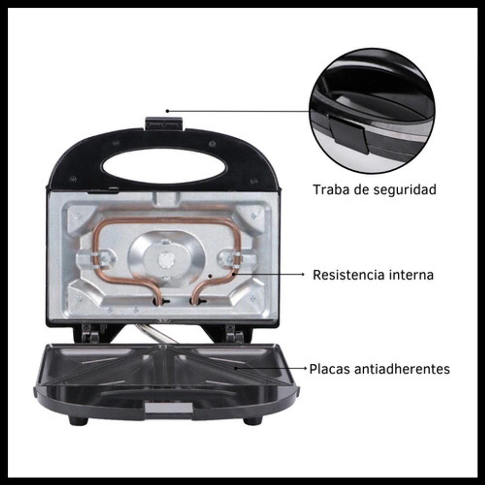 Características de la cafetera: • Potencia: 700W. • Placas antiadherentes. • Base antideslizante. • Capacidad para dos tostados. • Traba de seguridad. • Luces indicadoras de uso.