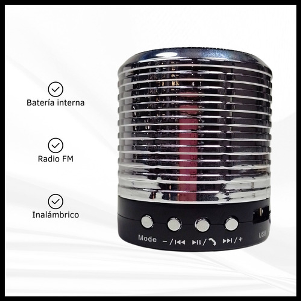 Características: • Ranura para tarjeta SD / TF. • Batería recargable vía USB. • Función manos libres. • Conexión Bluetooth. • Batería interna. • Inalámbrico. • Radio FM.