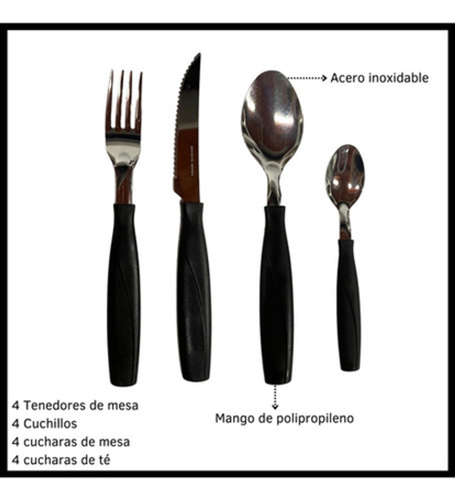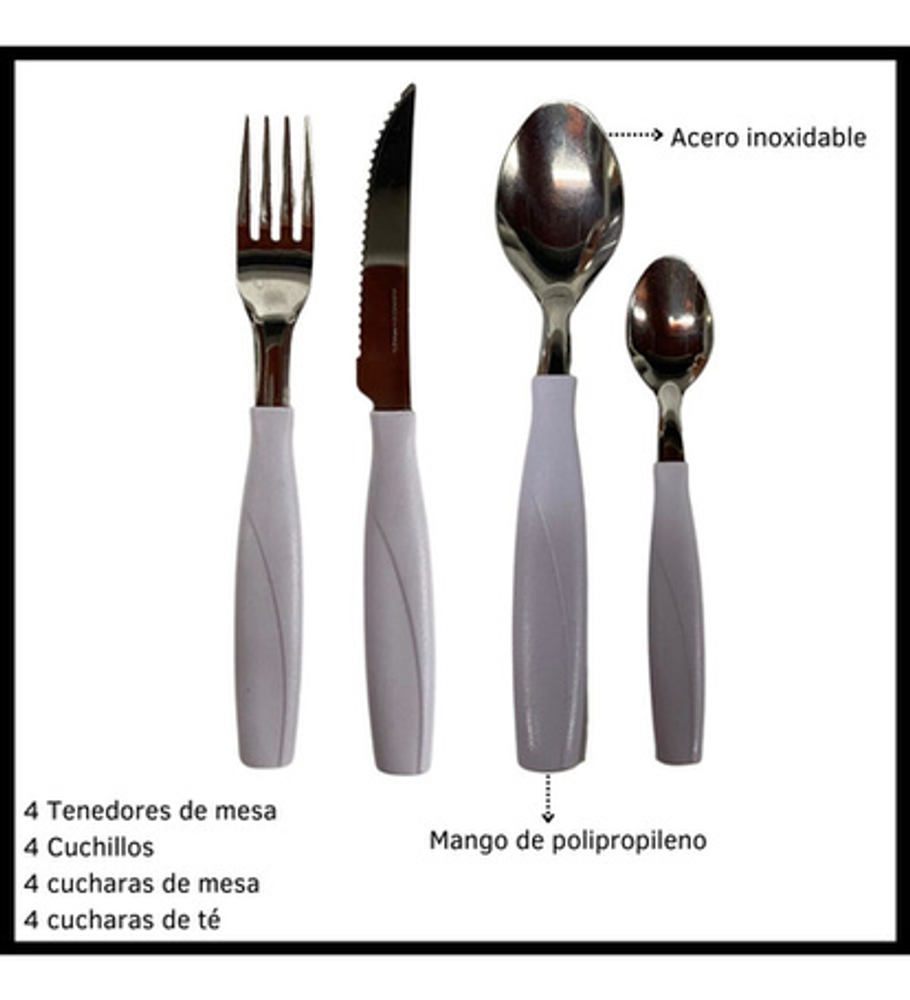 Cubiertos incluidos: Cuchara,CucharaTé,Cuchillo,Tenedor