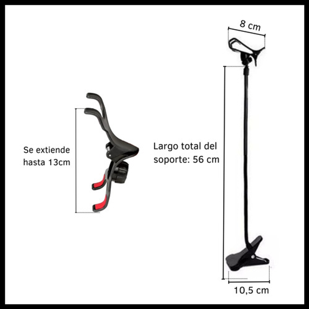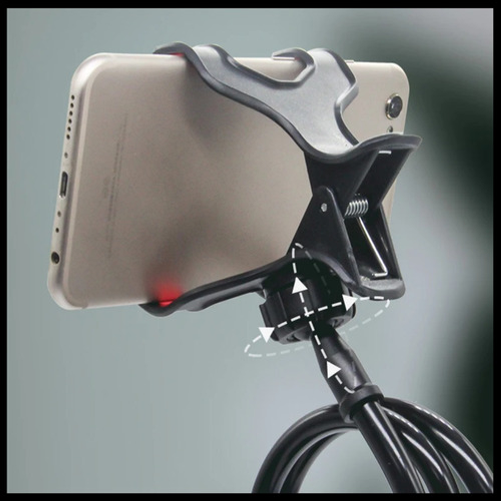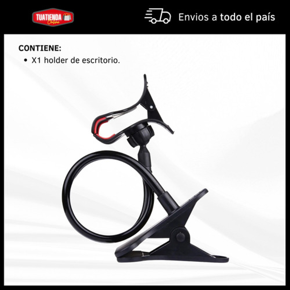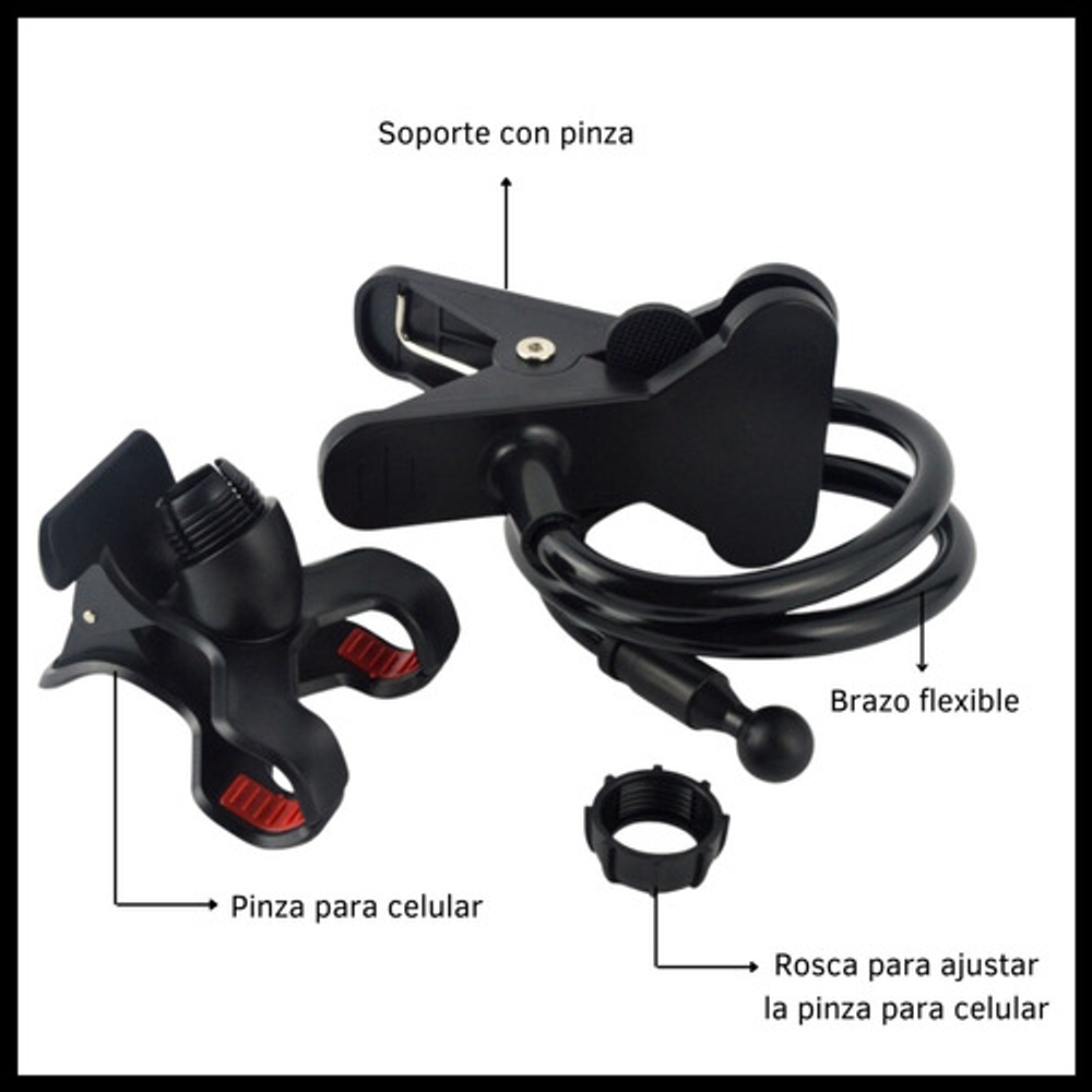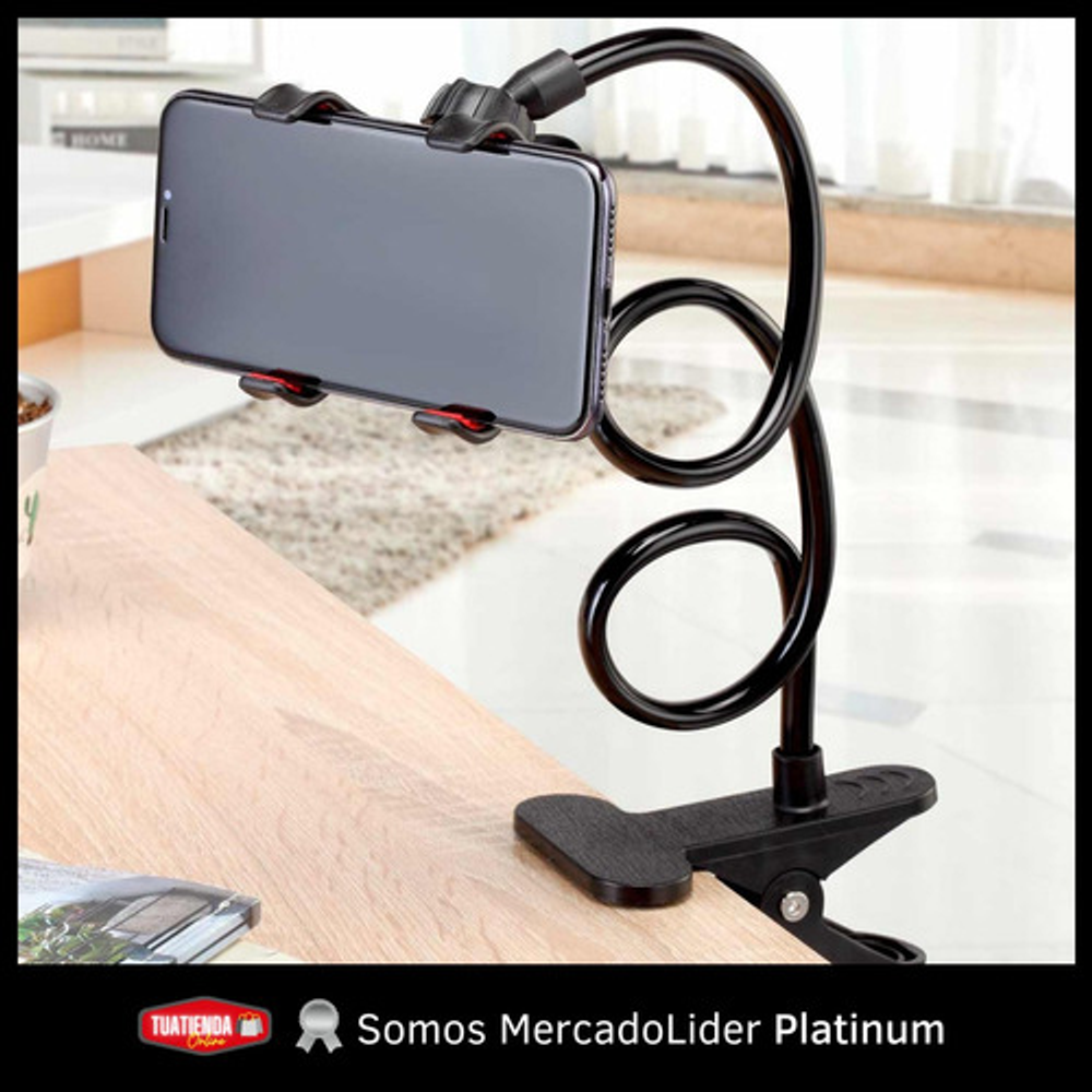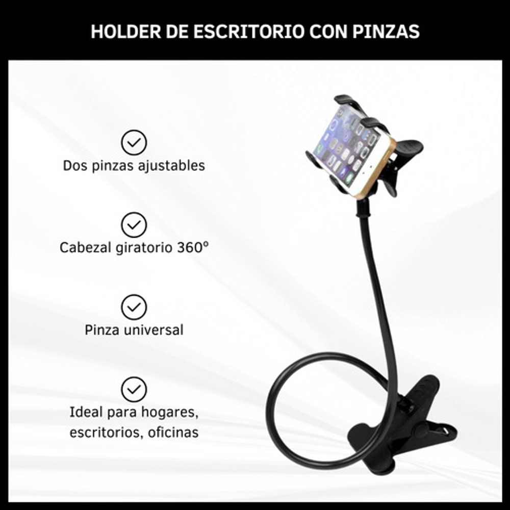 Características: -Pinza universal ajustable para celular. -Pinza ajustable para mesas, escritorios, etc. -Ideal para oficinas, escritorios, hogares, etc. -Cabezal giratorio 360º. -Brazo flexible.