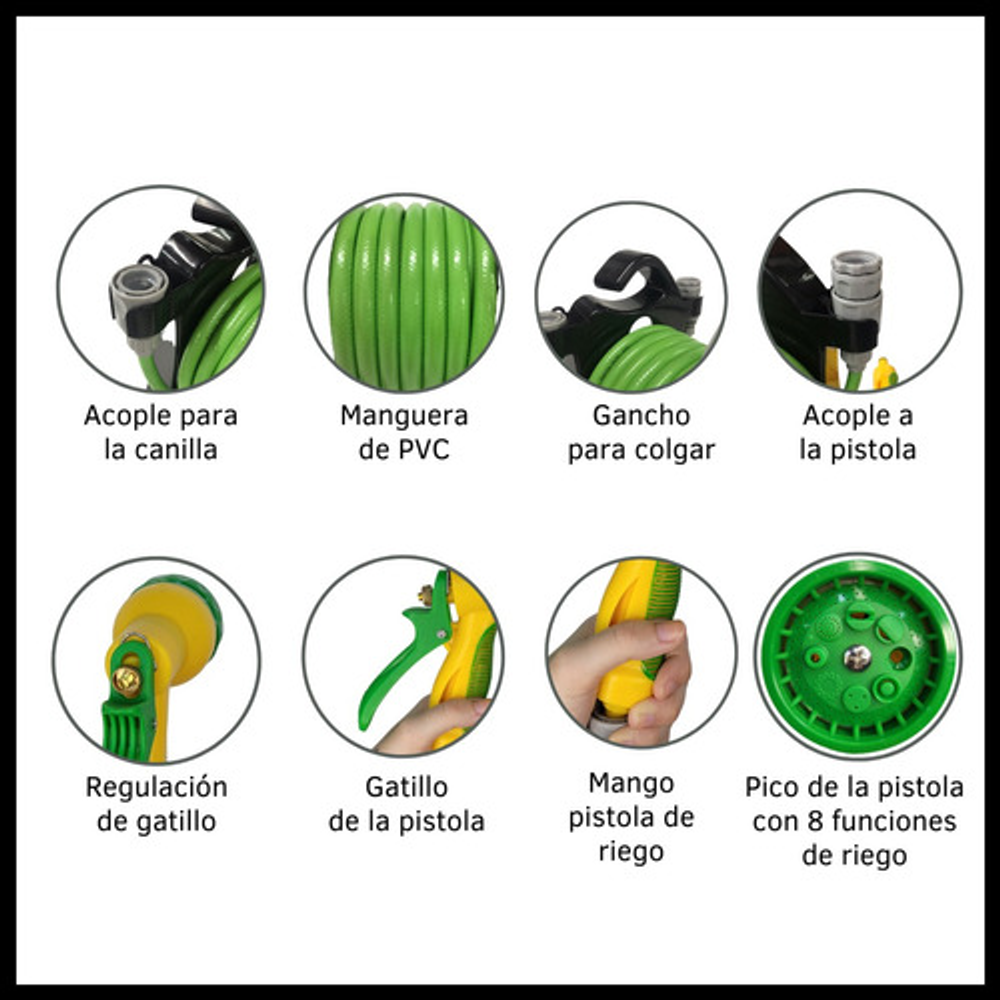 ¡Tu compañero ideal para mantener limpio y cuidar tu jardín! Con su diseño ligero y flexible, la manguera de riego se despliega fácilmente, permitiéndote llegar a cada rincón de tu jardín sin esfuerzo. La pistola de riego ajustable te brinda opciones para regar delicadamente tus flores o limpiar con potencia áreas más grandes.