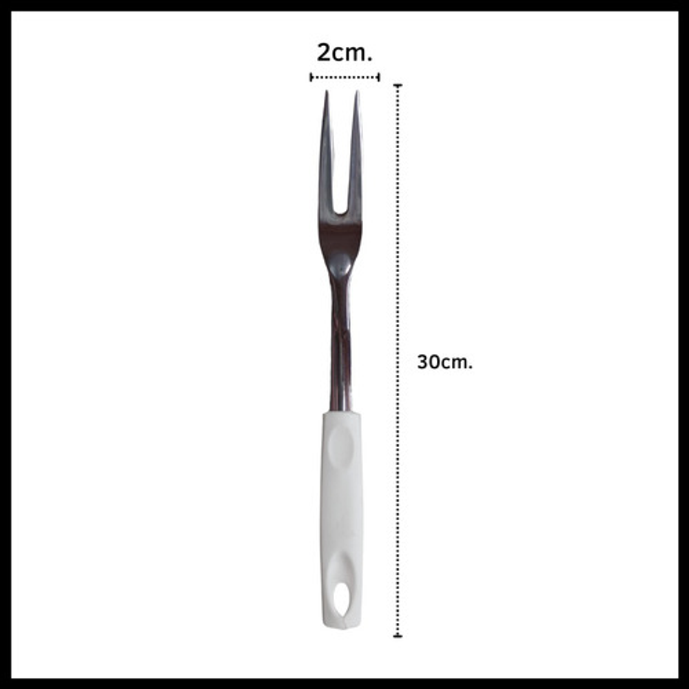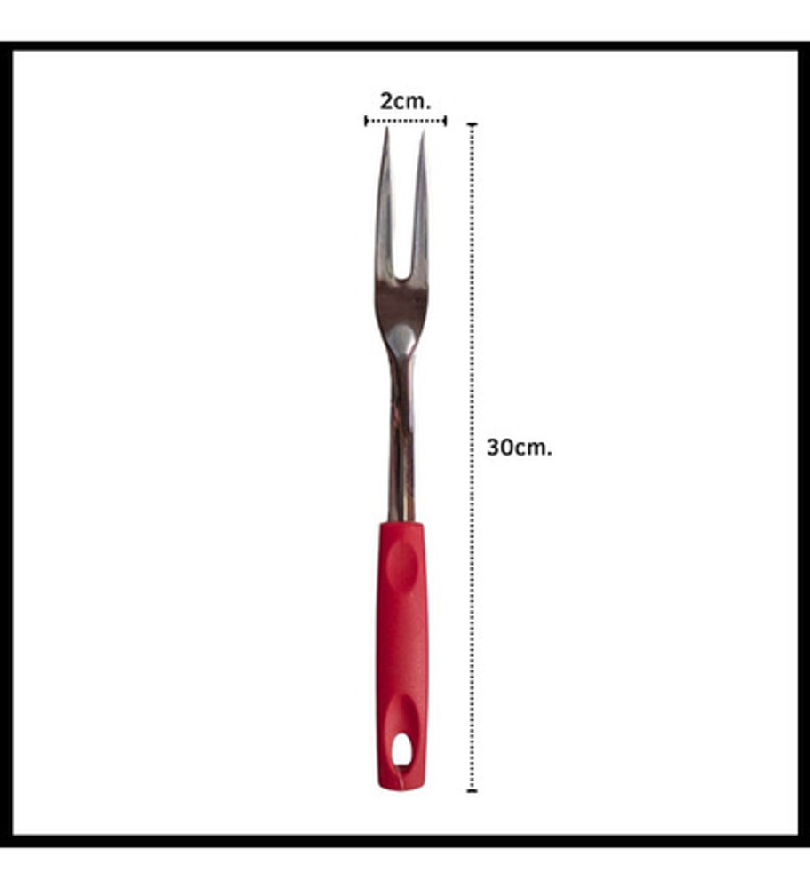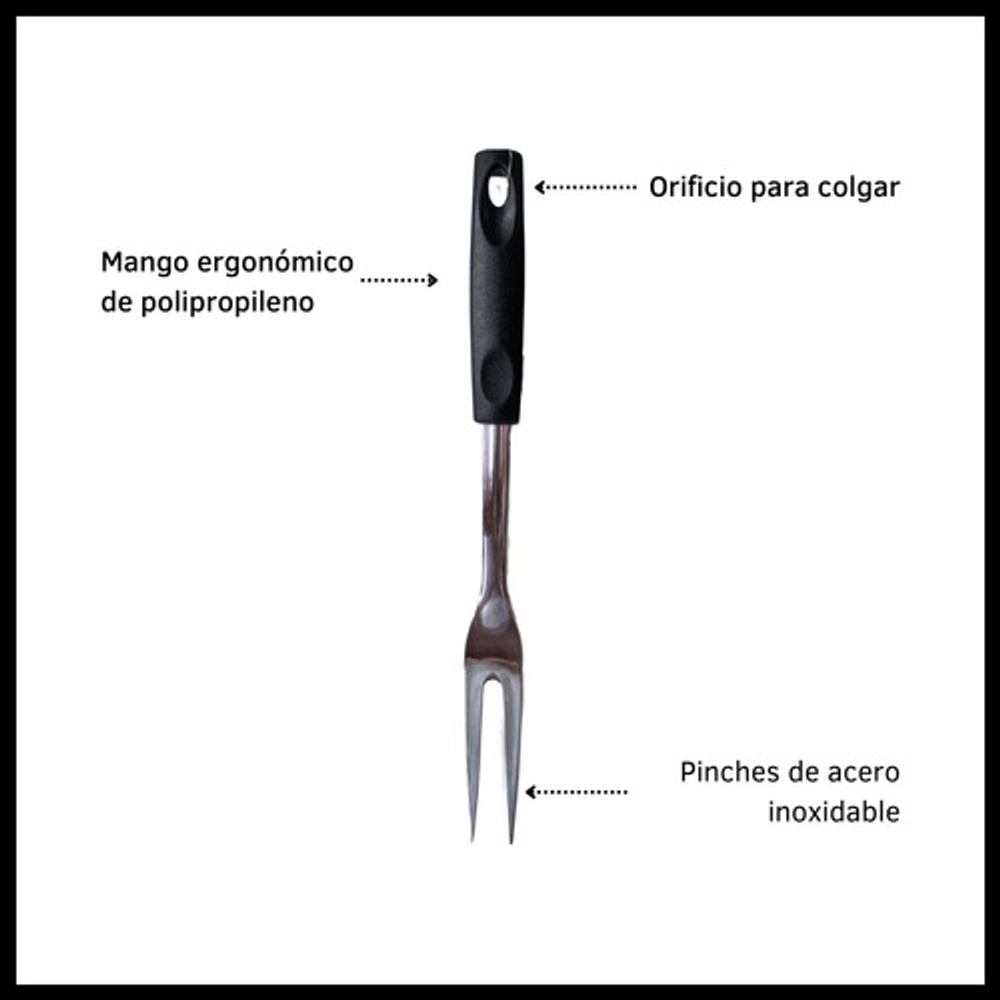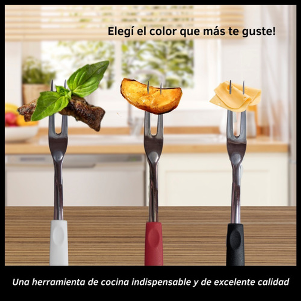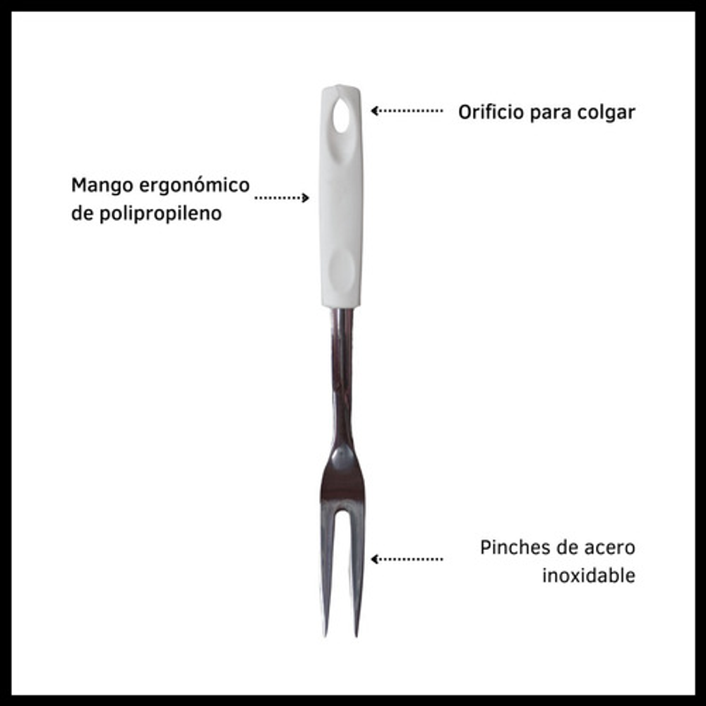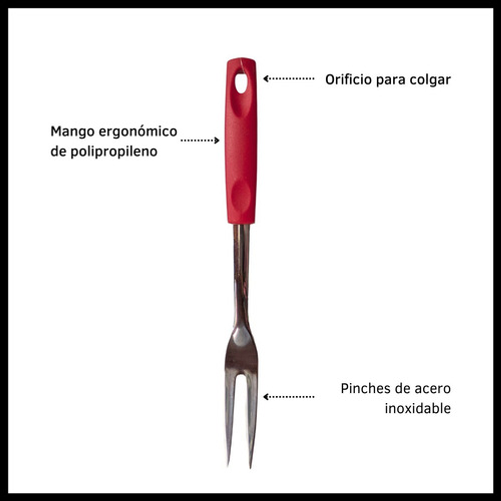 Caracteristicas: • Material del tenedor: acero inoxidable. • Material del mango: plástico PP. • Incluye orificio para colgar. • Se venden por unidad.