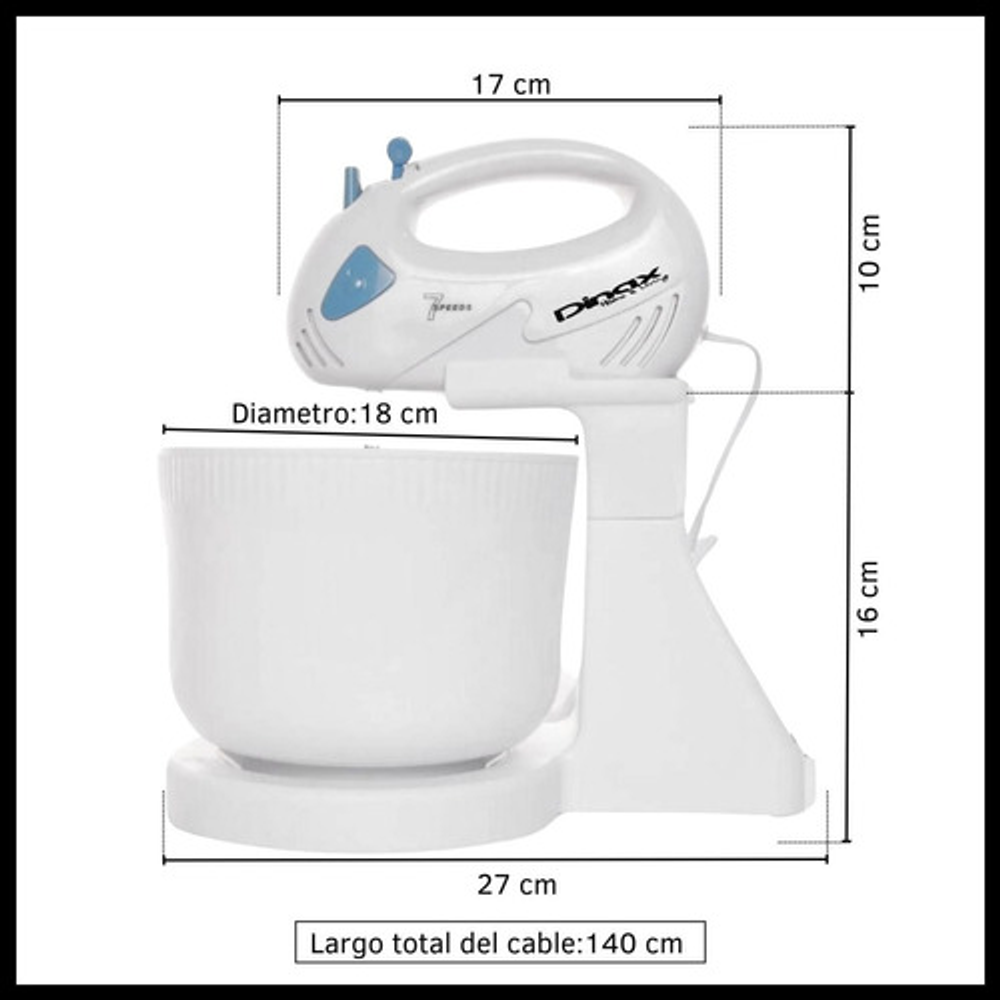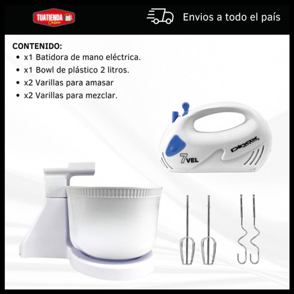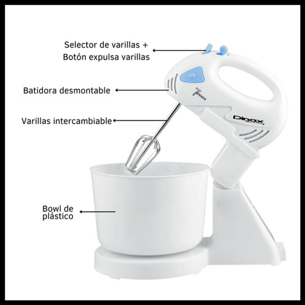 Incluye varillas intercambiables para batir y amasar.