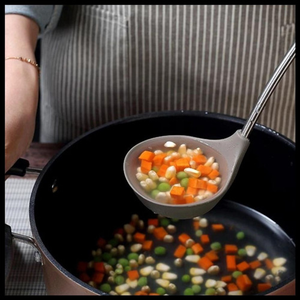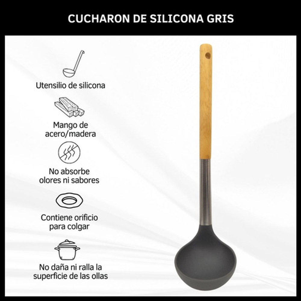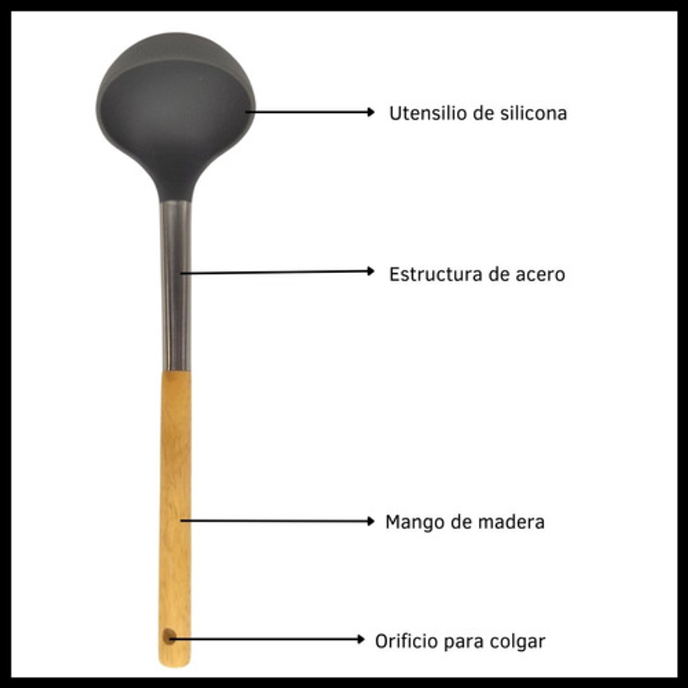 CARACTERISTICAS: -Utensilio de silicona -No absorbe olores ni sabores -Contiene orificio para colgar -No daña ni raya la superficie de las ollas -Mango de madera/acero