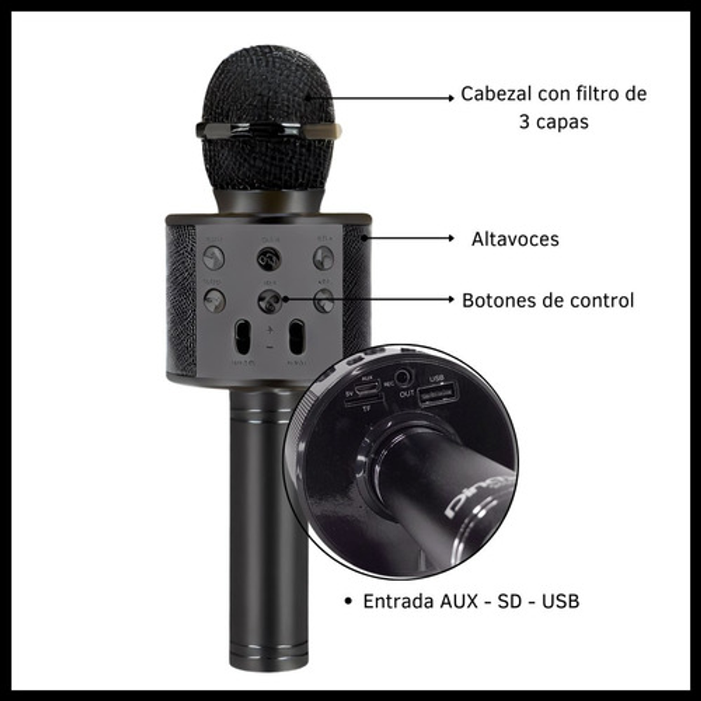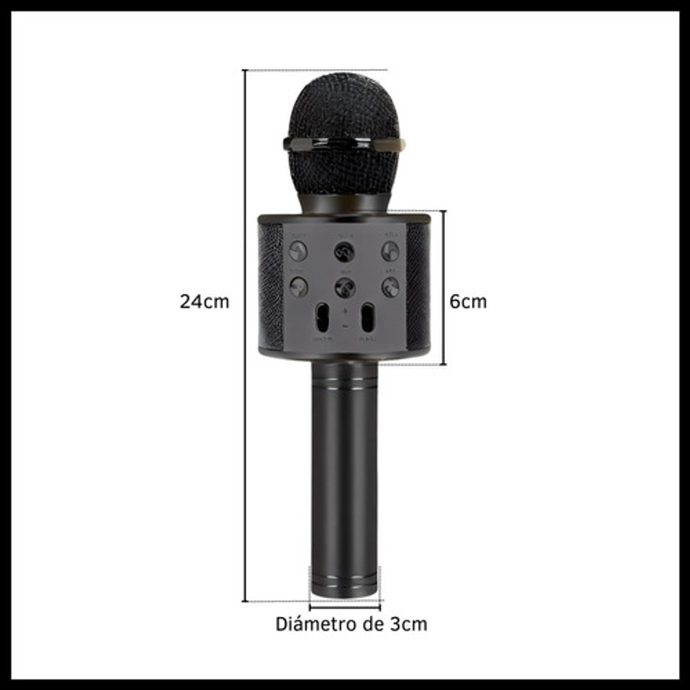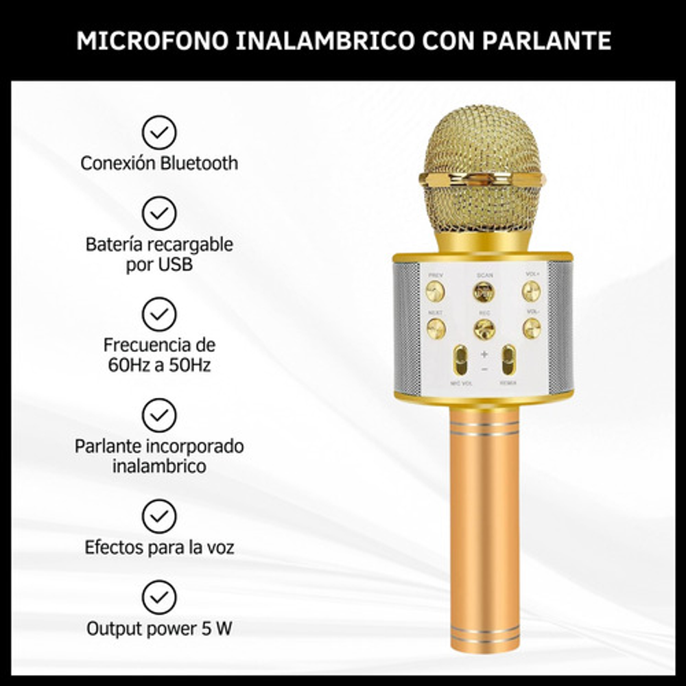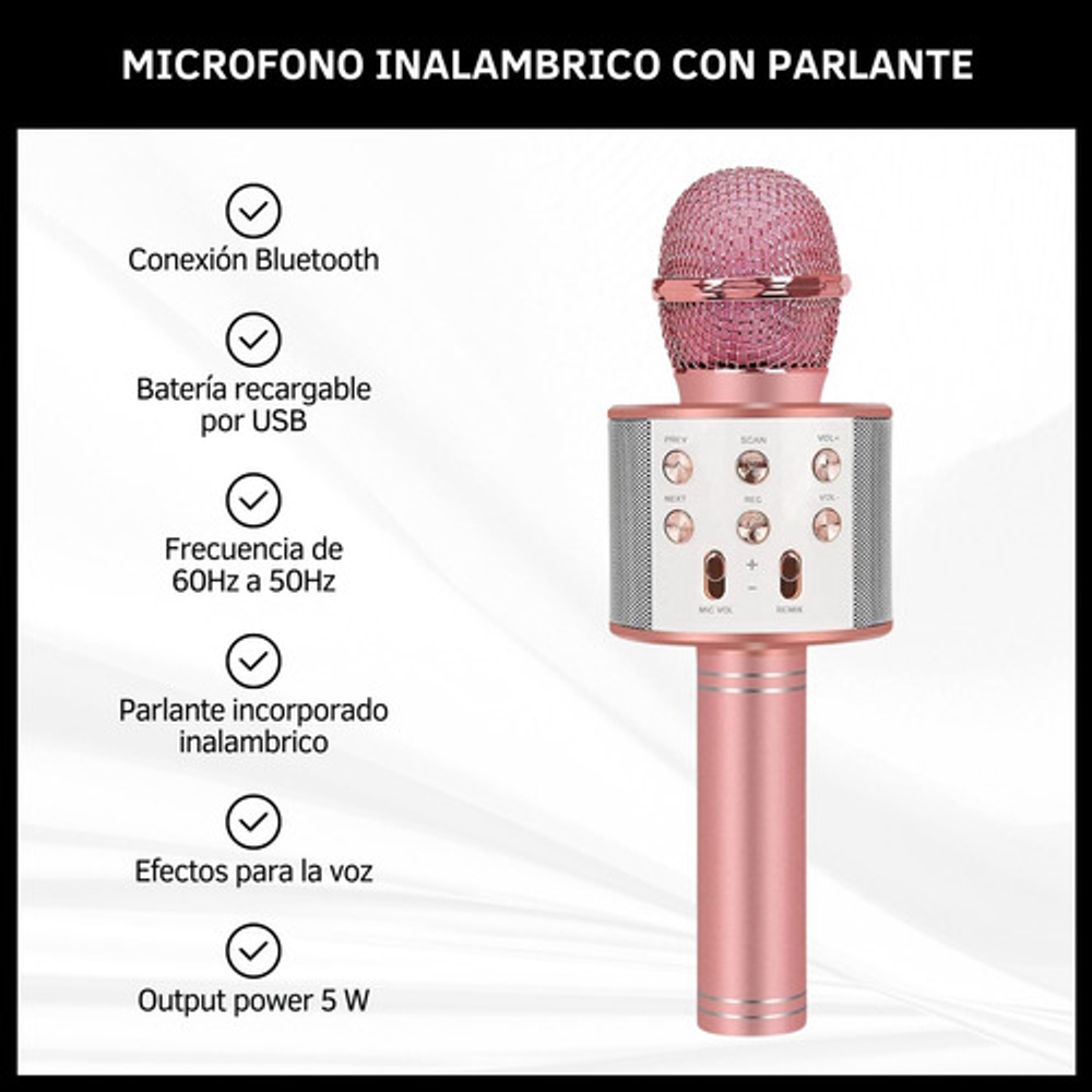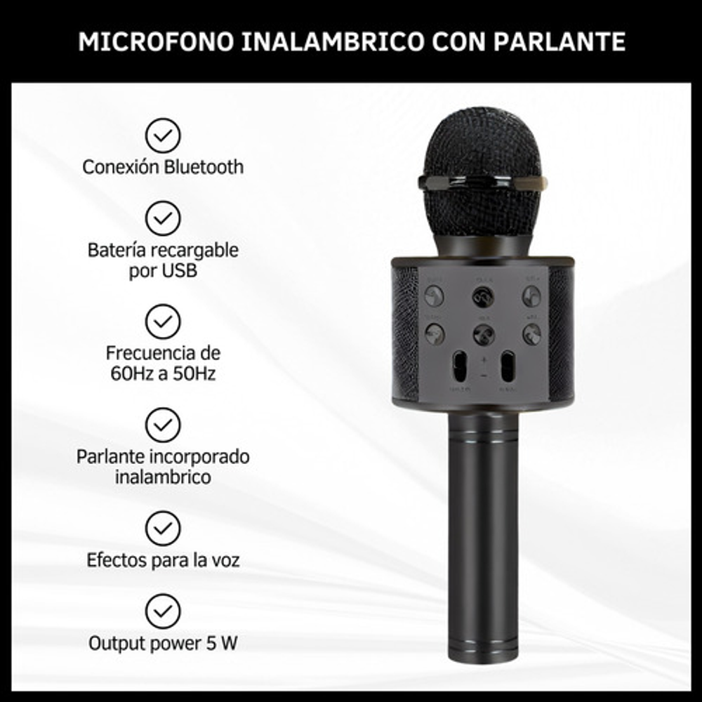 Características: -Conexión Bluetooth. -Batería recargable por USB. -Frecuencia de 60Hz a 50Hz. -Parlante incorporado inalámbrico. -Efectos para la voz. -Output power 5W.