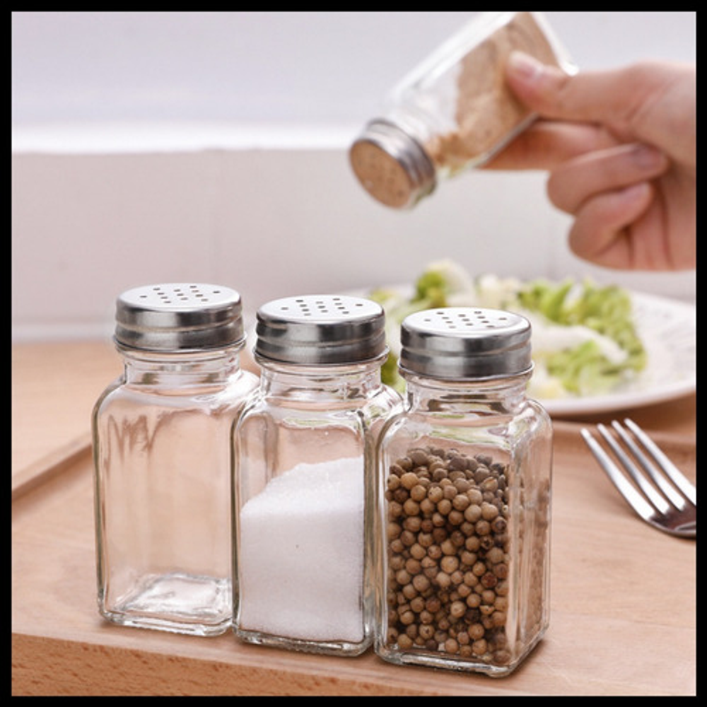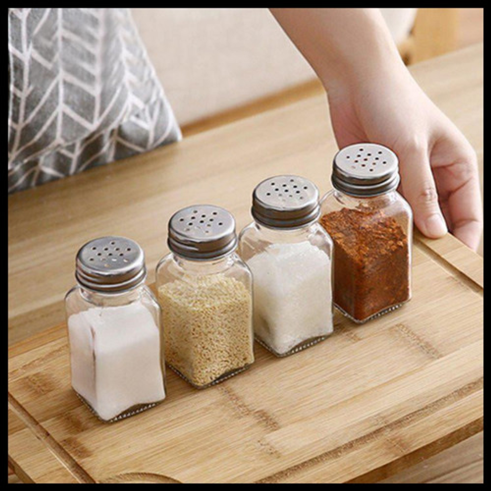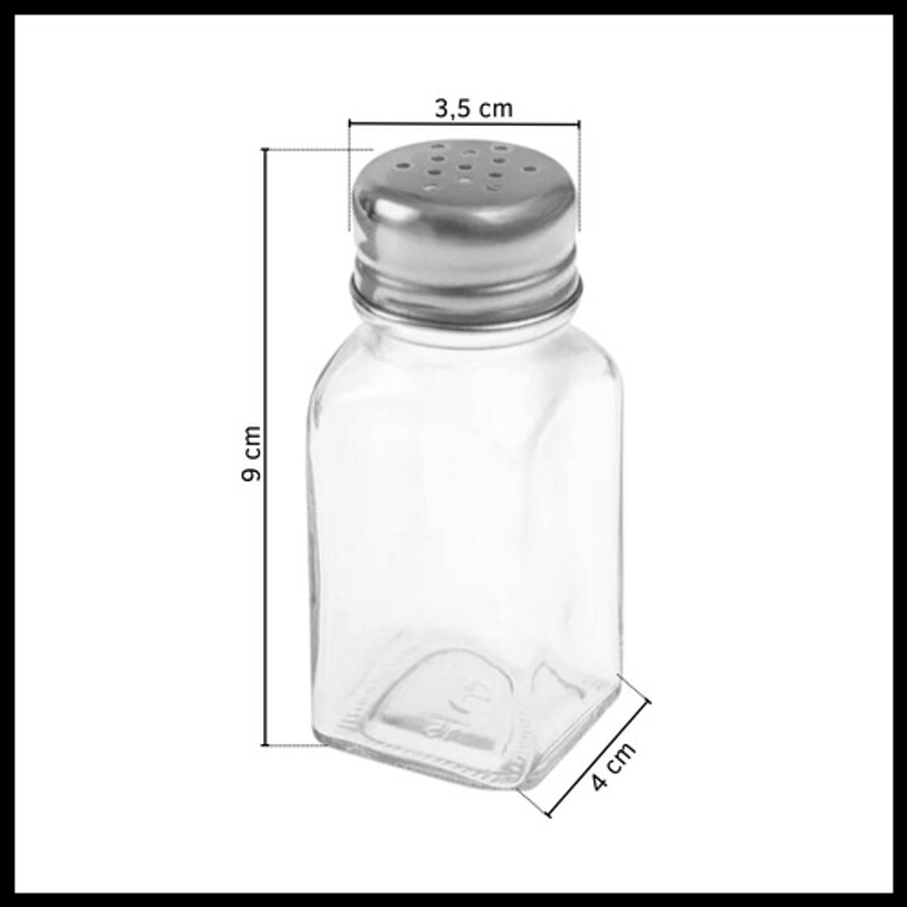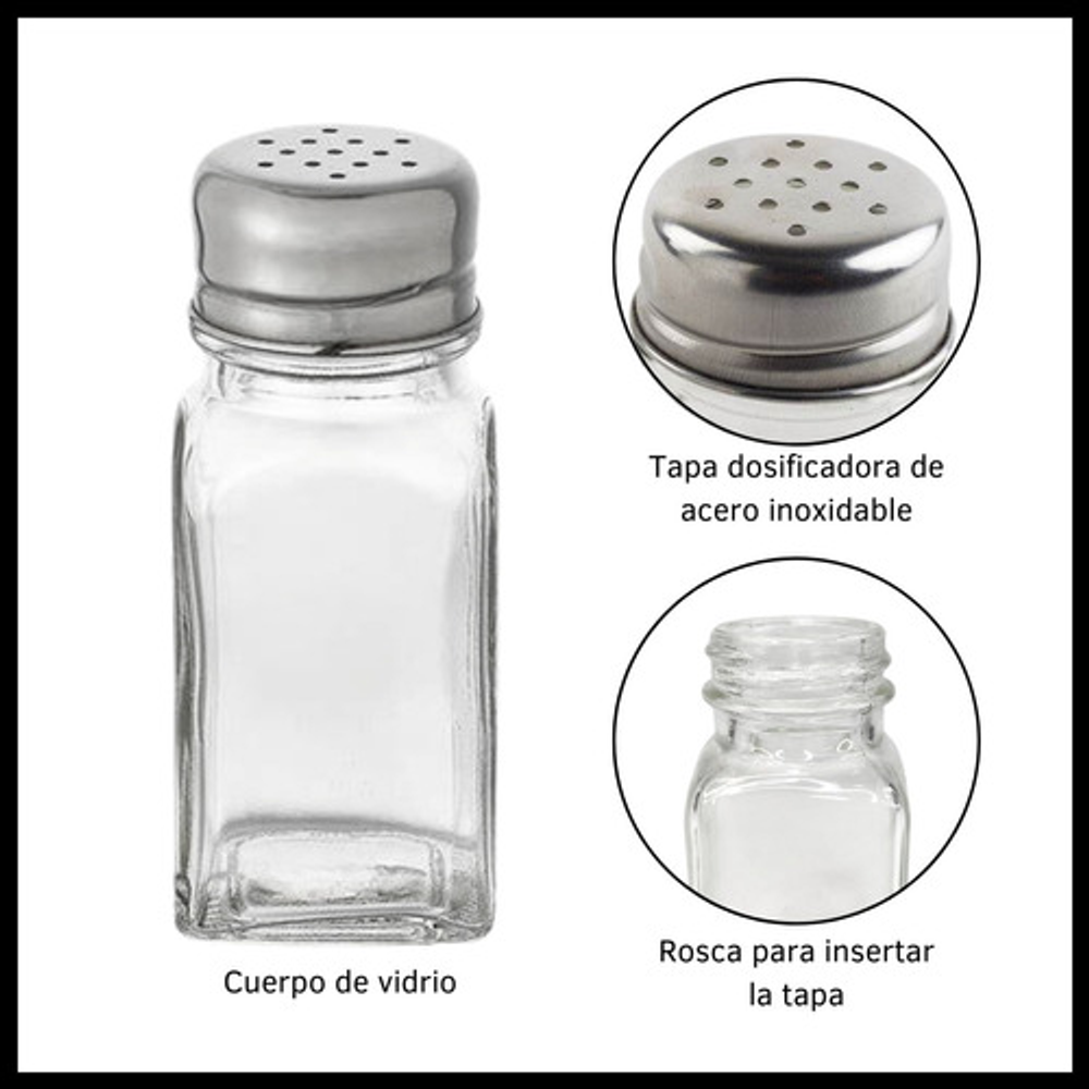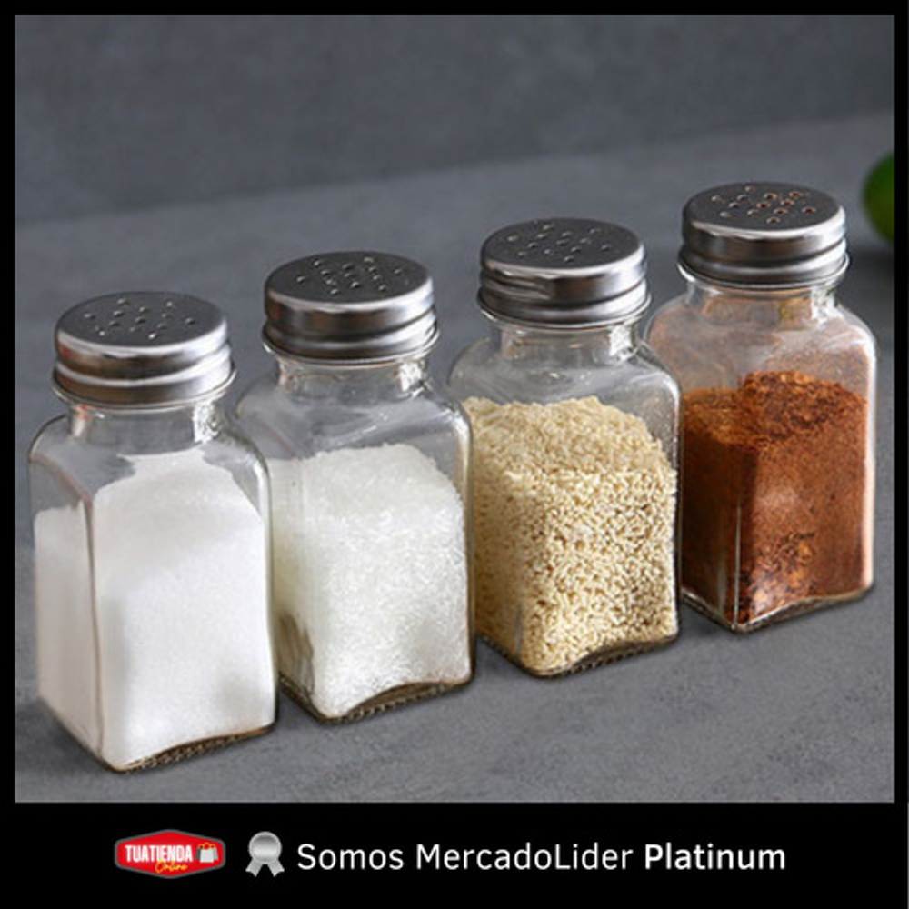 Características: -Permite ver el contenido para saber cuando recargarlos. -Materiales: vidrio y acero inoxidable. -Ideal para organizar condimentos. -Tapa a rosca dosificadora.