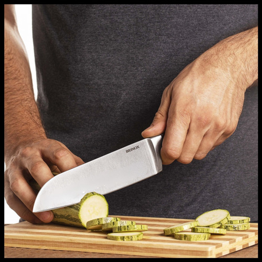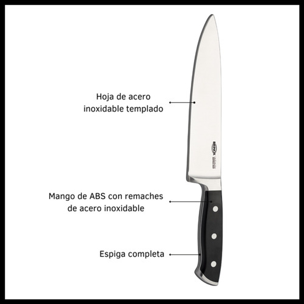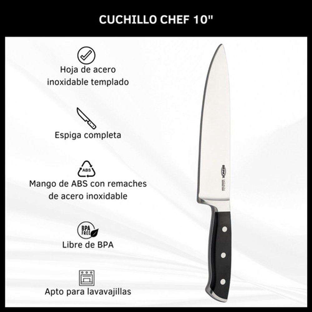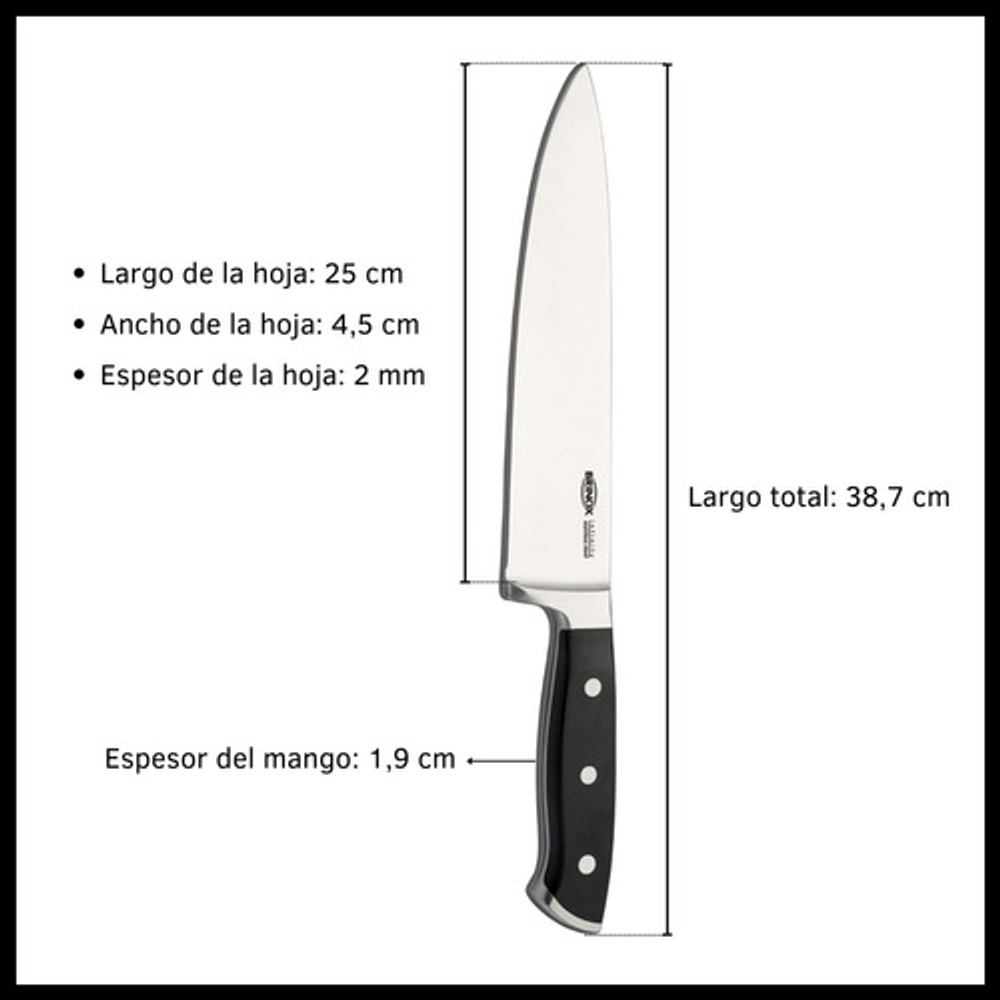 Caracteristicas: • La hoja del cuchillo tiene un espesor de 2 mm. • Hecha 100% de acero inoxidable templado. • Mango de plástico ABS, asegurado con remaches de acero inoxidable. • Espiga completa. • No absorbe olores ni sabores. • Apto para lavavajillas. • Libre de BPA.