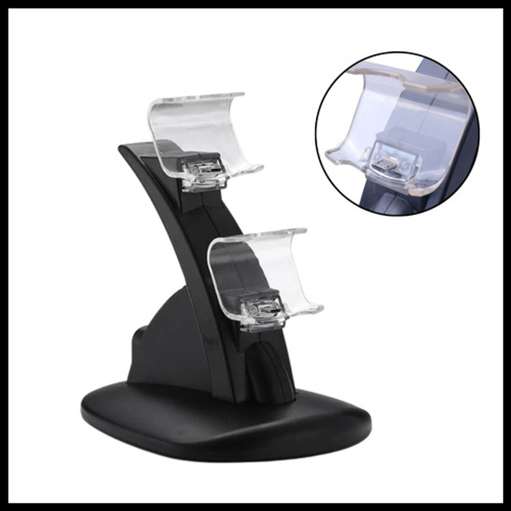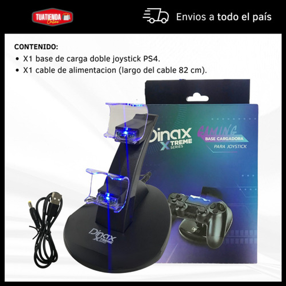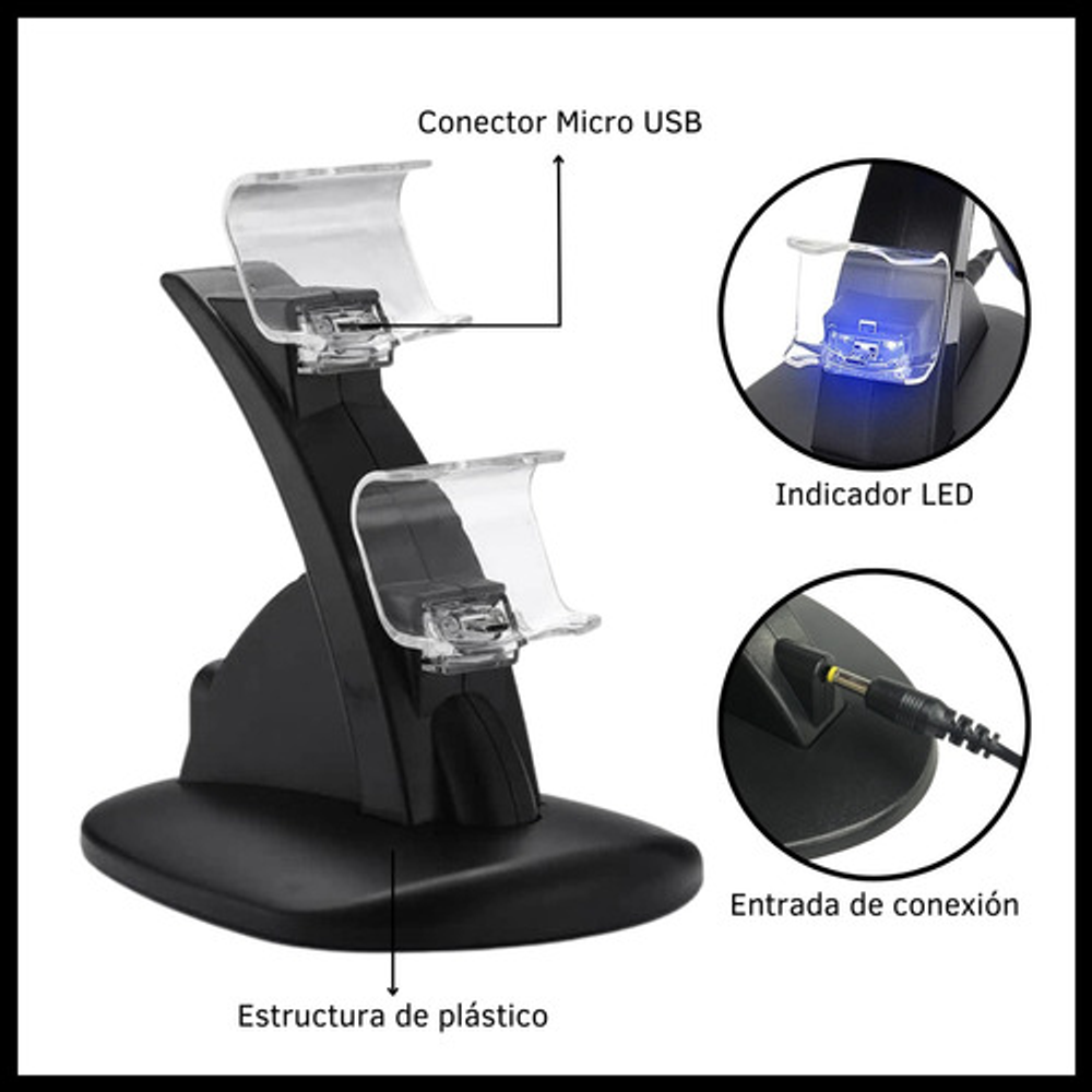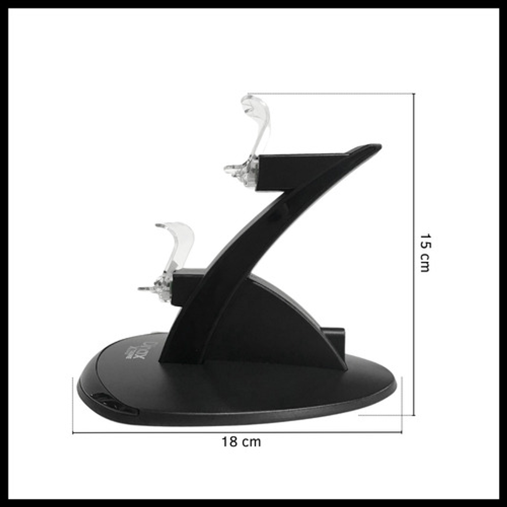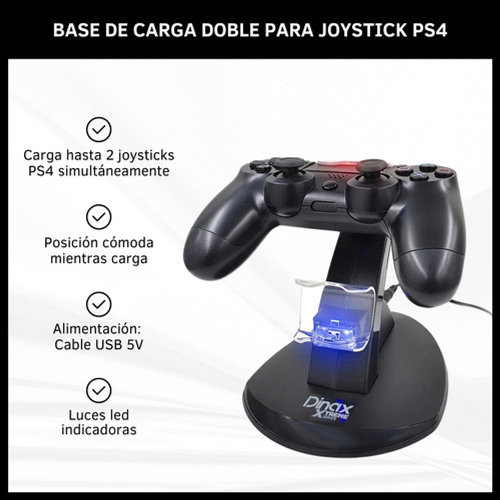 Características: • Doble puerto USB. • Se alimenta con cable USB (incluido). • Estructura de plástico. • Luces LED indicadoras. • Permite cargar hasta 2 joysticks a la vez.