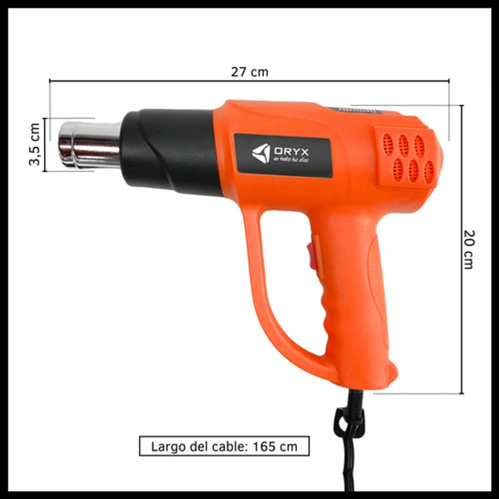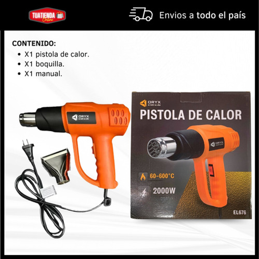 Características: • Peso 620gr. • Incluye boquilla. • Ajuste de calor variable • Dos velocidades de aire. • Temperatura mínima 60º • Temperatura máxima 600º • Potente motor de 2000 W. • Diseño ergonómico y liviano. • Protección de sobrecalentamiento.