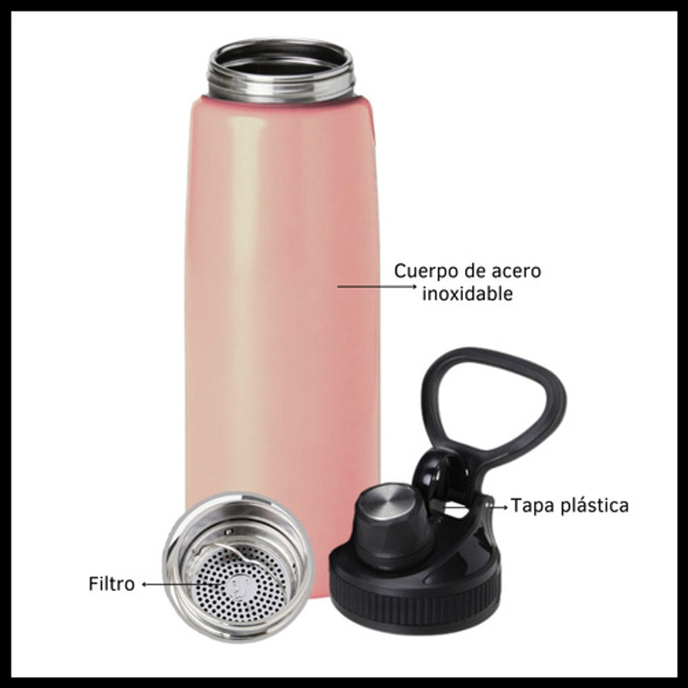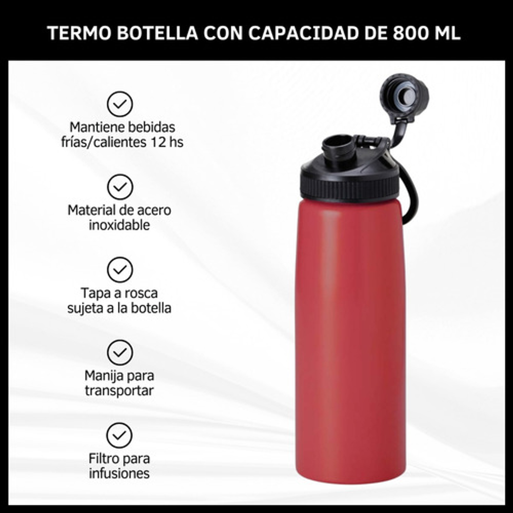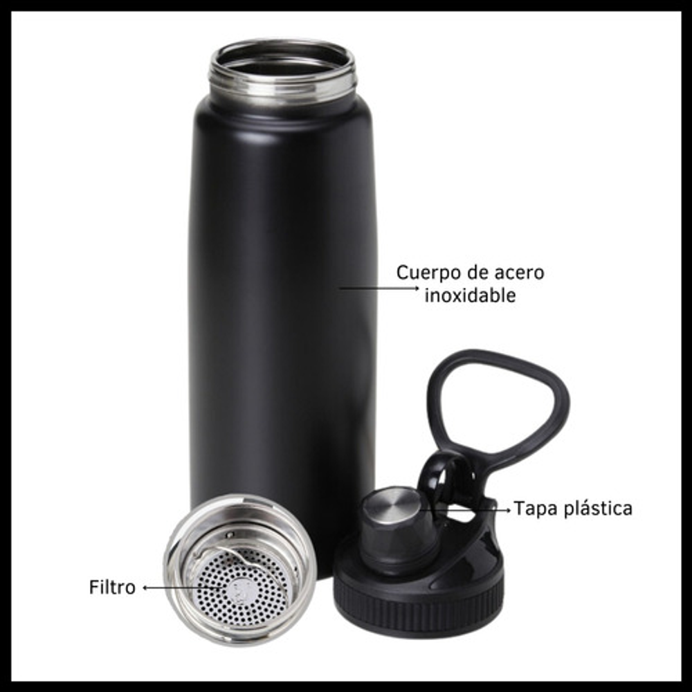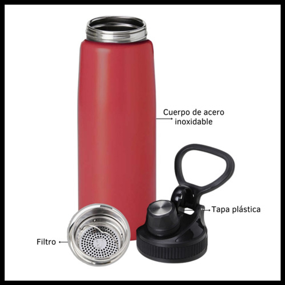 Características: • Capacidad de 800ml. • Filtro de infusiones. • Apta para bebidas frías y calientes. • Tapa anti derrames. • Fabricada en acero inoxidable. • Doble capa de aislamiento térmico. • Pico de plástico.