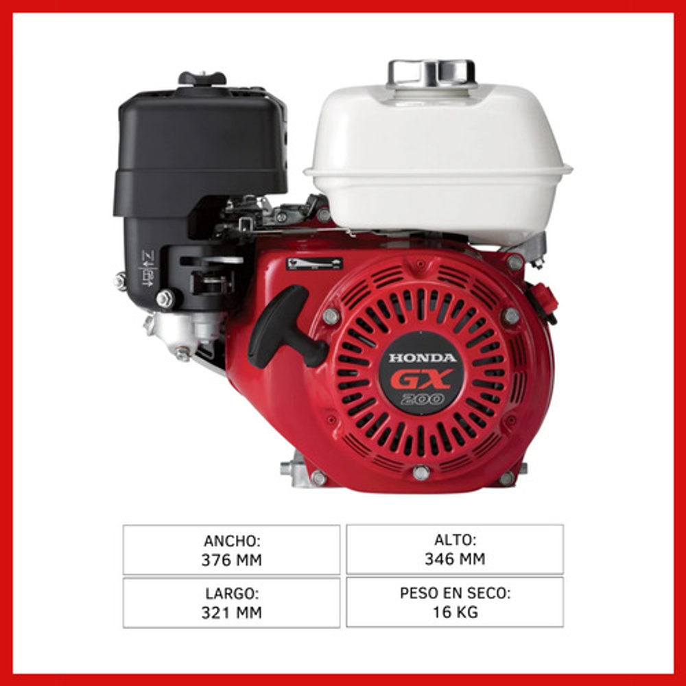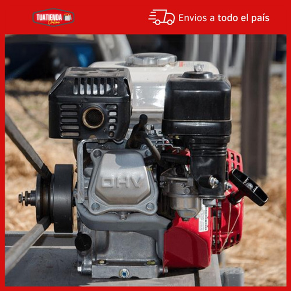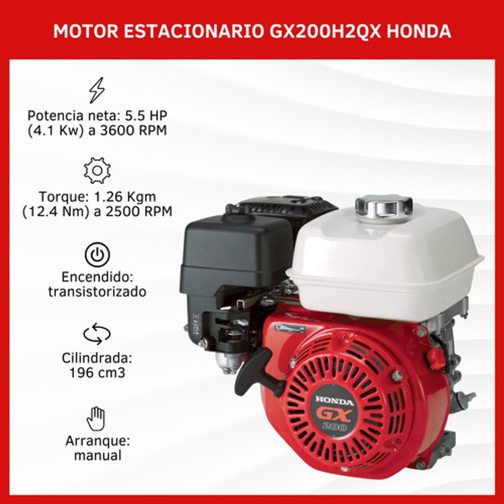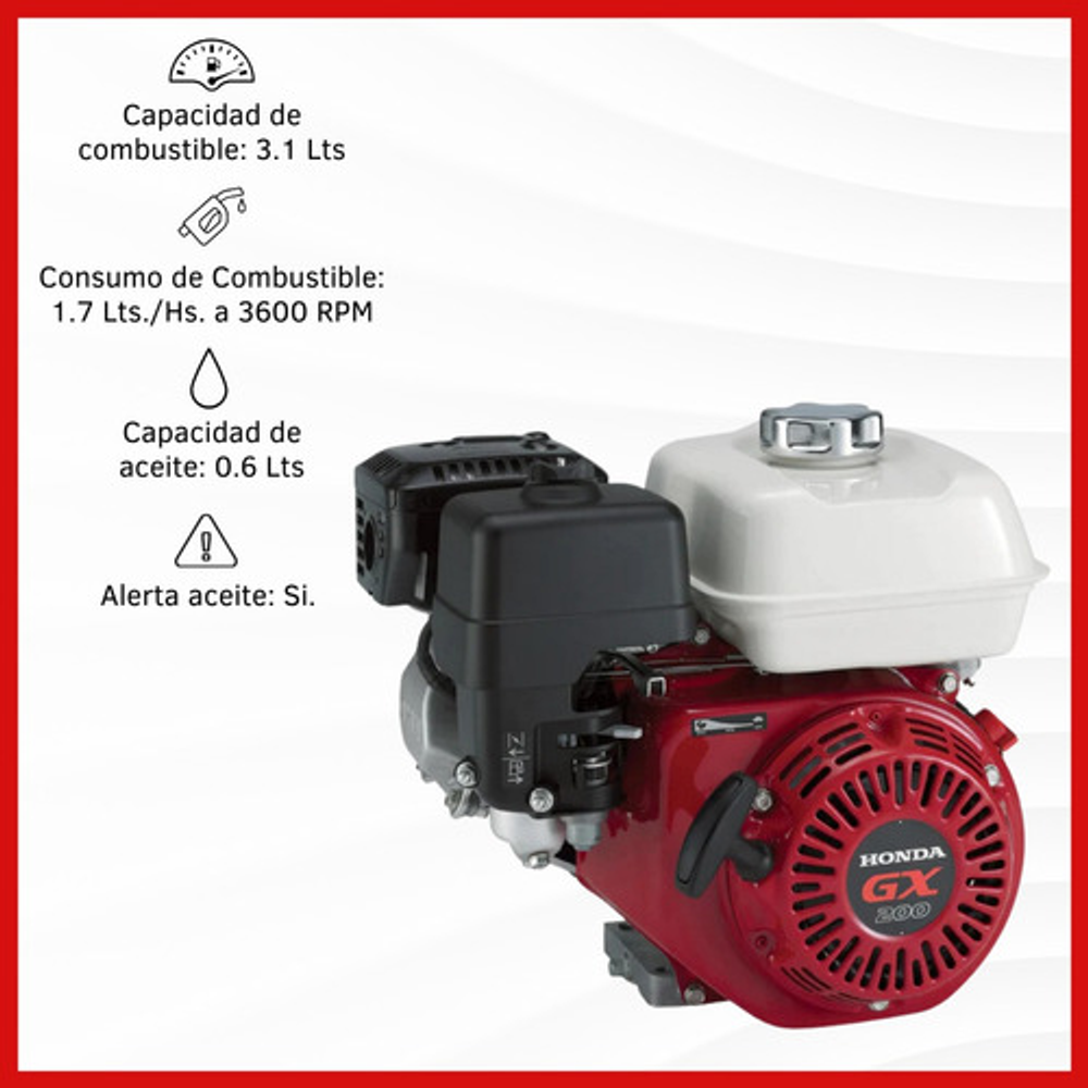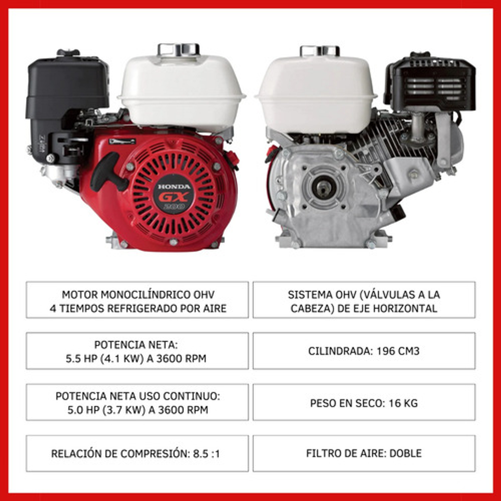 Características: -Tipo de Motor: Monocilíndrico OHV 4 Tiempos Refrigerado por aire. -Potencia Neta: 5.5 HP (4.1 Kw) a 3600 RPM. -Potencia Neta Uso Continuo: 5.0 HP (3.7 Kw) a 3600 RPM. -Torque: 1.26 Kgm (12.4 Nm) a 2500 RPM. -Cilindrada: 196 cm3. -Relación de Compresión: 8.5 : 1. -Encendido: Transistorizado. -Arranque:Manual. -Dimensiones. -Ancho: 376 mm. -Largo: 321 mm. -Alto: 346 mm. -Peso en Seco: 16 Kg. -Otras Especificaciones. -Capacidad de Combustible: 3.1 Lts. -Consumo Específico de Combustible: 1.7 Lts./Hs. a 3600 RPM. -Capacidad de Aceite: 0.6 Lts. -Filtro de Aire: Doble.
