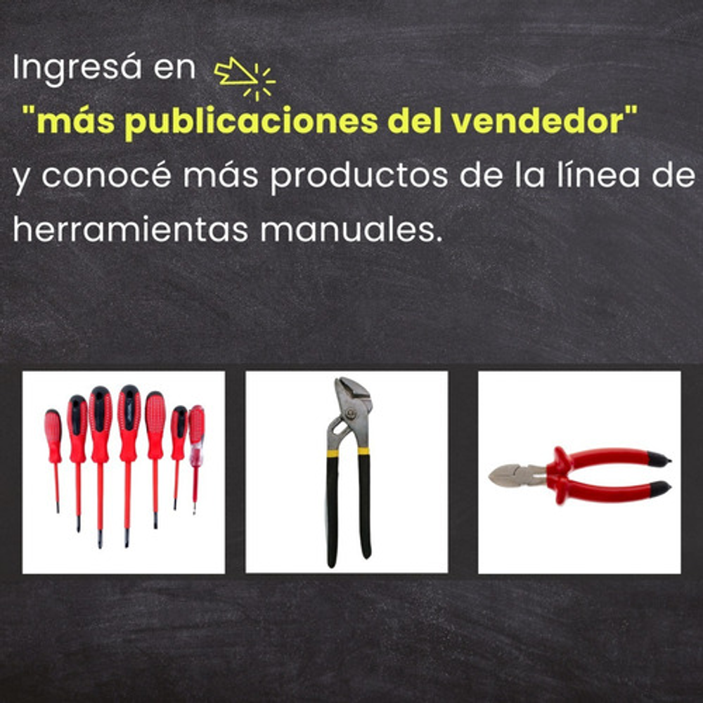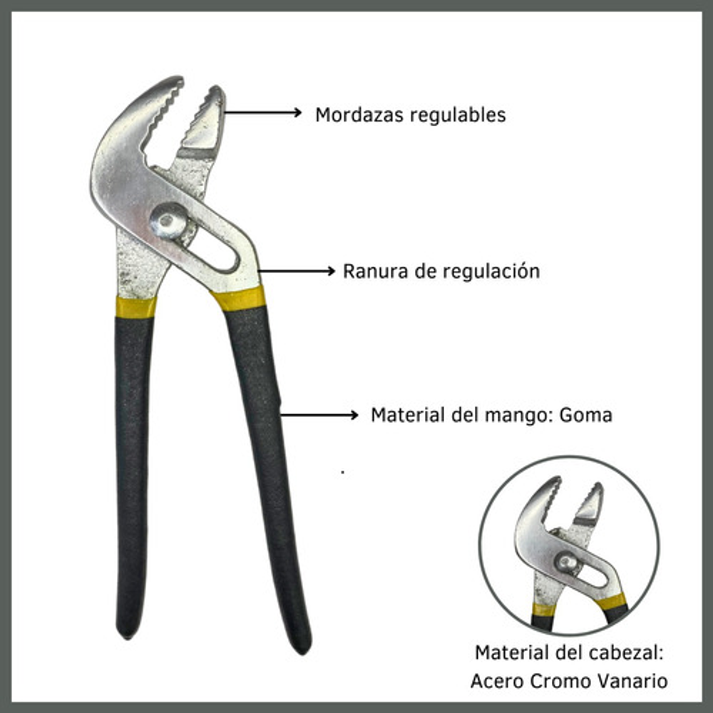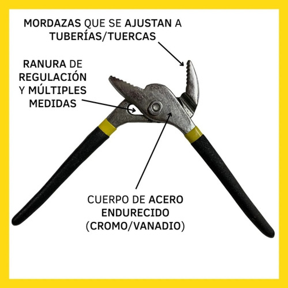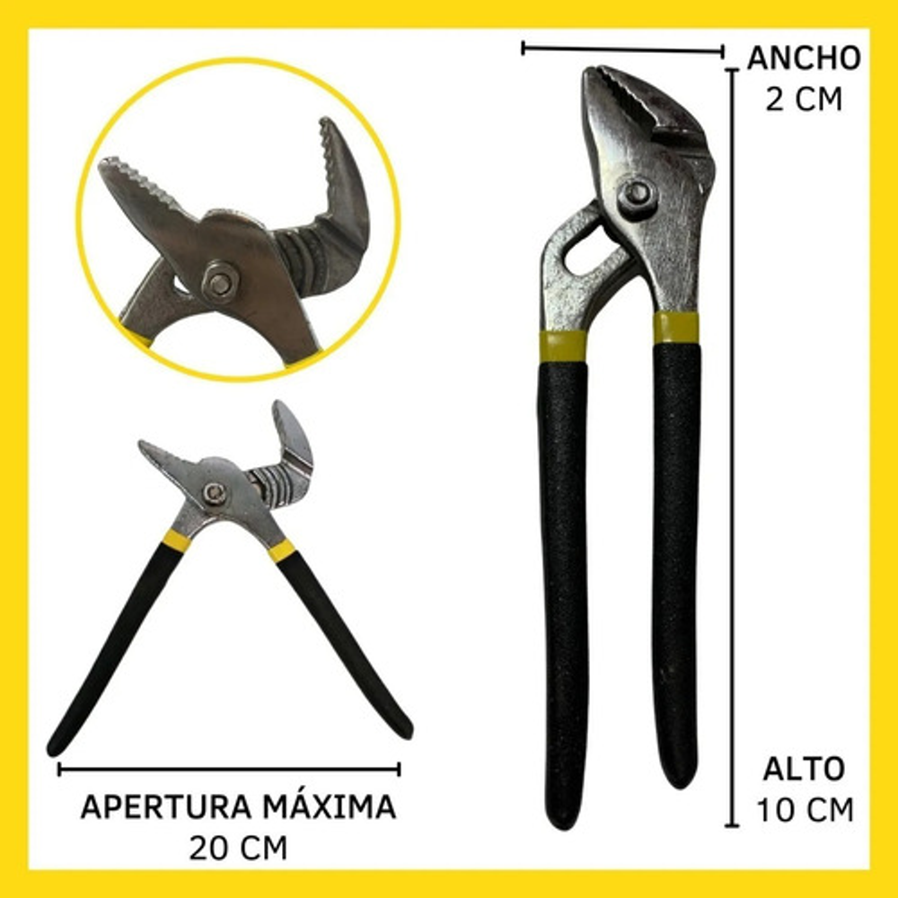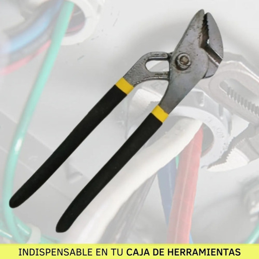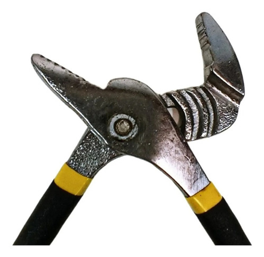 Esta pinza pico de loro es una herramienta manual esencial para sujetar y apretar objetos. Está compuesta por dos brazos metálicos reforzados en goma que se unen en un punto de pivote. Su diseño ajustable permite que las mandíbulas se abran en diferentes anchos, facilitando la adaptación a diferentes tamaños de objetos.