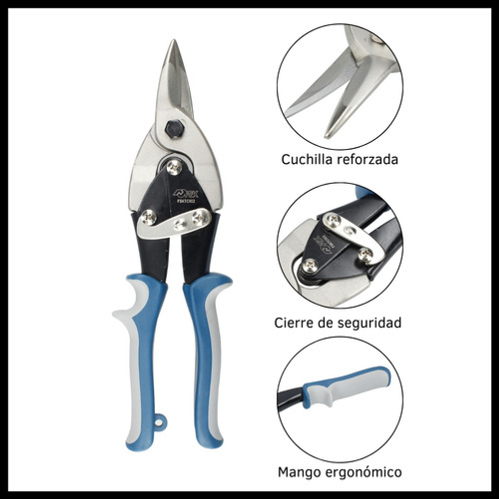 Caracteristicas: • Capacidad de corte: máximo de 1,25 mm de acero y 0,8 mm de acero inoxidable. • Cuchilla dentada y endurecida por templado. • Mango ergonómico y cómodo al agarre. • Aleación de acero de alta calidad. • Medida de la cuchilla: 50 mm. • Cierre de seguridad.