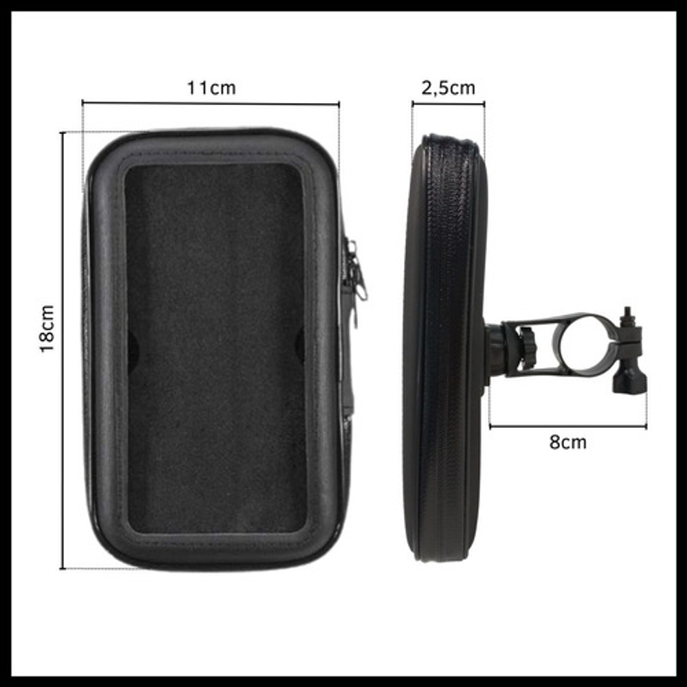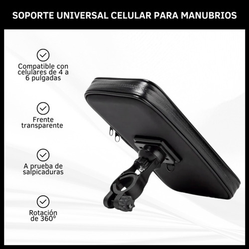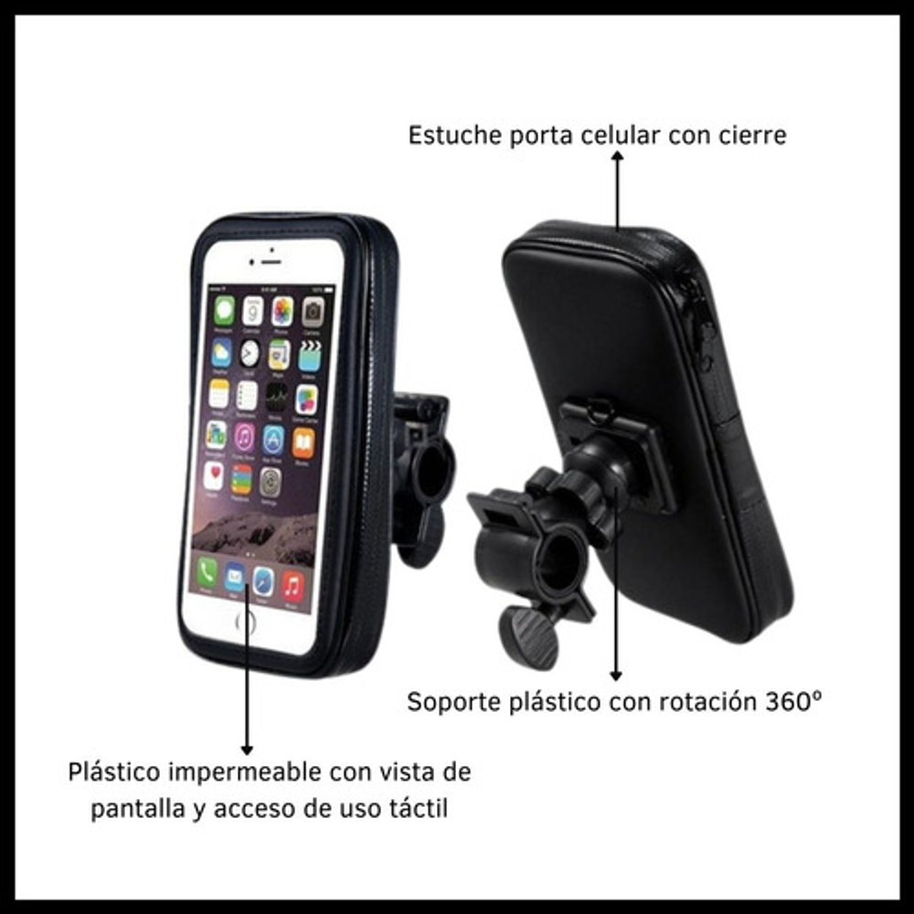Características: • Rotación de 360º para uso en modo vertical u horizontal. • Compatible con celulares de 4 a 6 pulgadas • Resistente al agua, ideal para cualquier condición climática. • Frente transparente • A prueba de salpicaduras