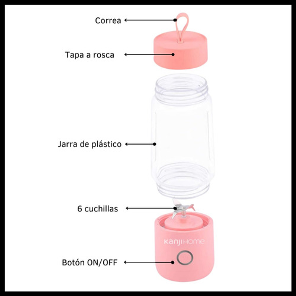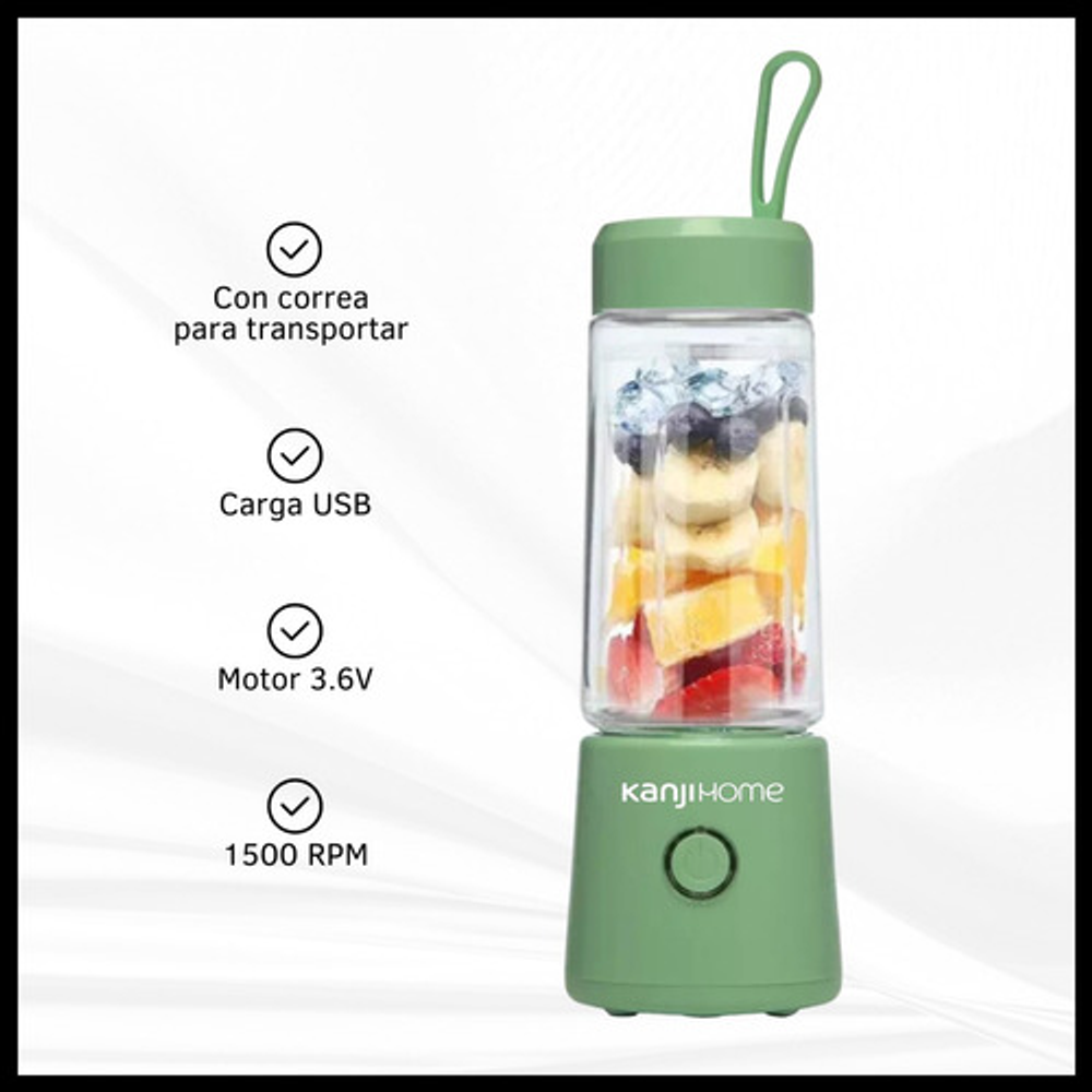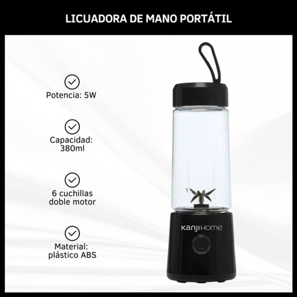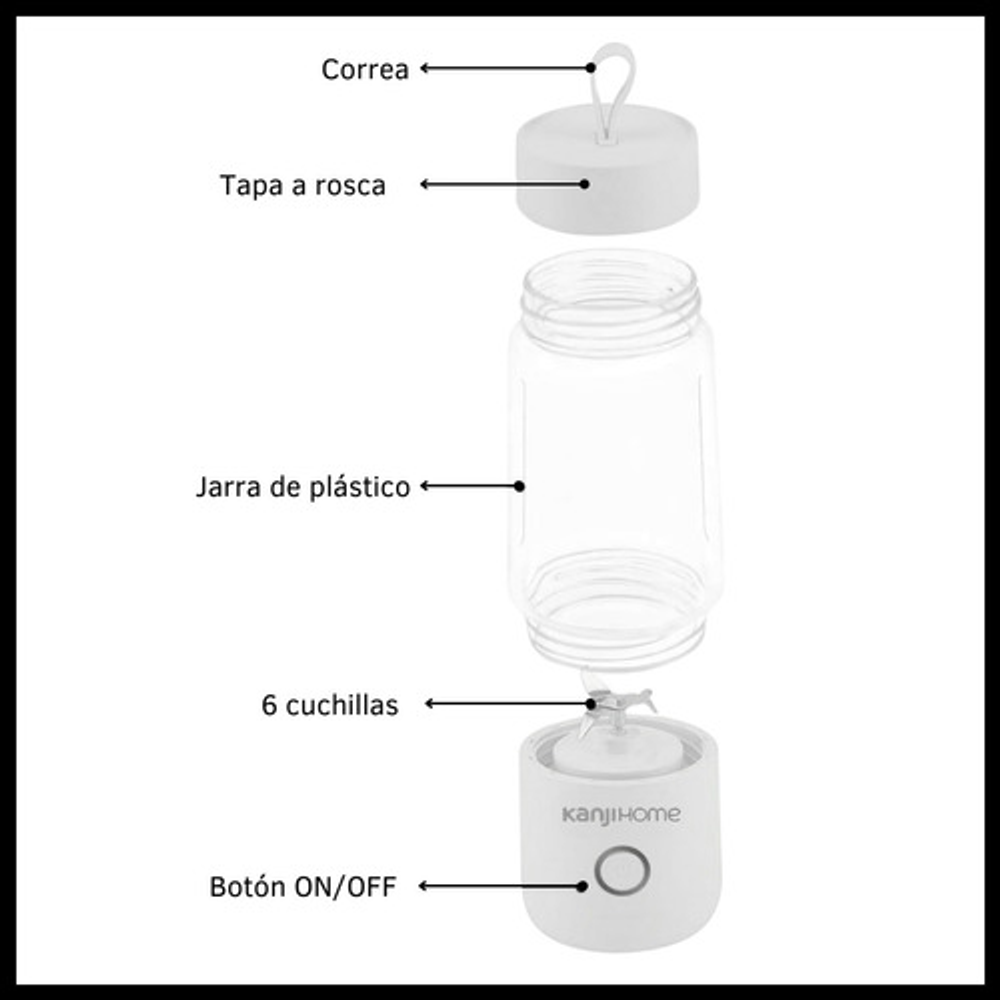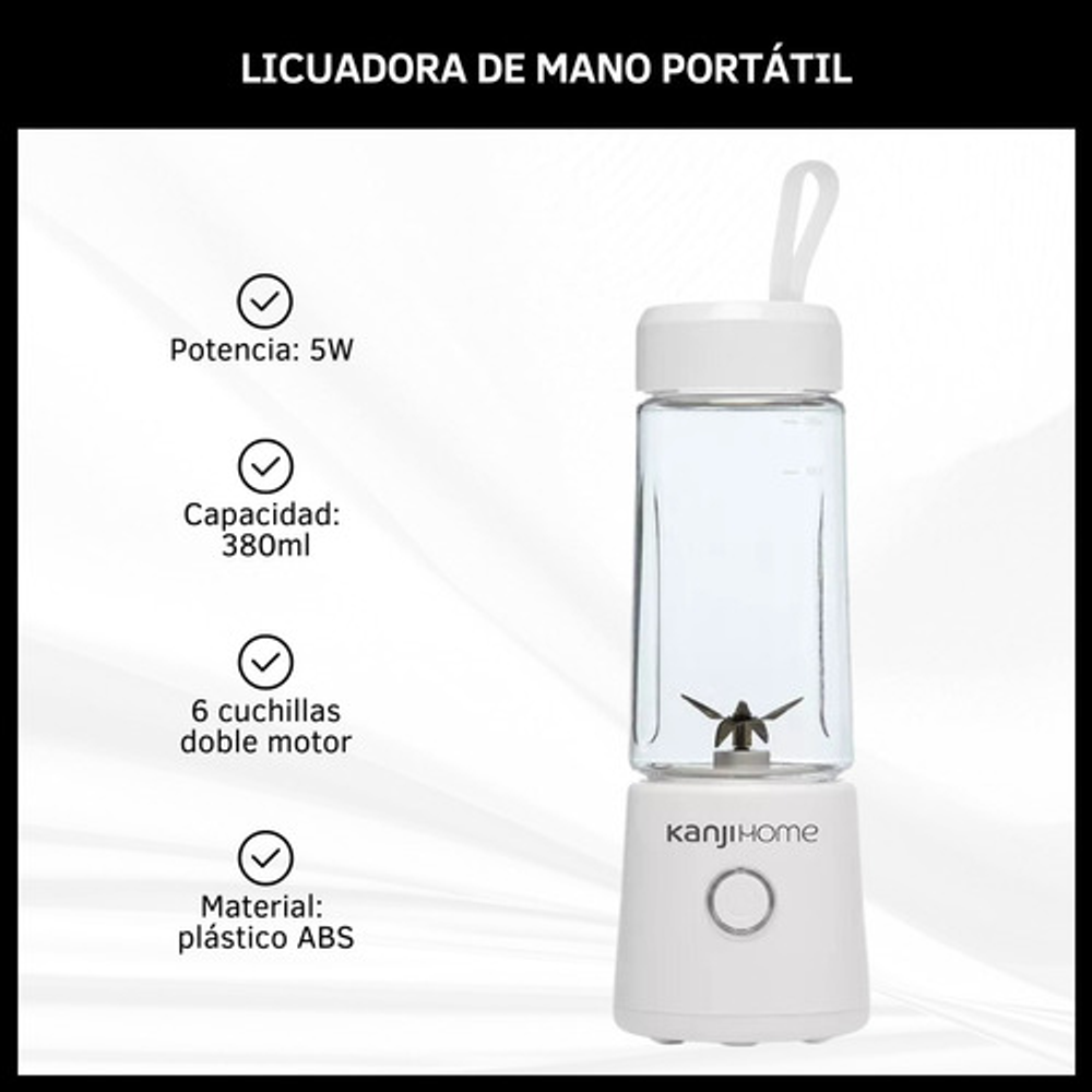 Características: -Se enciende presionando el botón por unos segundos. -Con correa de silicona para transportar. -Batería recargable vía USB (Cable incluido) -6 cuchillas doble motor. -Indicador de capacidad. -Material: plástico ABS. -Capacidad: 380ml. -Potencia: 5W. -1500 RPM. -Motor 3.6V.