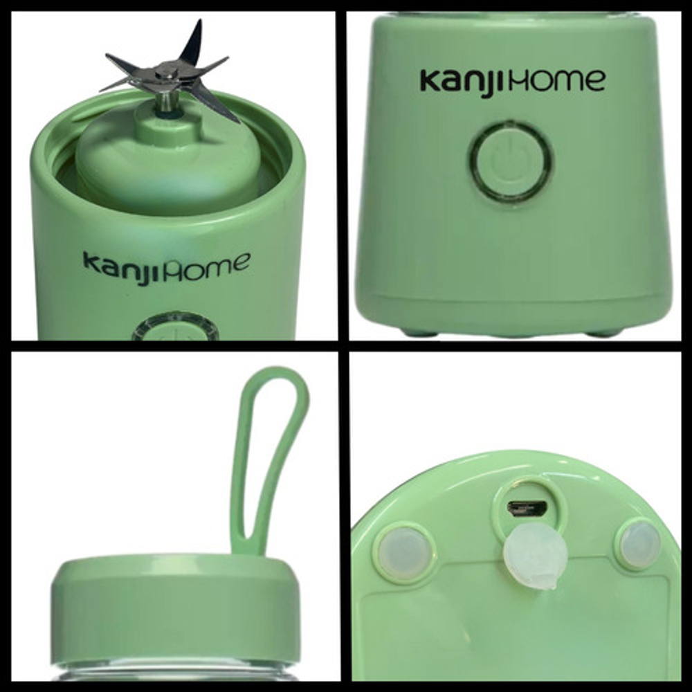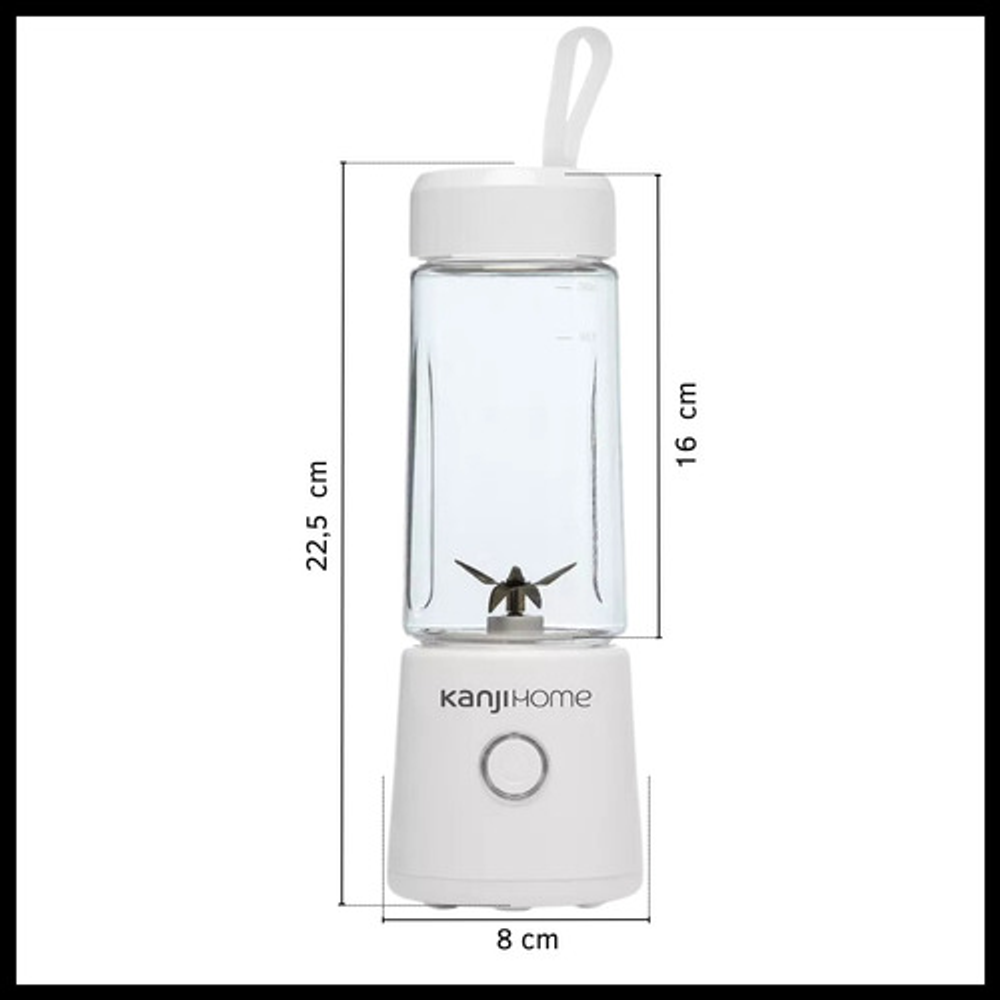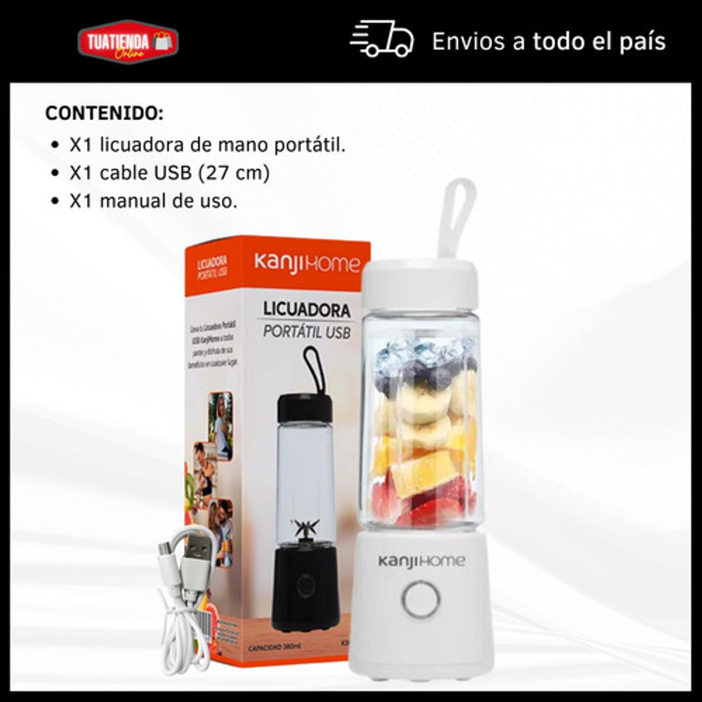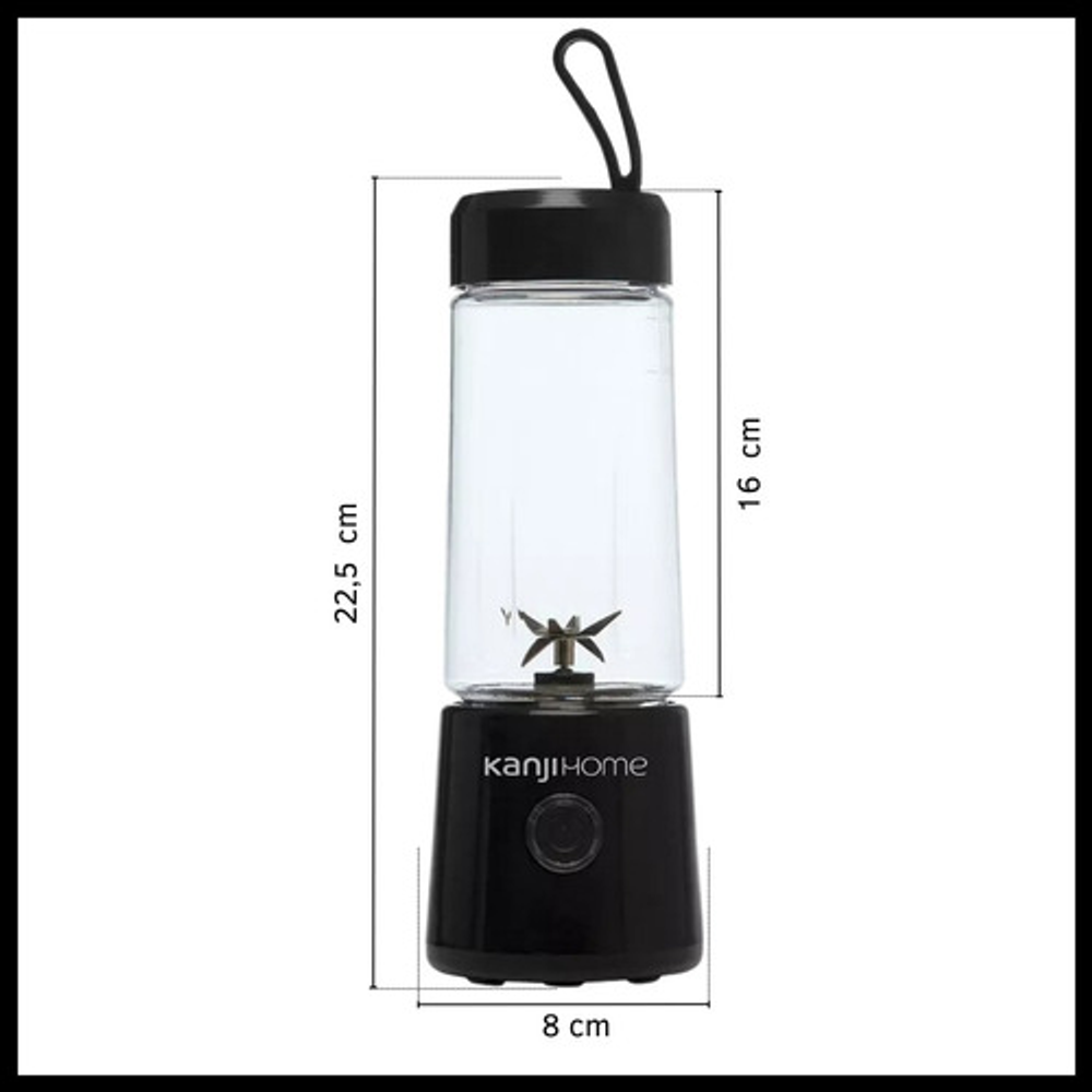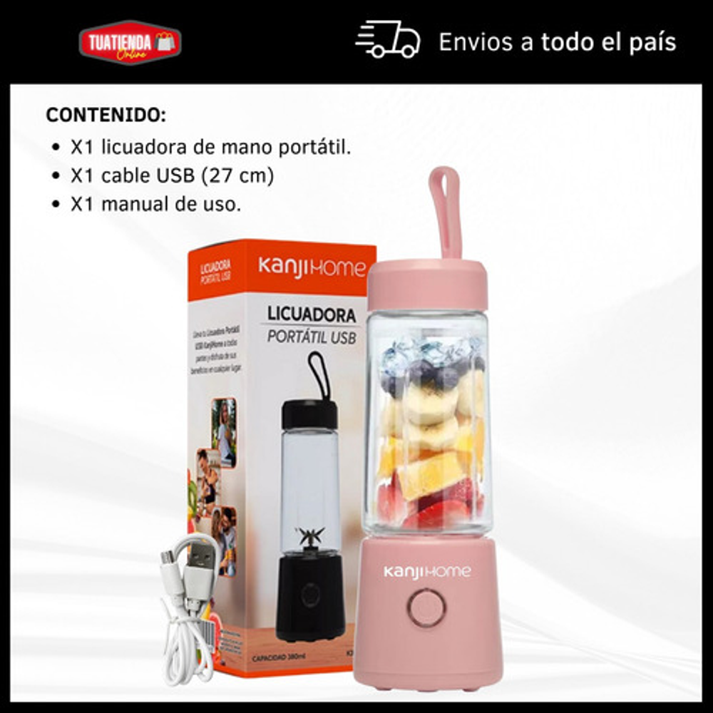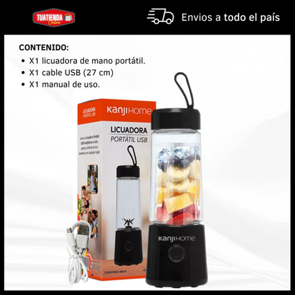 Características: -Se enciende presionando el botón por unos segundos. -Con correa de silicona para transportar. -Batería recargable vía USB (Cable incluido) -6 cuchillas doble motor. -Indicador de capacidad. -Material: plástico ABS. -Capacidad: 380ml. -Potencia: 5W. -1500 RPM. -Motor 3.6V.