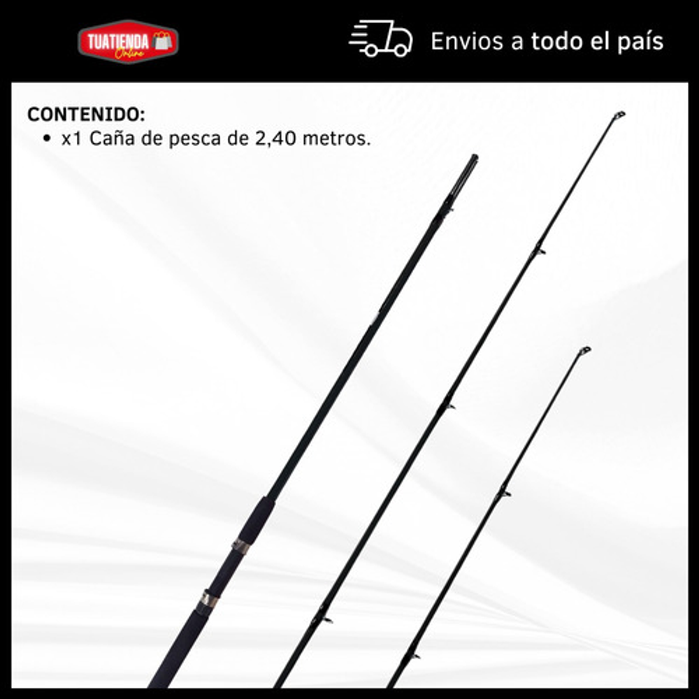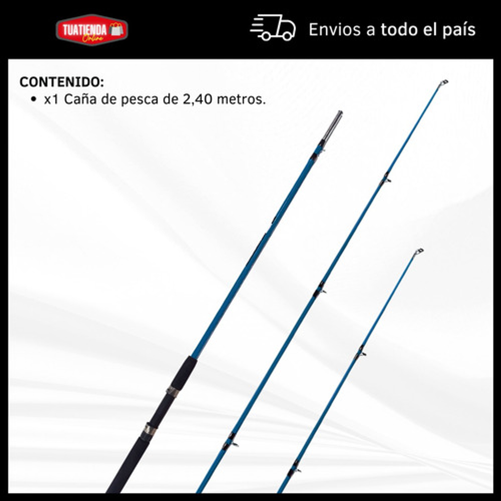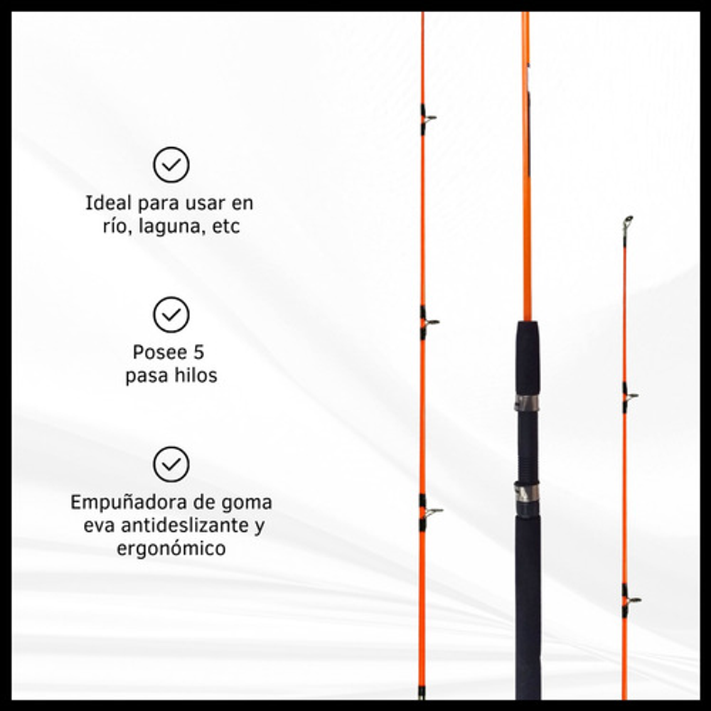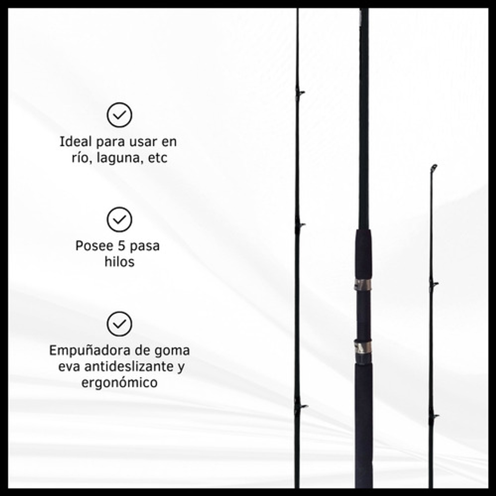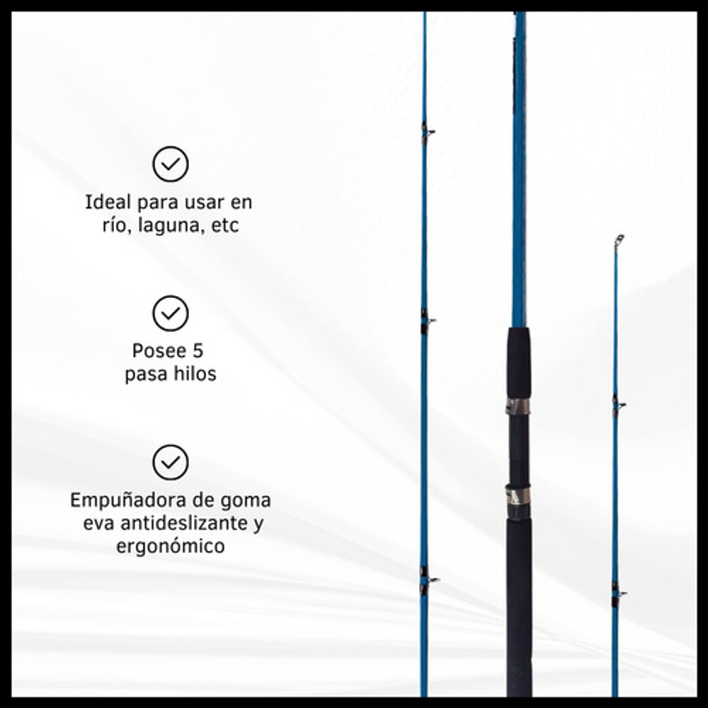 Características: • Contiene 5 pasa hilos de cerámica • Fabricada con fibra de vidrio maciza, ofreciendo un equilibrio perfecto entre resistencia y sensibilidad para la pesca • Porta Reel a rosca • Empuñadura antideslizante • Largo total: 240 mts • Tipo de caña de pescar: 2 Tramos lo que facilita el transporte y almacenamiento