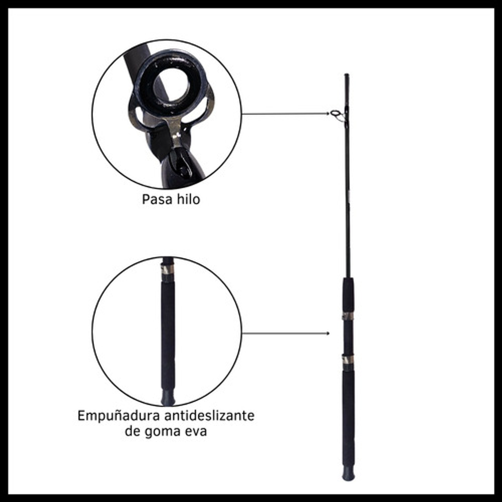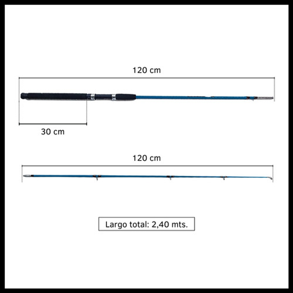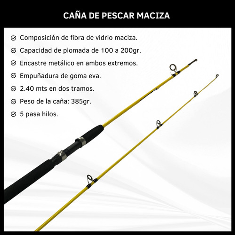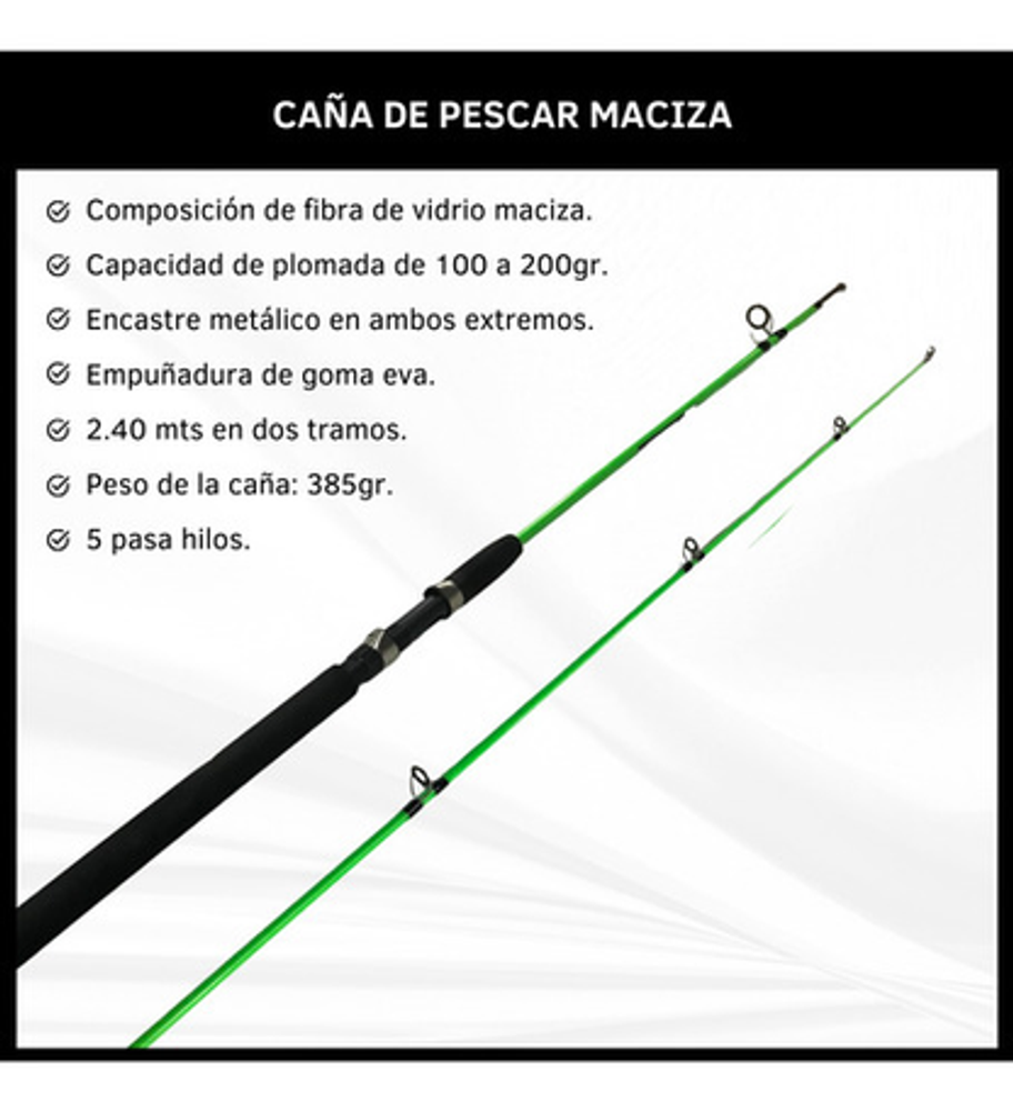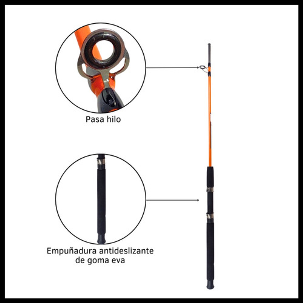 Características: • Contiene 5 pasa hilos de cerámica • Fabricada con fibra de vidrio maciza, ofreciendo un equilibrio perfecto entre resistencia y sensibilidad para la pesca • Porta Reel a rosca • Empuñadura antideslizante • Largo total: 240 mts • Tipo de caña de pescar: 2 Tramos lo que facilita el transporte y almacenamiento