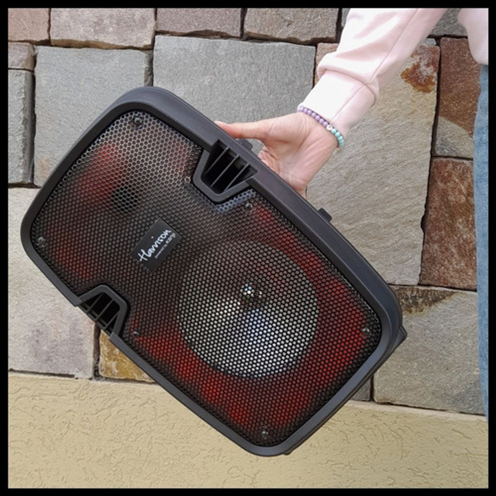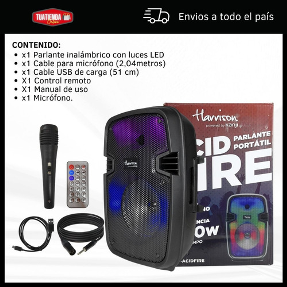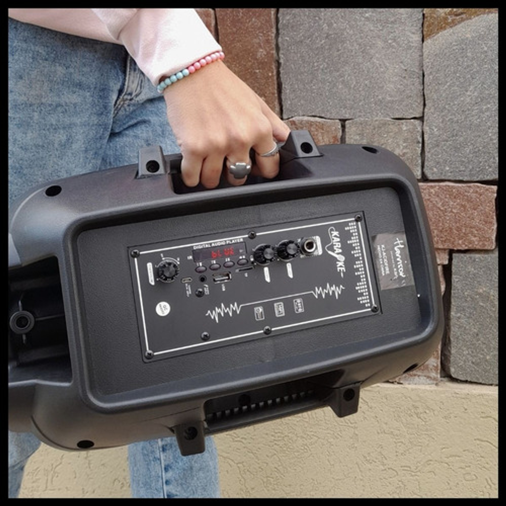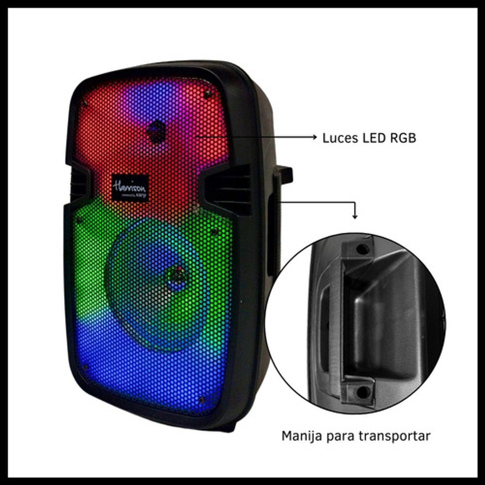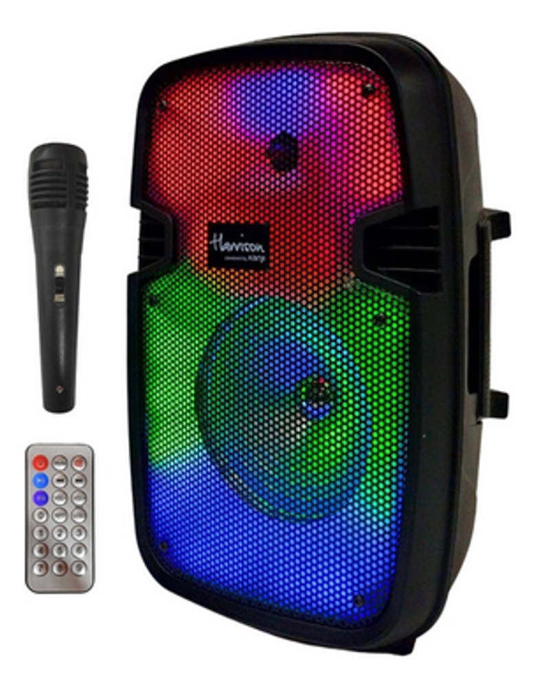Características: -Batería interna recargable. -Incluye luces LED RGB. -Entrada USB/SD/AUX. -Potencia: 800W. -Incluye micrófono y control remoto.