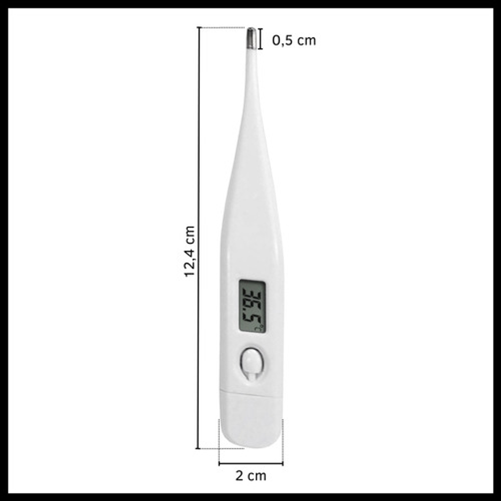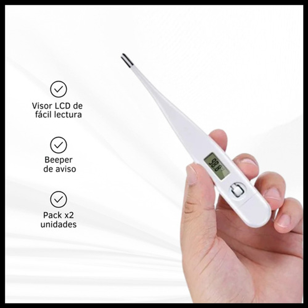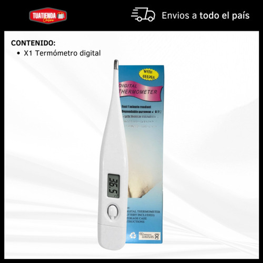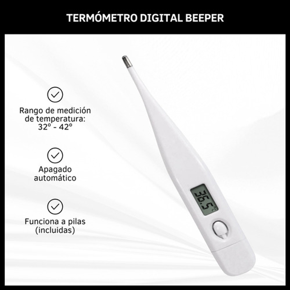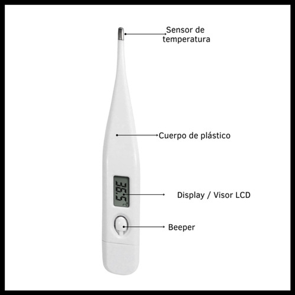 Características: • Con beeper que avisa cuando ya midió la temperatura. • Pilas Incluidas. • Con pantalla LCD. • Rango de medición de temperatura 32°C - 42°C. • Su tamaño compacto hace que sea mucho más fácil de transportar.