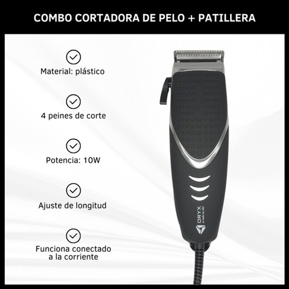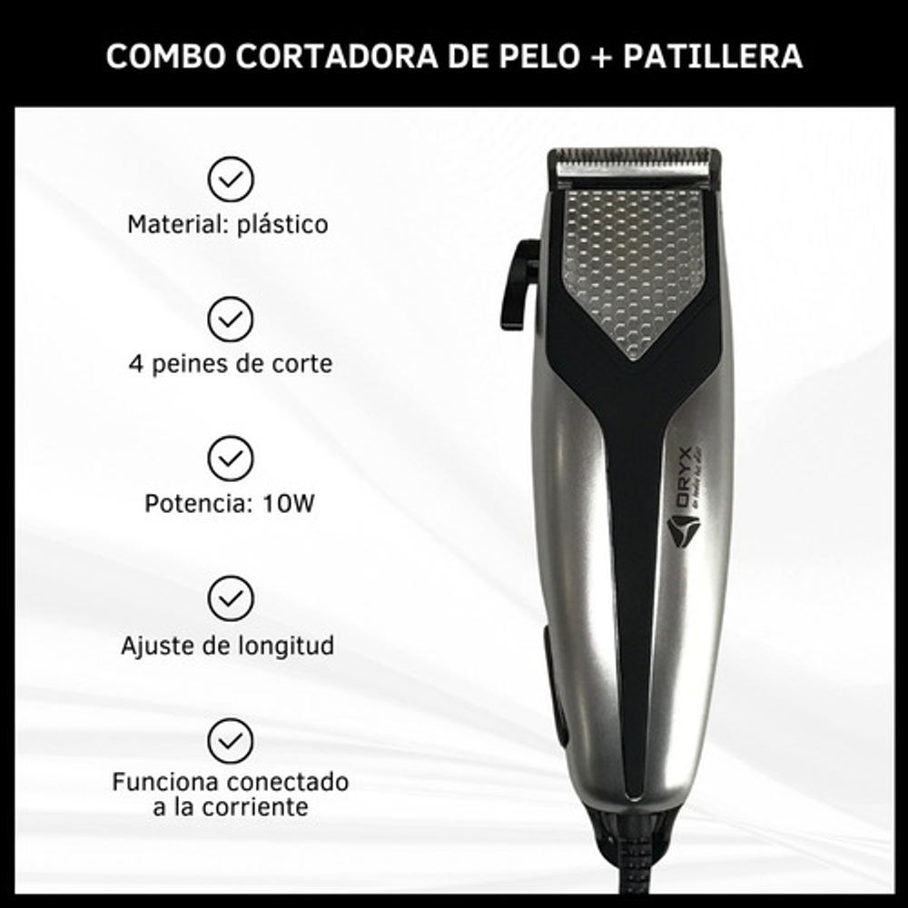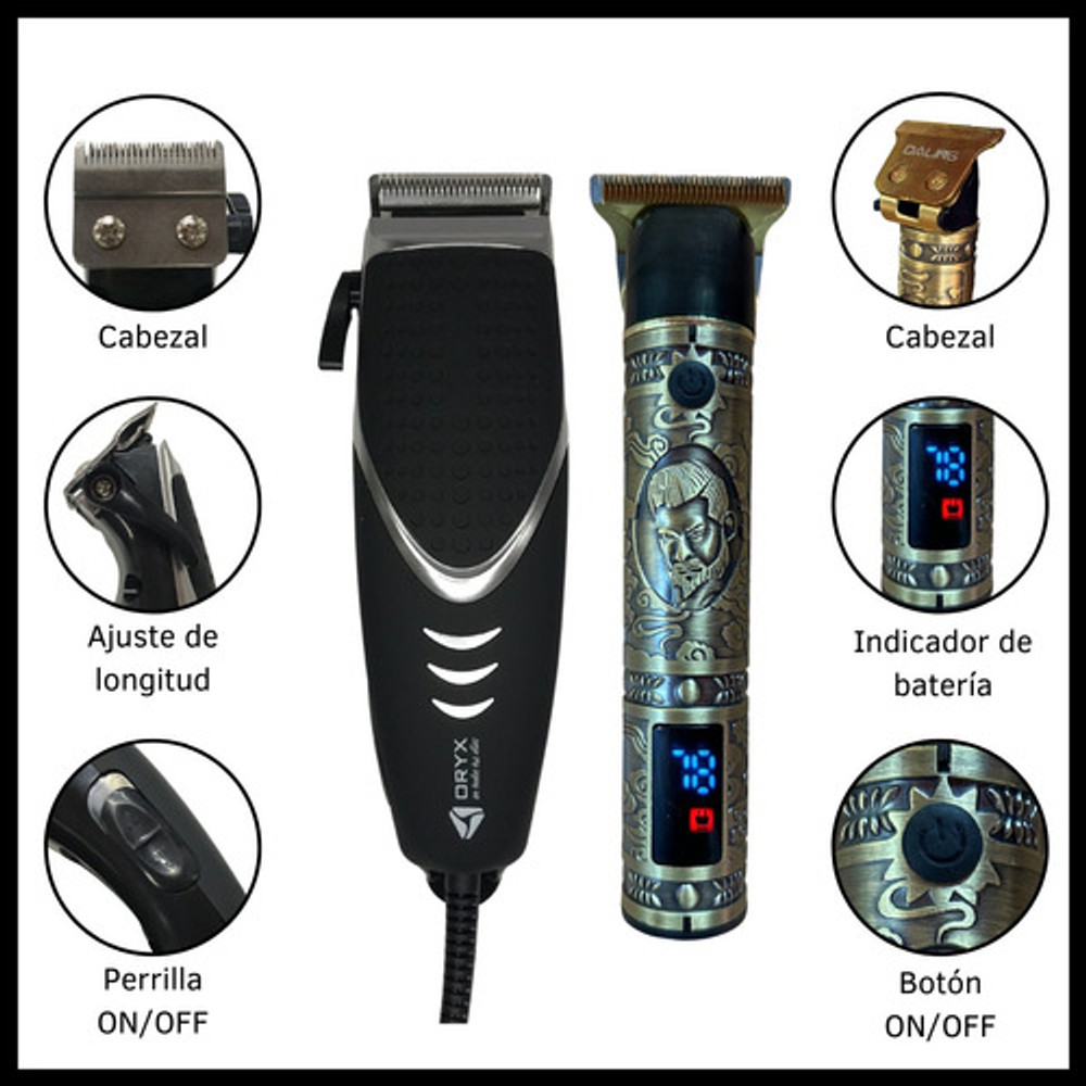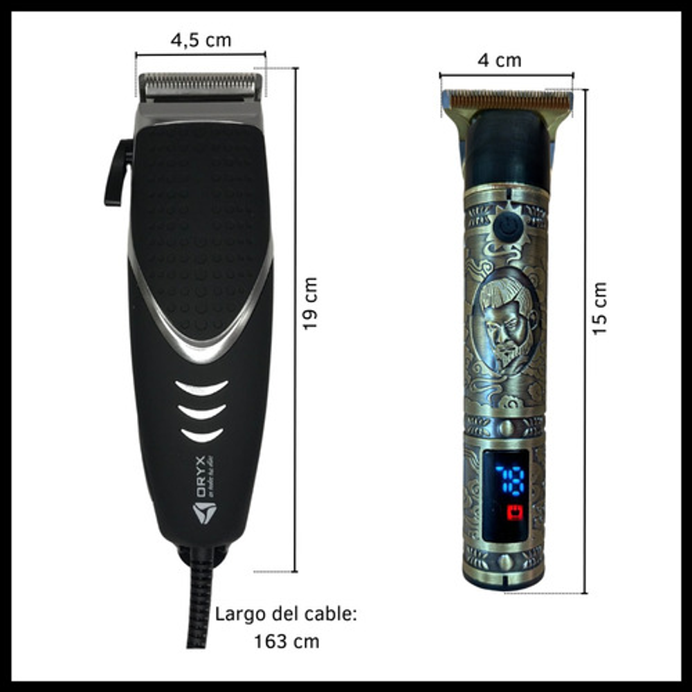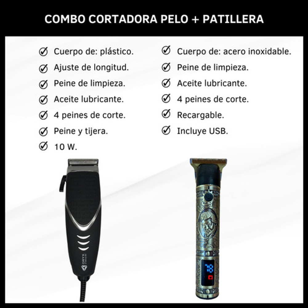 Con este combo, tendrás todo lo necesario para cuidar tu cabello y barba en casa. La máquina cortadora te ofrece cortes precisos y uniformes, mientras que la patillera asegura un acabado detallado en las áreas mas puntuales, como las patillas y el contorno de la barba.