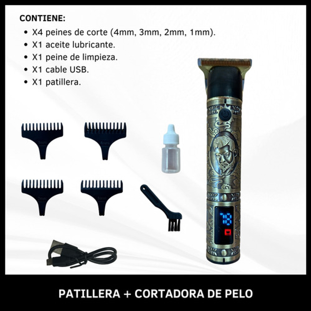 Características de la patillera: • Cuchillas de acero inoxidable. • Incluye peine de limpieza y aceite lubricante. • 4 peines de corte (4mm, 3mm, 2mm, 1,5mm). • Batería recargable. • Incluye cable USB.