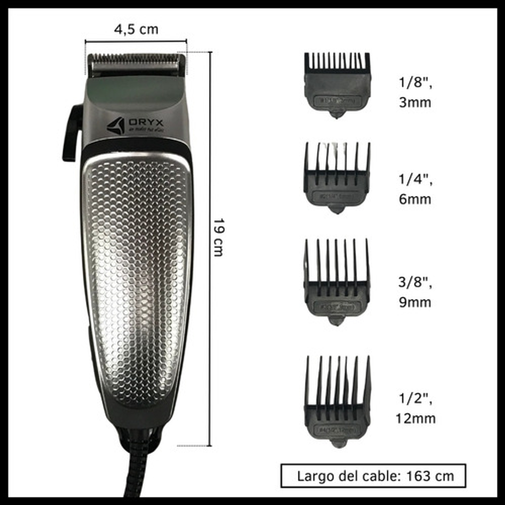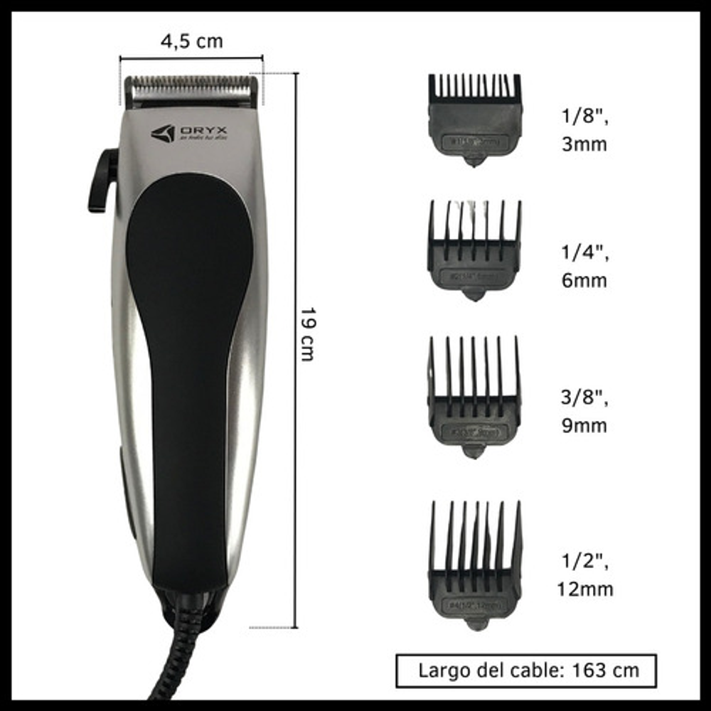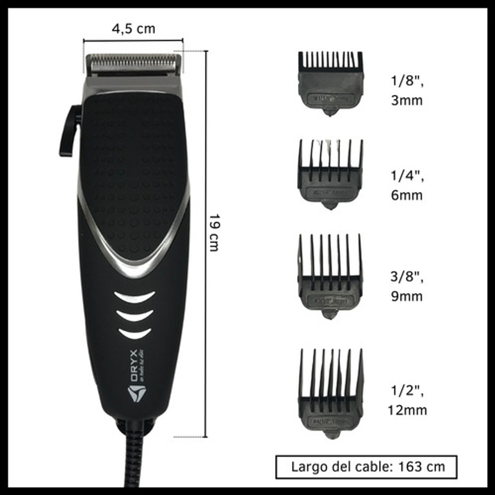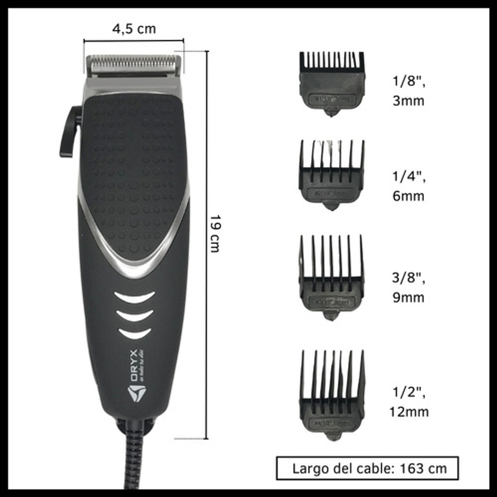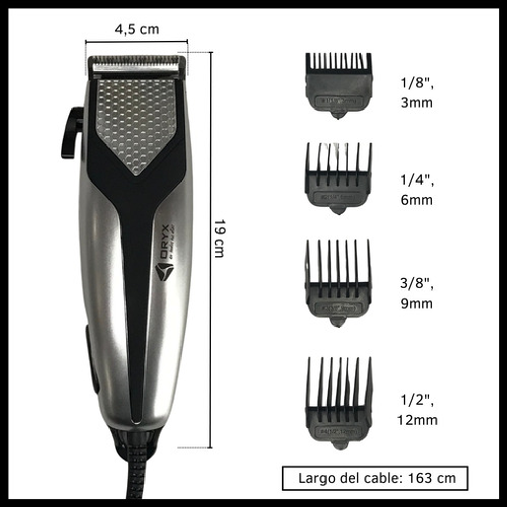 Características de la máquina de cortar pelo: • Cuerpo de plástico. • Ajuste de longitud. • Incluye peine de limpieza, aceite lubricante, peine y tijera. • 4 peines de corte (12m, 9mm, 6mm, 3mm). • Potencia 10W.