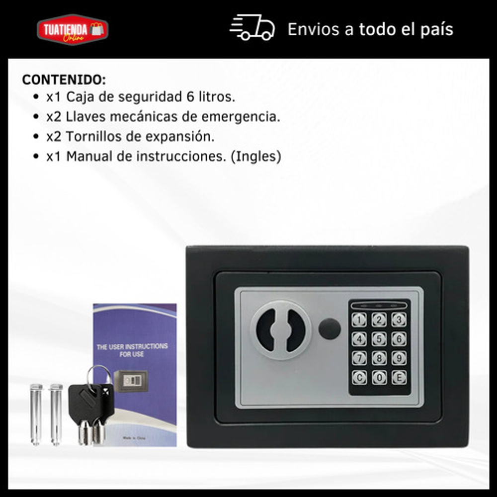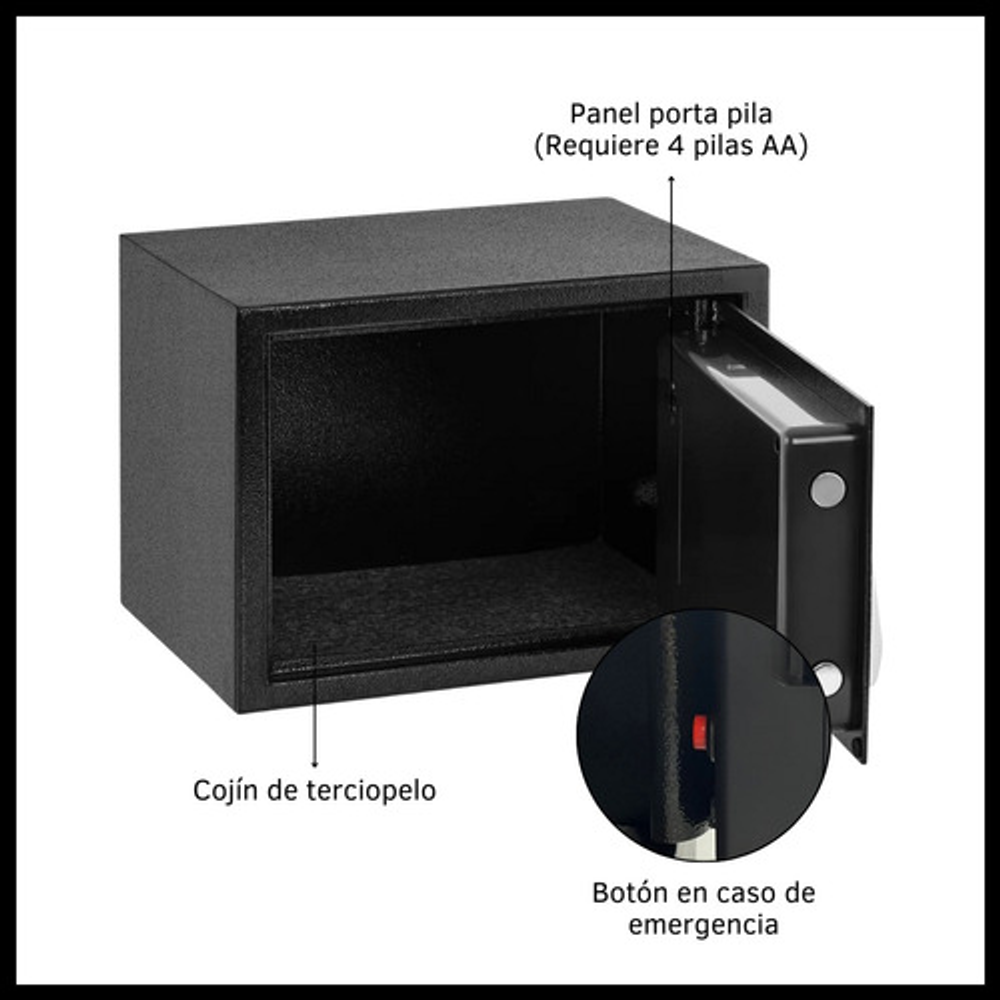 El funcionamiento de la caja fuerte es a través de 4 pilas AA. (No incluidas).