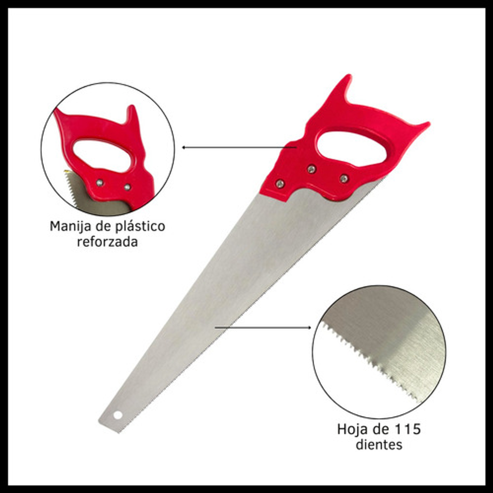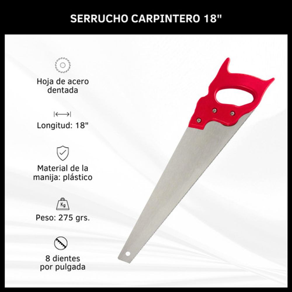 CARACTERÍSTICAS: • 18 pulgadas • Hoja con acabado pulido y hoja dentada. • Mango ergonómico de plástico.
