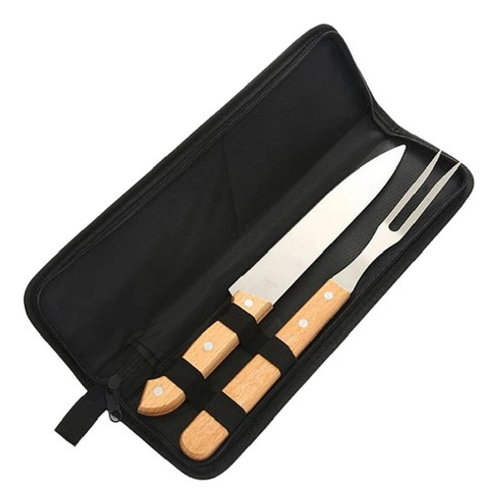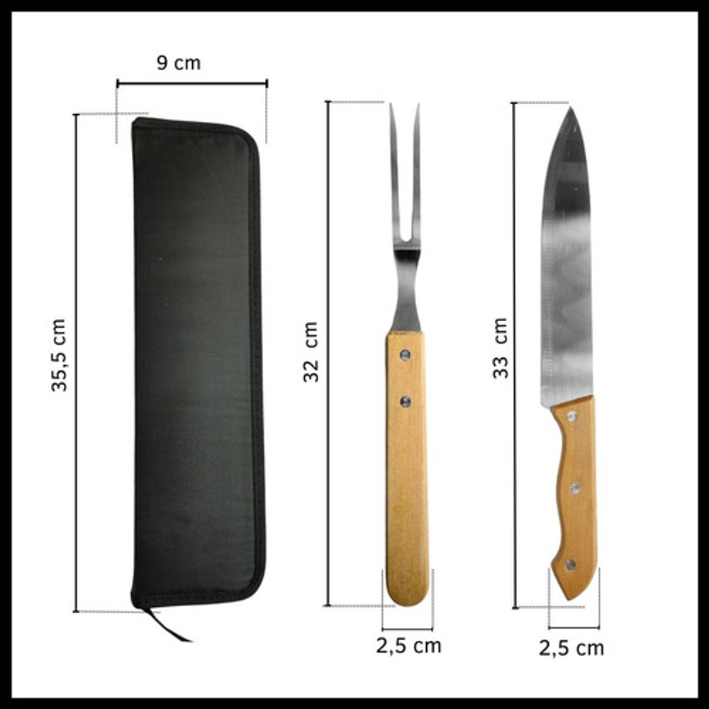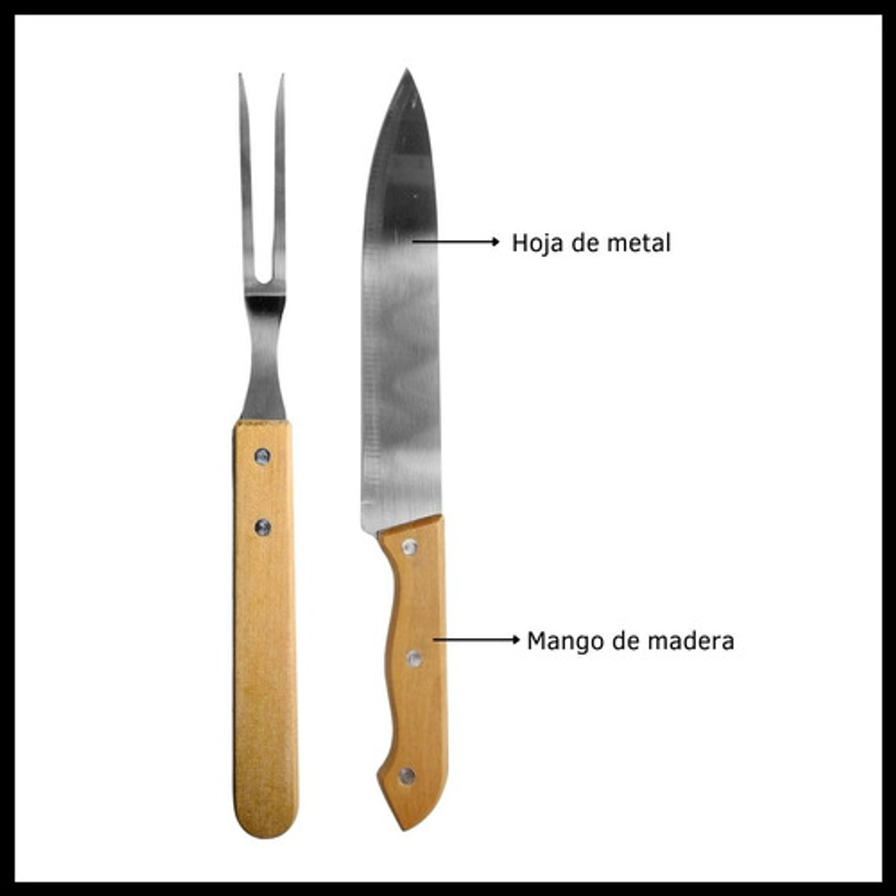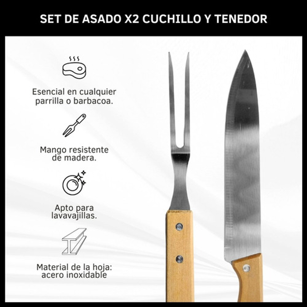 Características: • Esencial en cualquier parrilla o barbacoa. • Apto para lavavajillas. • Mango resistente de madera. • Material de la hoja: acero inoxidable • Incluye 1 cuchillo y 1 tenedor para asado