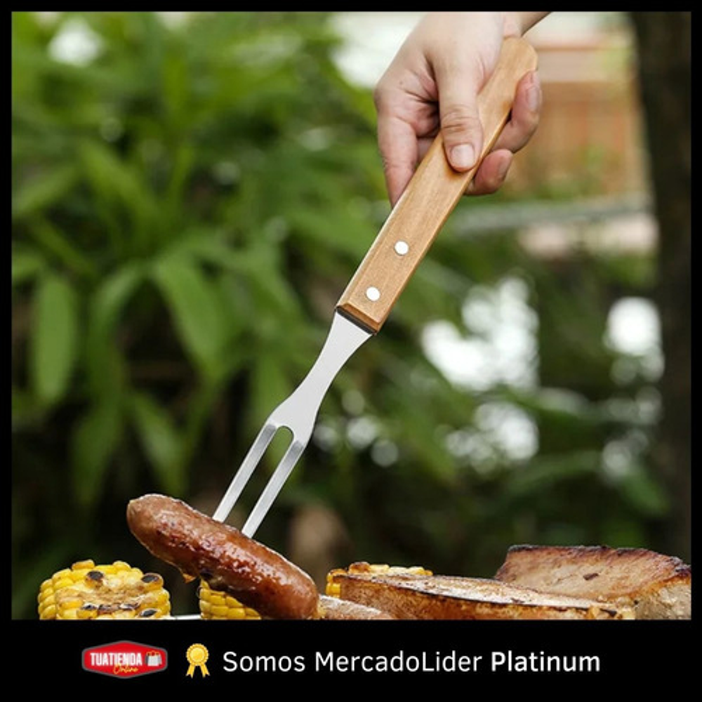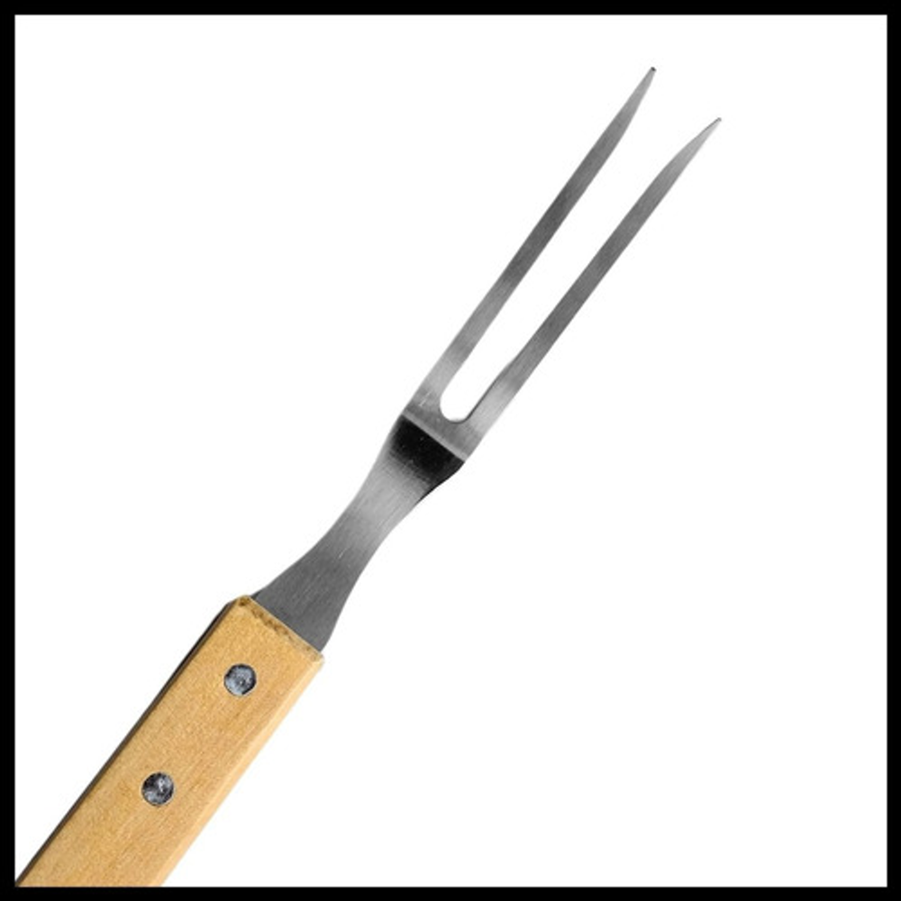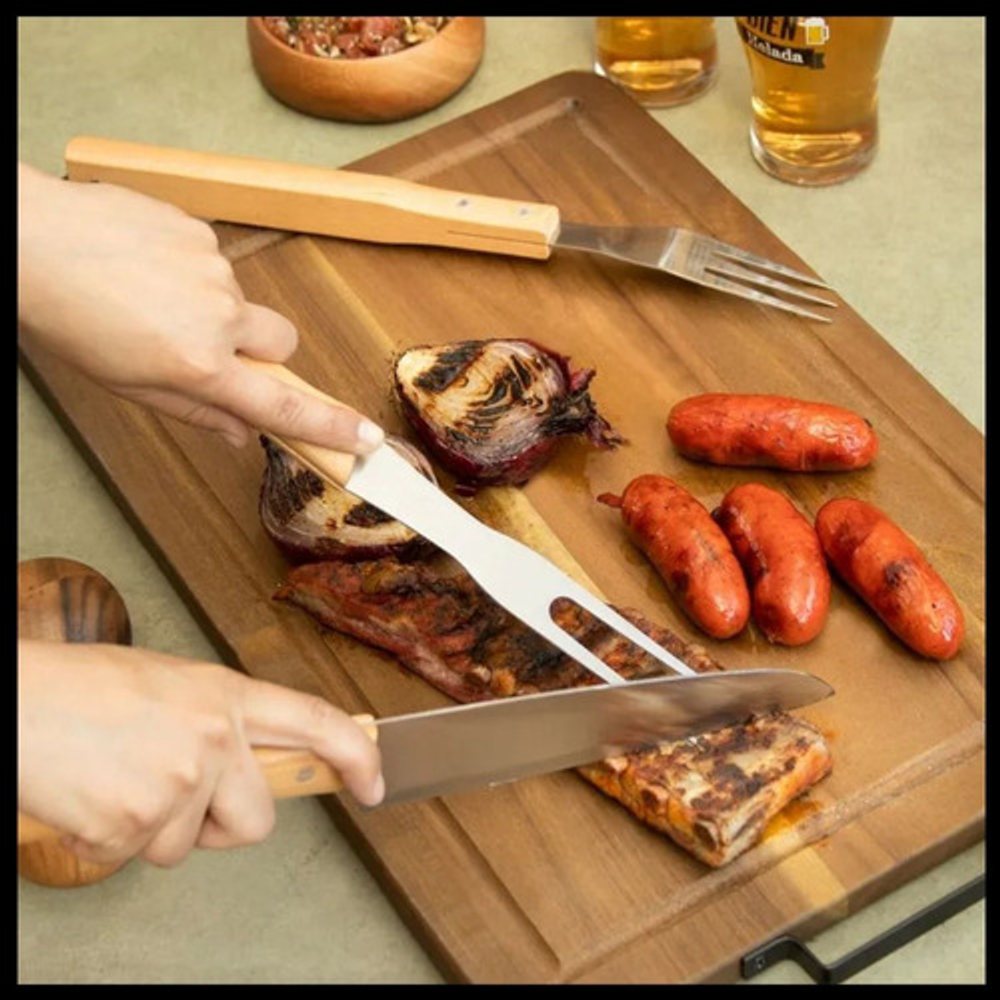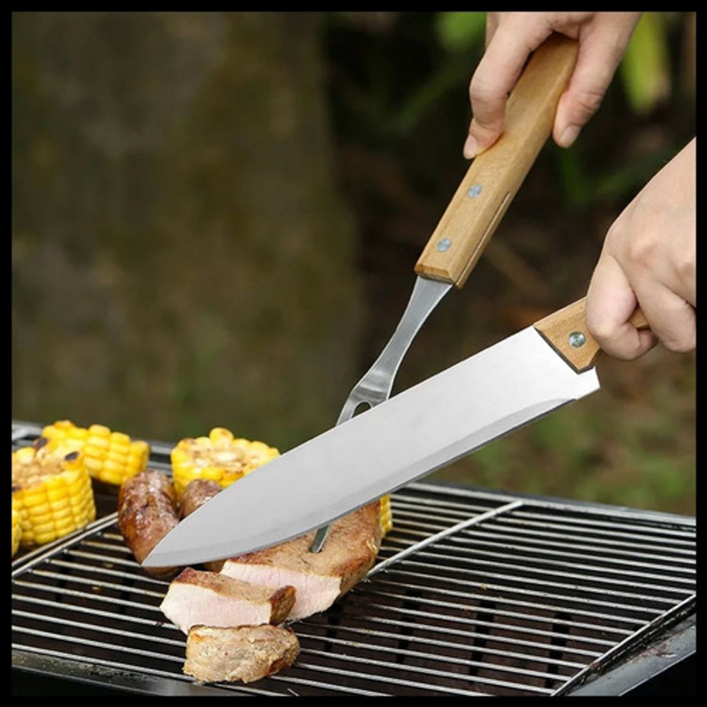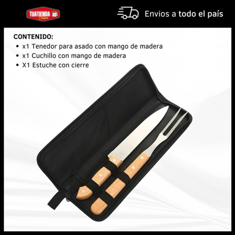 Características: • Esencial en cualquier parrilla o barbacoa. • Apto para lavavajillas. • Mango resistente de madera. • Material de la hoja: acero inoxidable • Incluye 1 cuchillo y 1 tenedor para asado