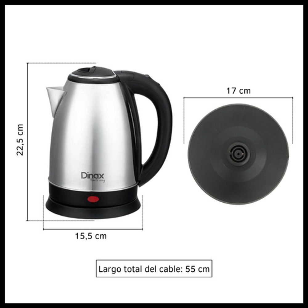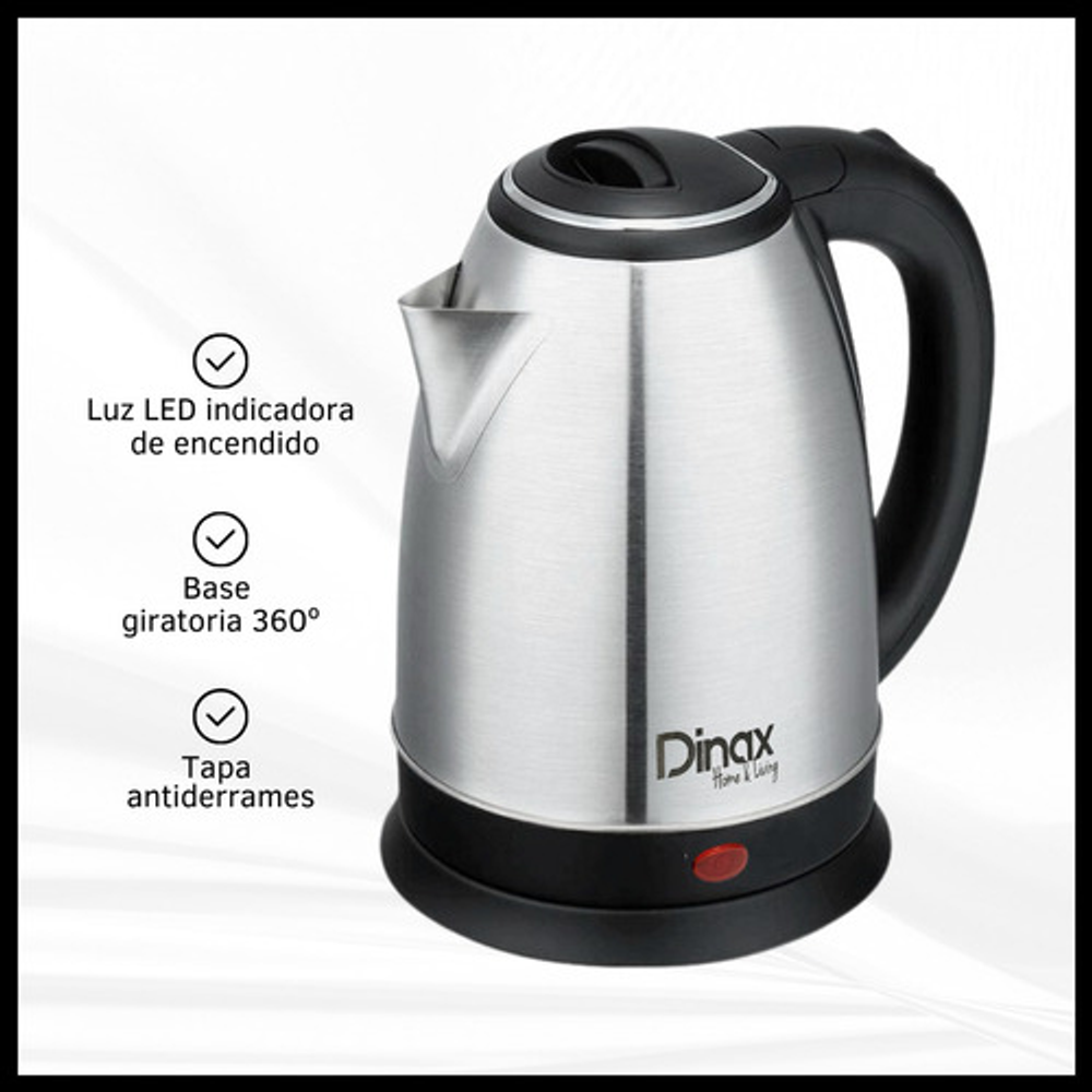 Características: -Luz indicadora de encendido. -Corte automático al hervir. -Material: acero inoxidable. -Base giratoria 360°. -Potencia: 1500W. -Capacidad: 1.8 lts.