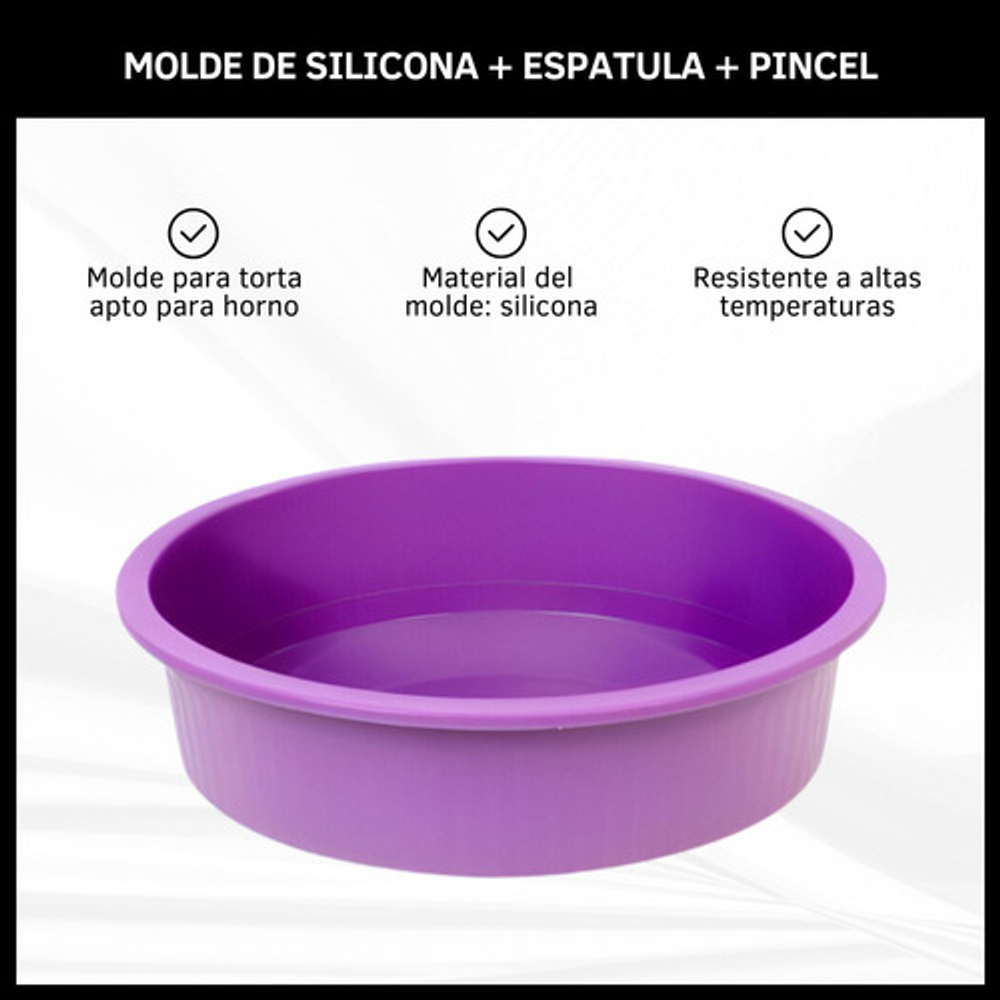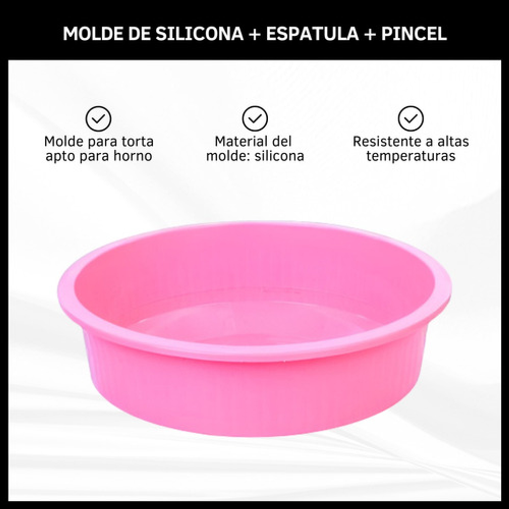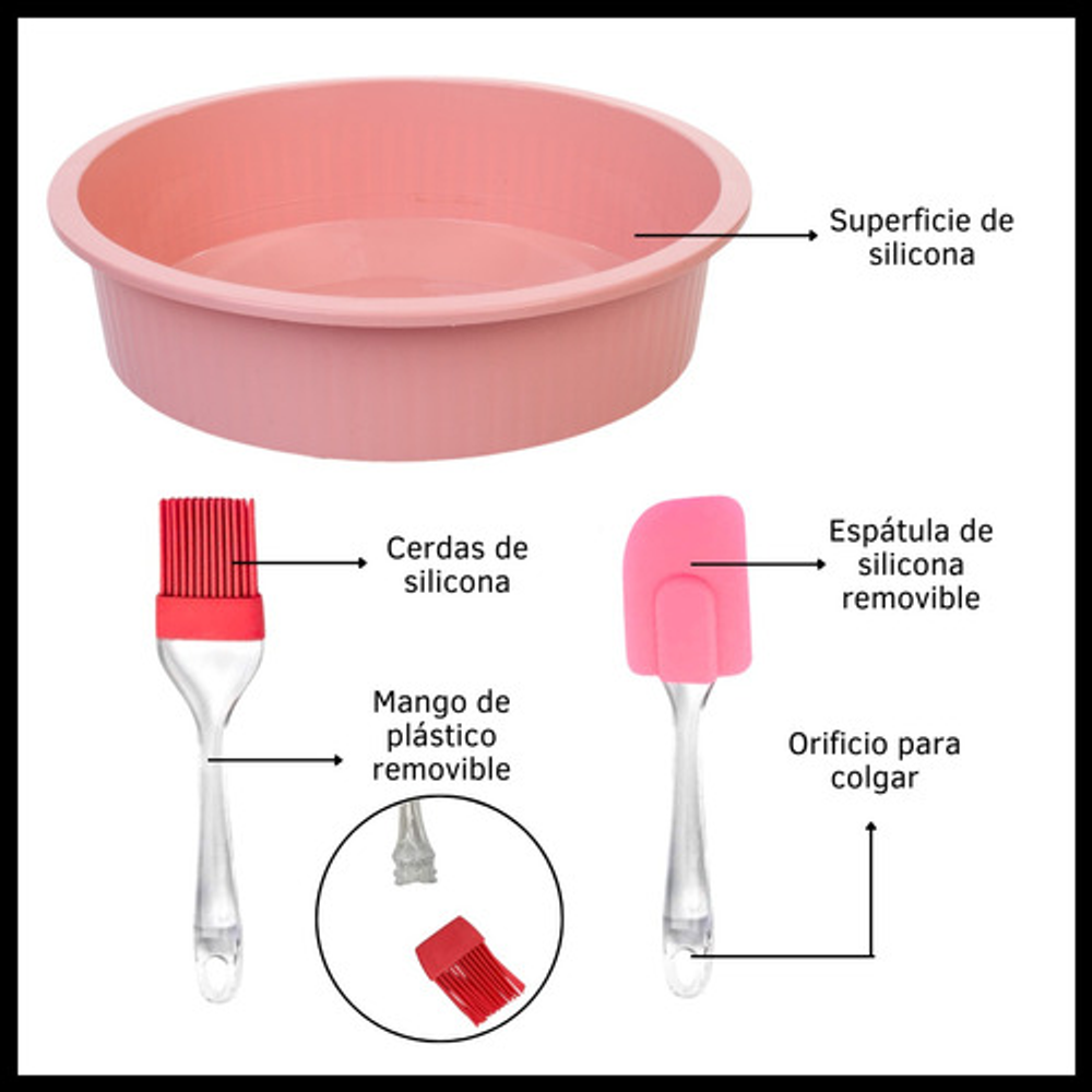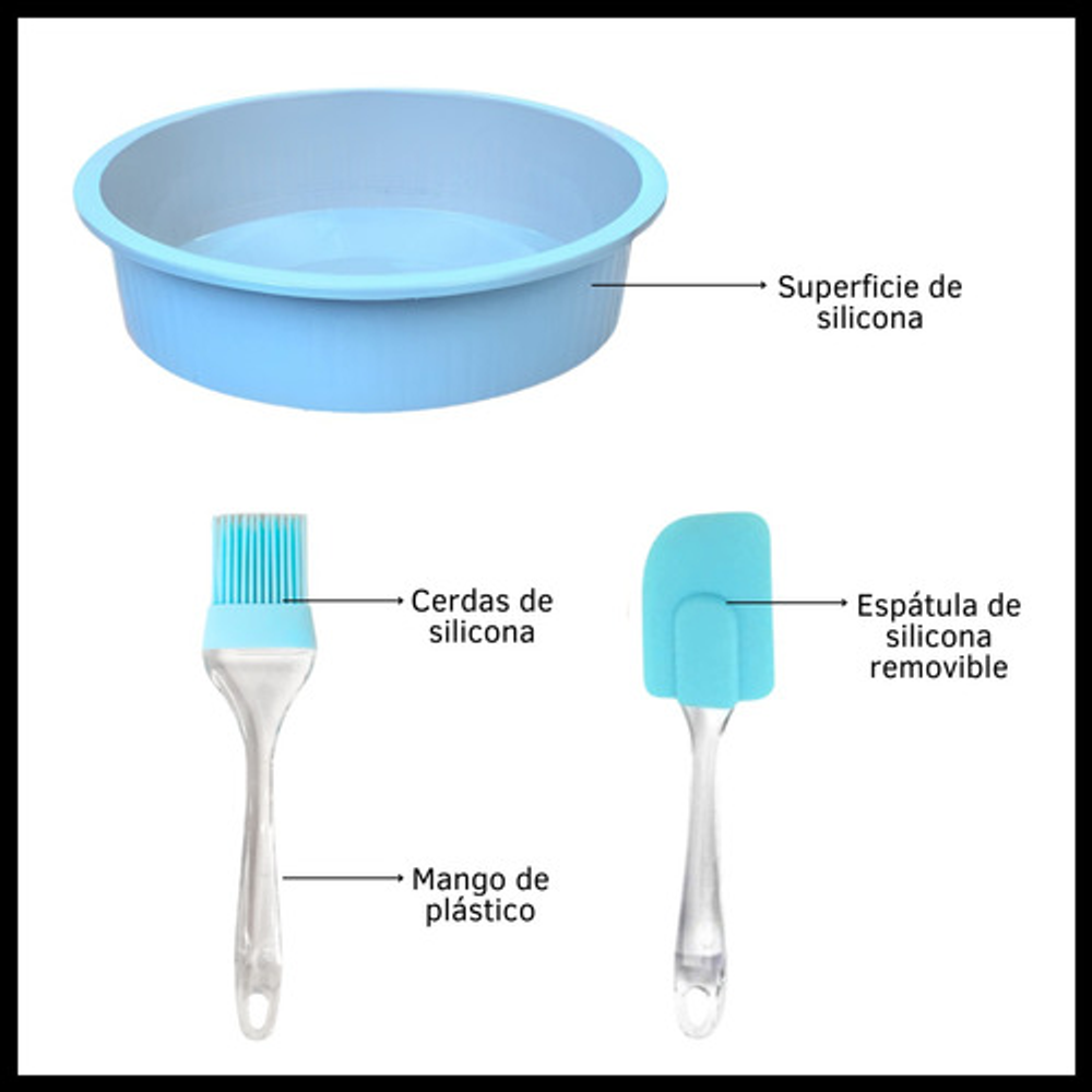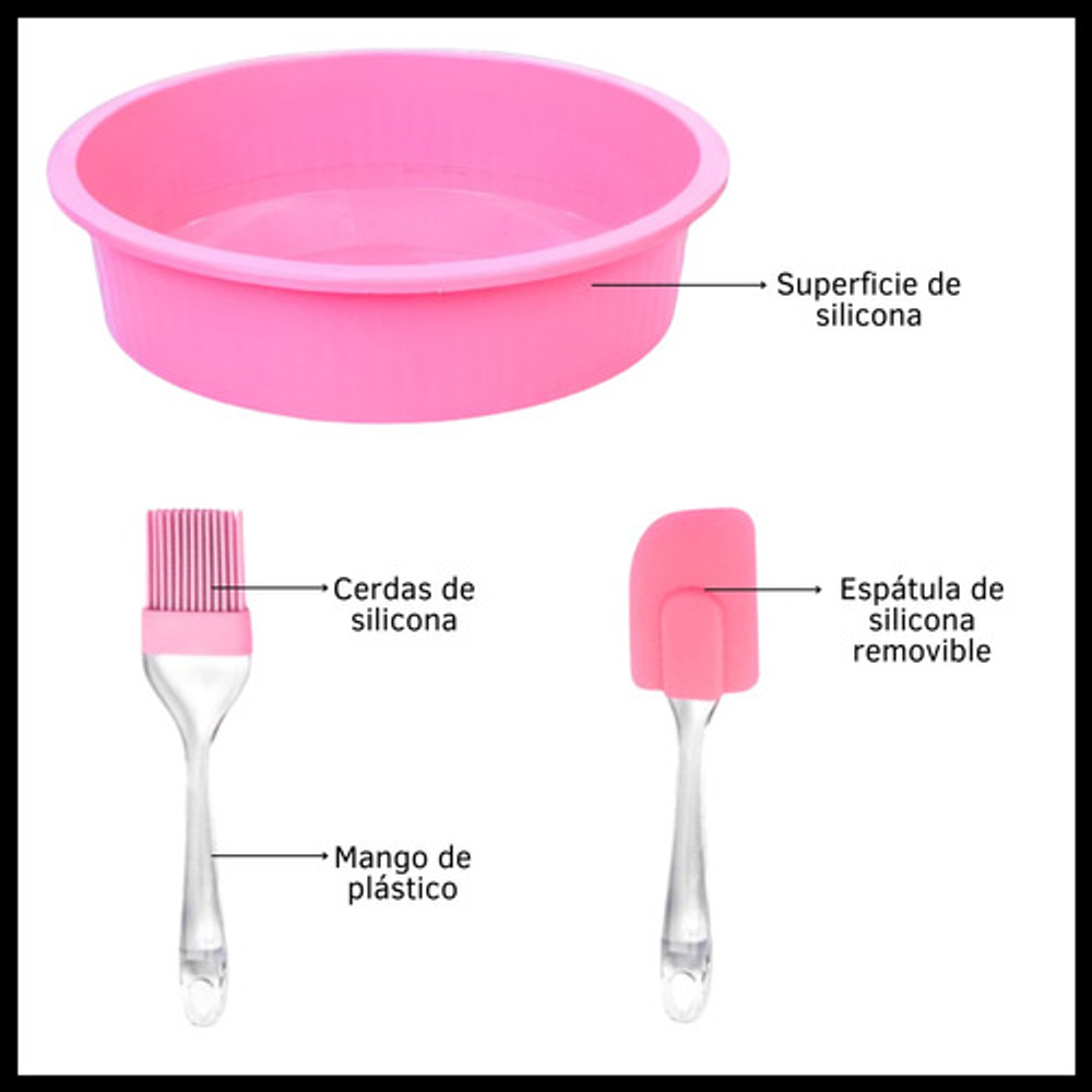 Características: -Molde para torta apto horno -Libres de BPA y materiales tóxicos -Resistente a altas temperaturas -Material del molde: silicona -Mango del pincel y espátula de plástico -Cerdas del pincel y espátula de silicona