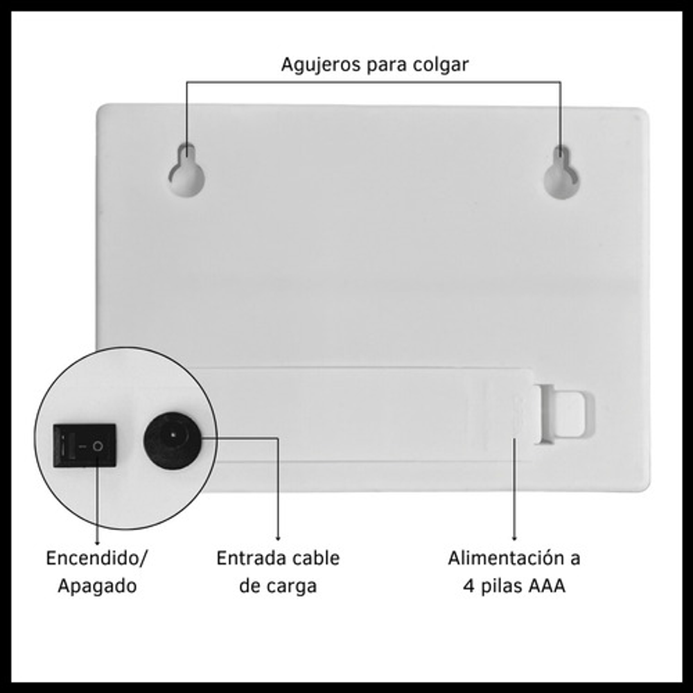Incluye orificios para colgarse en la pared, apto para interiores o exteriores.