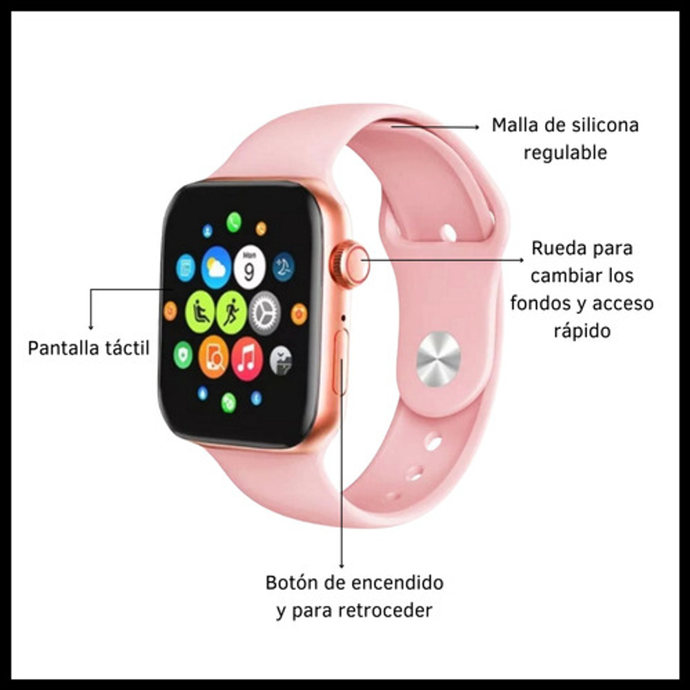 Características: • La aplicación para vincular el celular con el reloj, se instala escanenando el QR que aparece en la pantalla del reloj. Puede ser Lefun Health o Fit Pro. • Malla de silicona ajustable de color rosa. • Incluye cargador con cable integrado. • Gran variedad de funciones. • NO es sumergible. • Sistema touch. • Compatible con Android 5.0 o superior y en IOS 9.0 o mayor. • Duración de la batería: depende del uso. • Conexión Bluetooth.