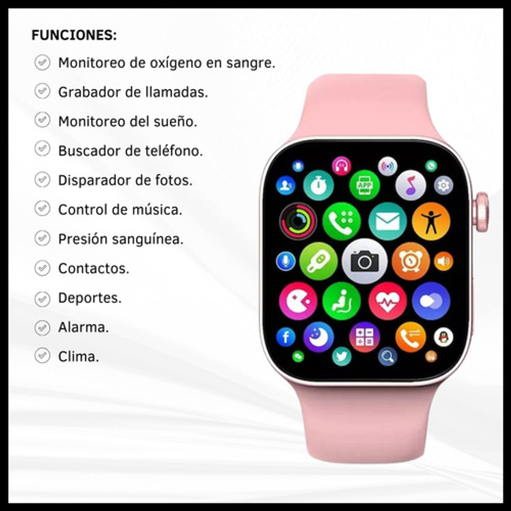 Funciones: • Monitoreo de oxígeno en sangre. • Grabador de llamadas. • Monitoreo del sueño. • Buscador de teléfono. • Disparador de fotos. • Control de música. • Presión sanguínea. • Contactos. • Deportes. • Alarma. • Clima.