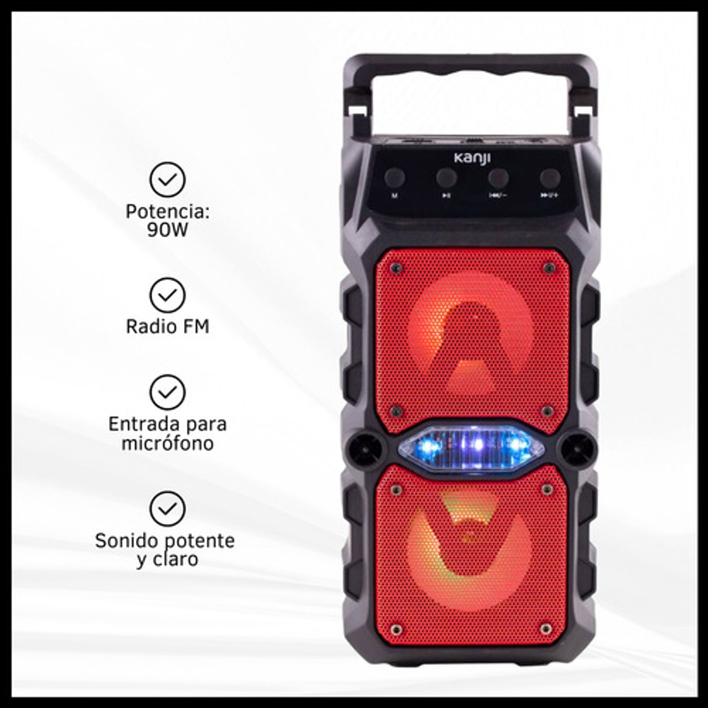 Características: -Batería recargable. -Incluye luces LED RGB. -Entrada USB/SD/MIC/DC 5V. -Potencia de 90W. -Incluye radio FM.