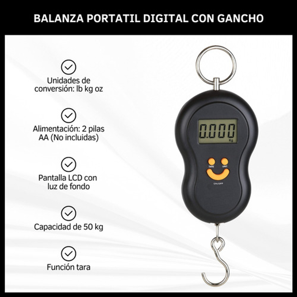 CARACTERISTICAS: -Unidades de conversión: lb kg oz. -Alimentación: 2 pilas AA (No incluidas). -Pantalla LCD con luz de fondo. -Capacidad 50 Kg. -Función tara.