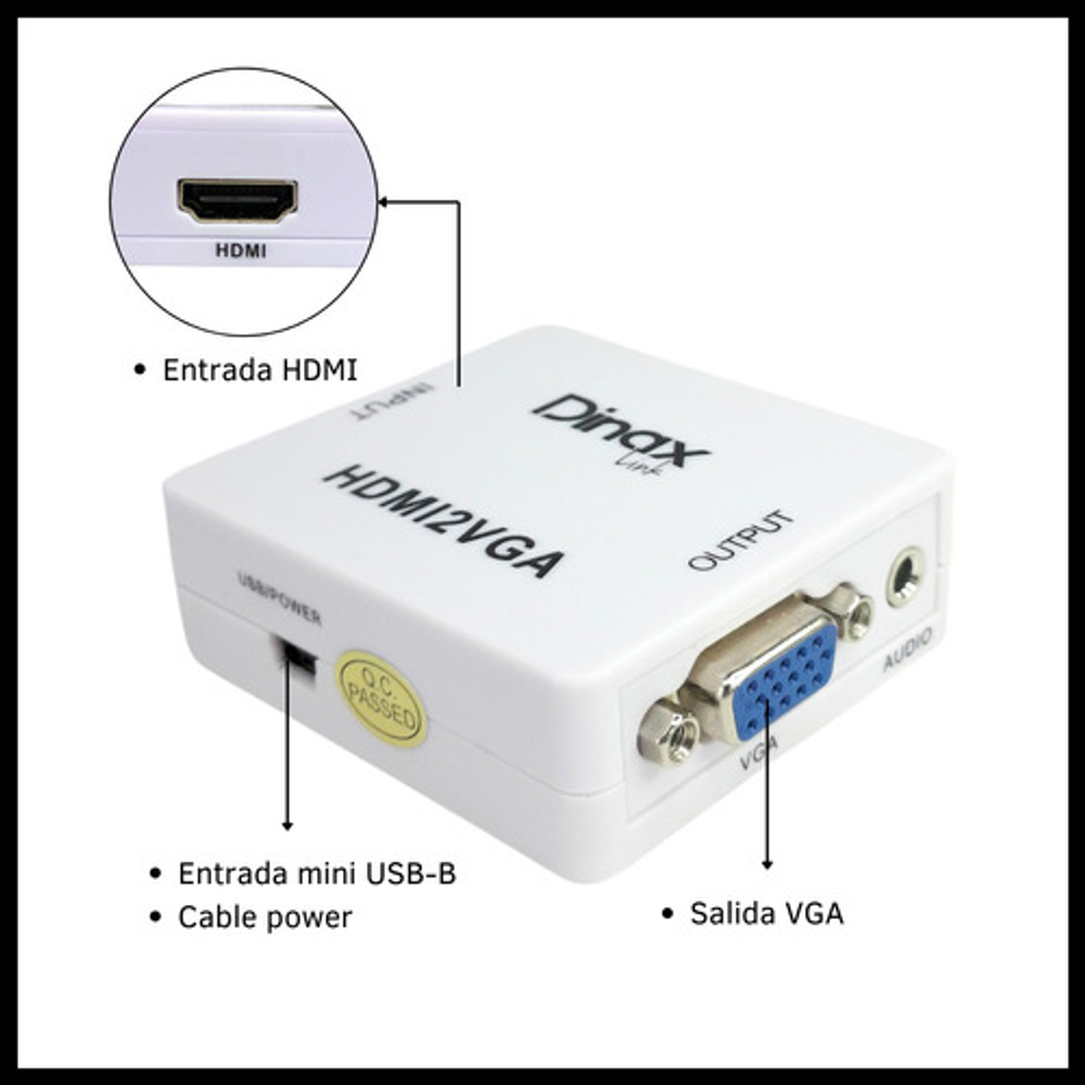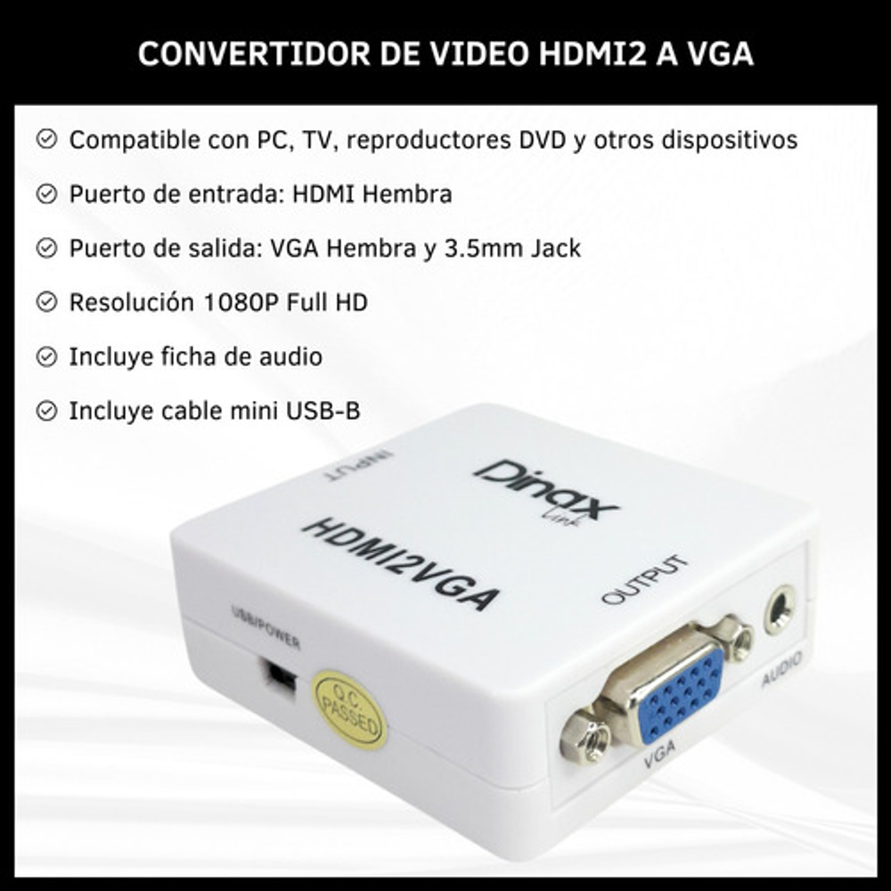 Este convertidor facilita la conexión de dispositivos con salida HDMI, como computadoras, laptops y consolas de videojuegos, a dispositivos con entrada VGA como monitores, televisores y proyectores.