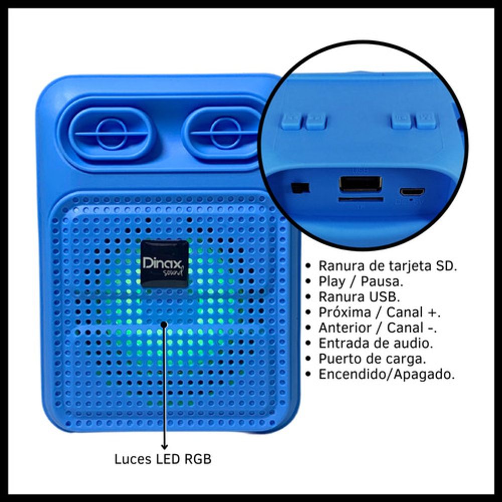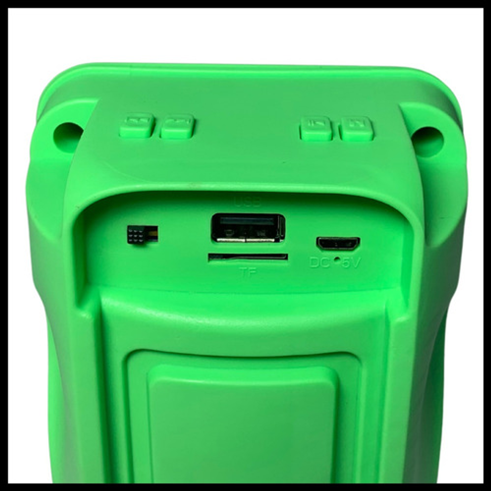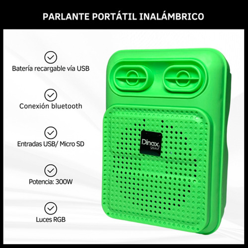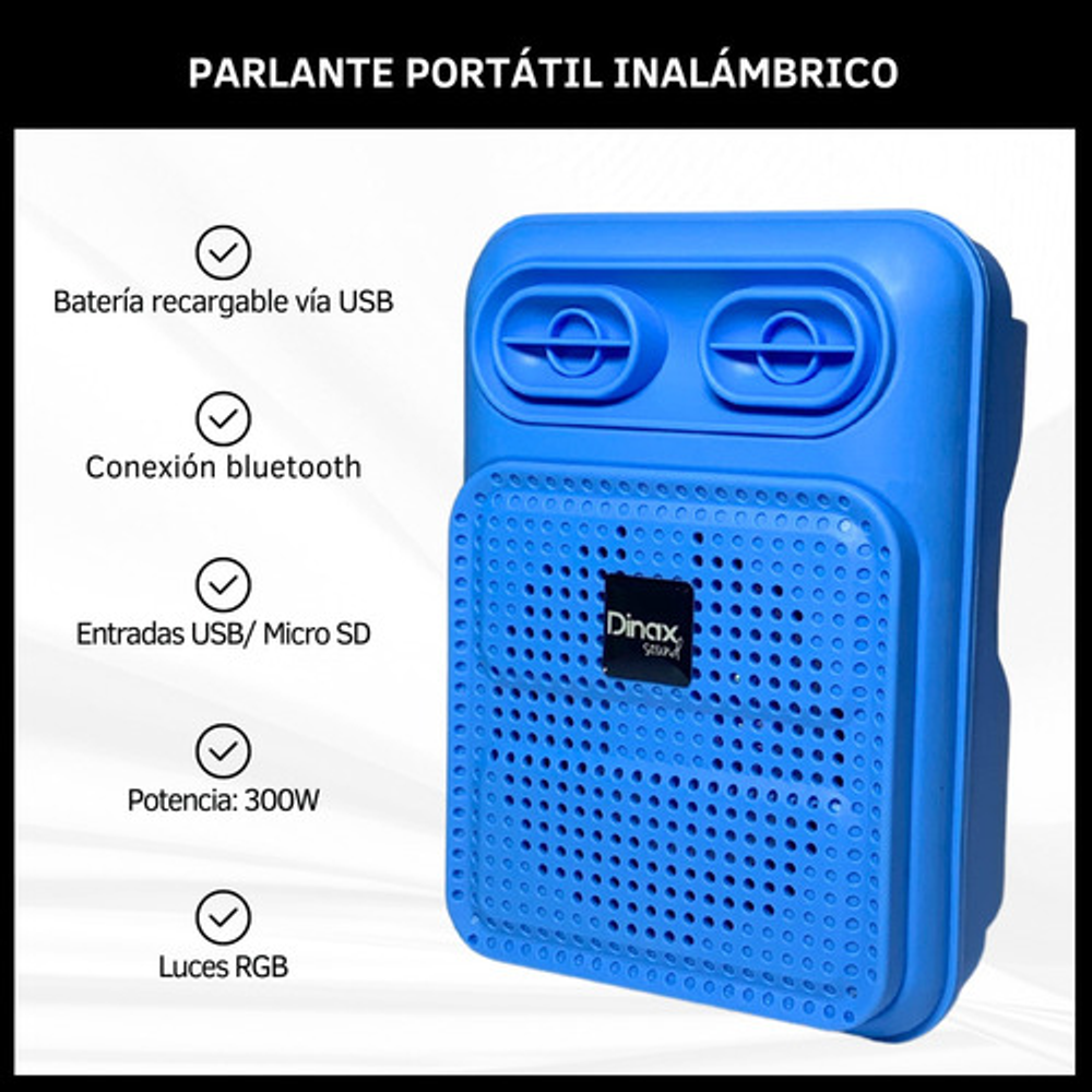 Características: • Tamaño de 3 pulgadas • Potencia 300W • Luces LED RGB • USB - Tarjeta TF - Bluetooth - Radio FM • Batería recargable vía USB (cable de carga incluido)