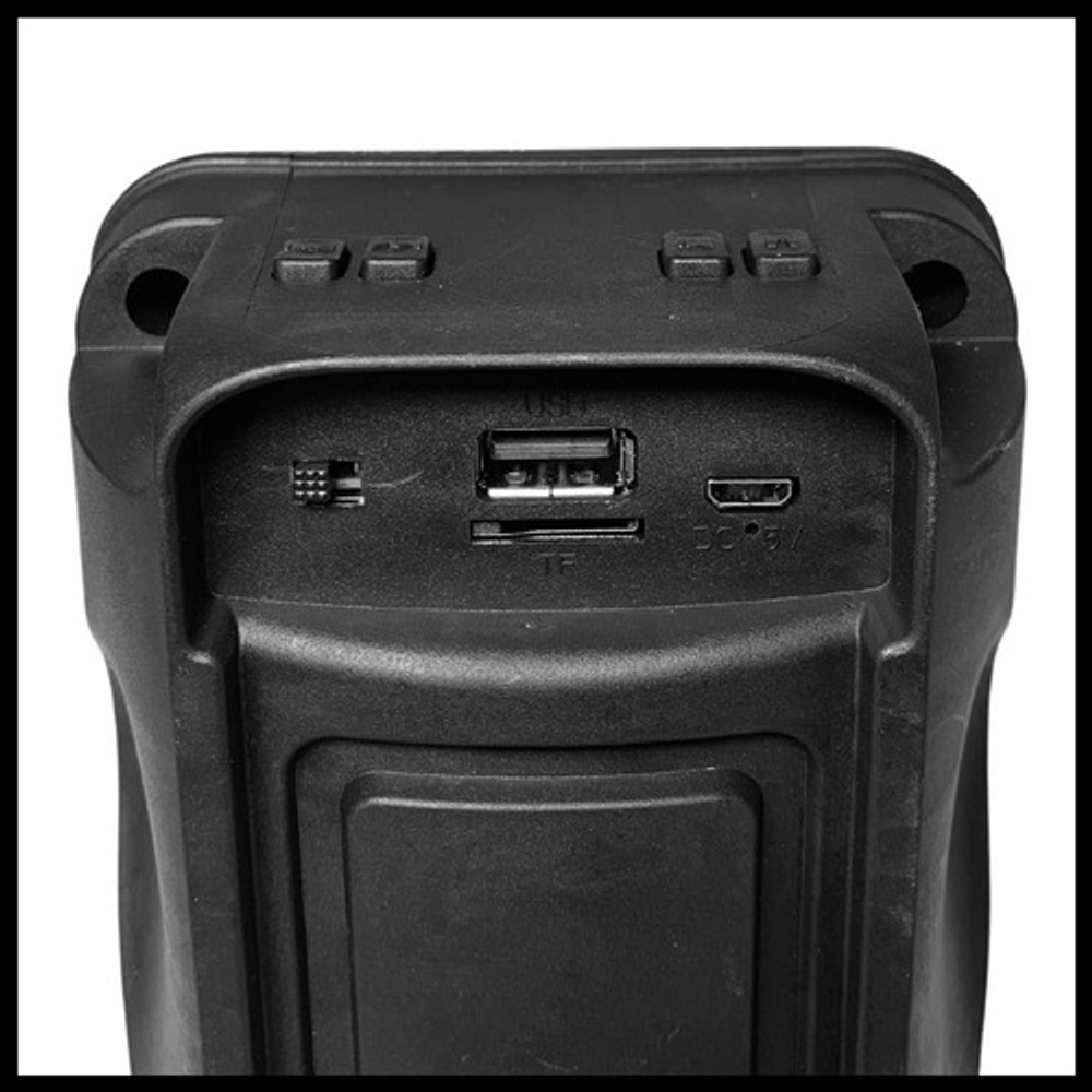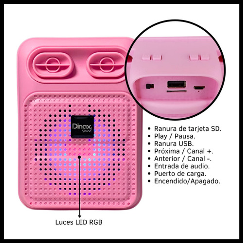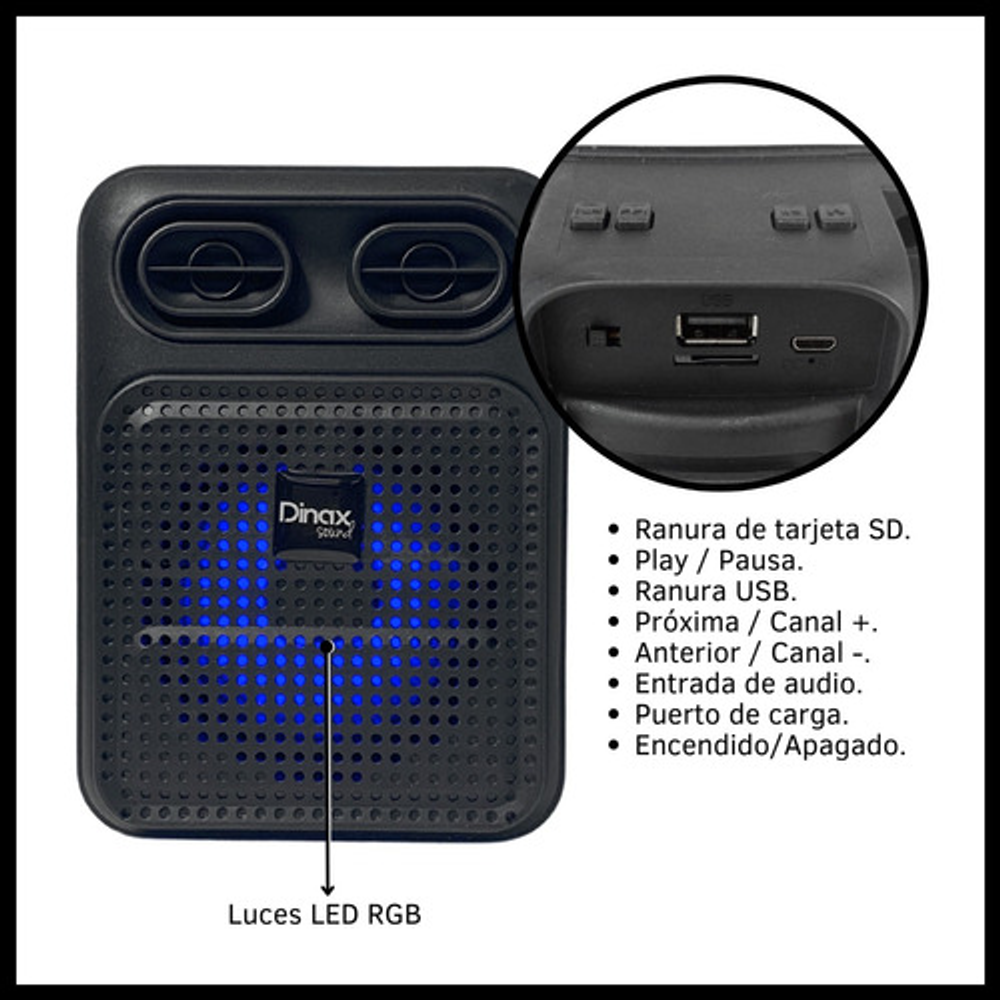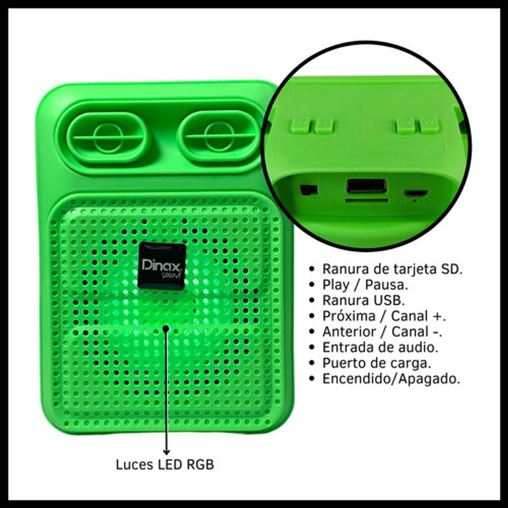 Características: • Tamaño de 3 pulgadas • Potencia 300W • Luces LED RGB • USB - Tarjeta TF - Bluetooth - Radio FM • Batería recargable vía USB (cable de carga incluido)