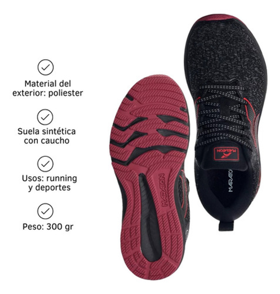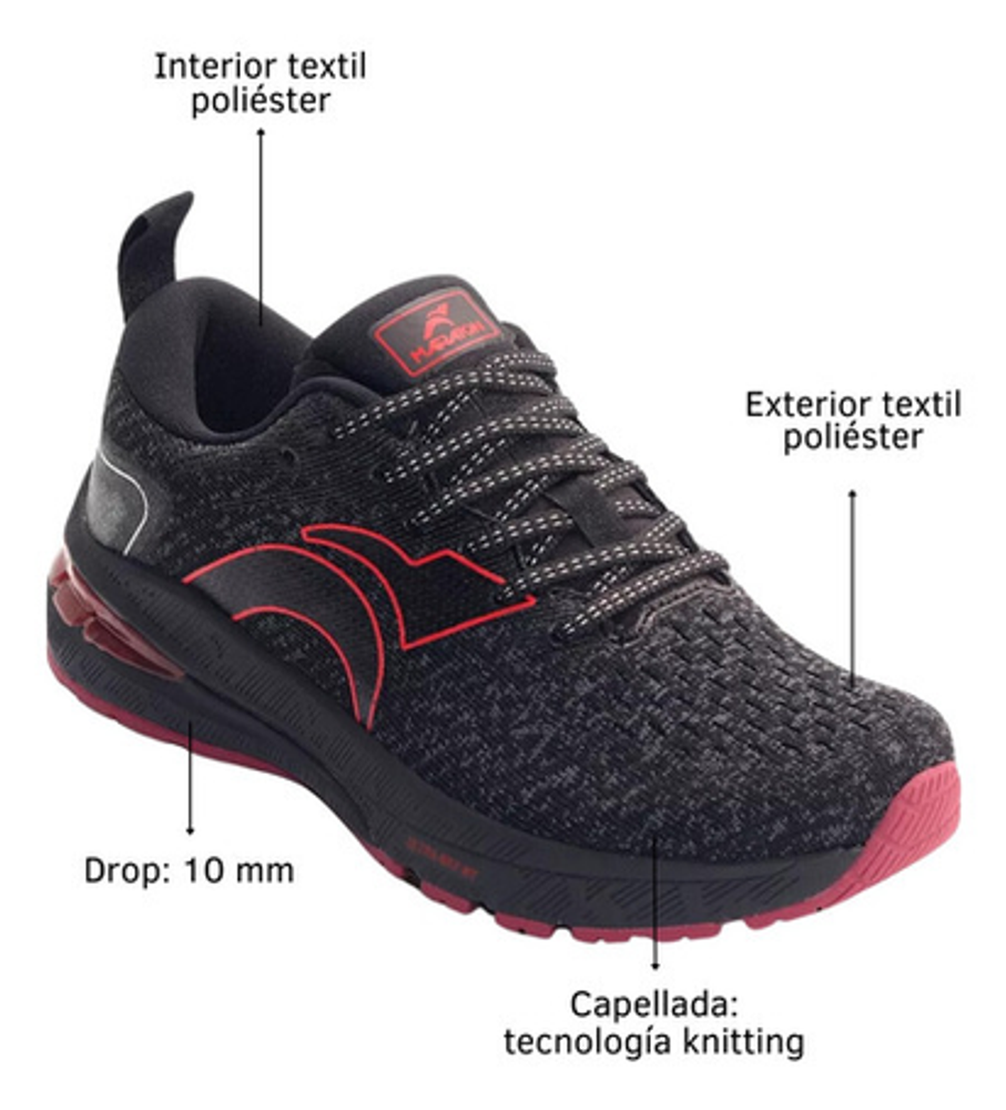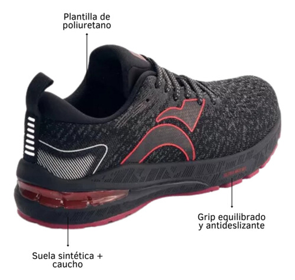 Características: -Articulo: #1005 -Capellada: Tecnologia Knitting. -Plantilla Confeccionada con Poliuretano. -Agarre/grip: Agarre superior. -Forro: Special Lycra con cuello espumado. -Drop: 10MM. -Acceso: Mediante Cordones. -Suela: Sintético + Caucho. -Peso:300gr.