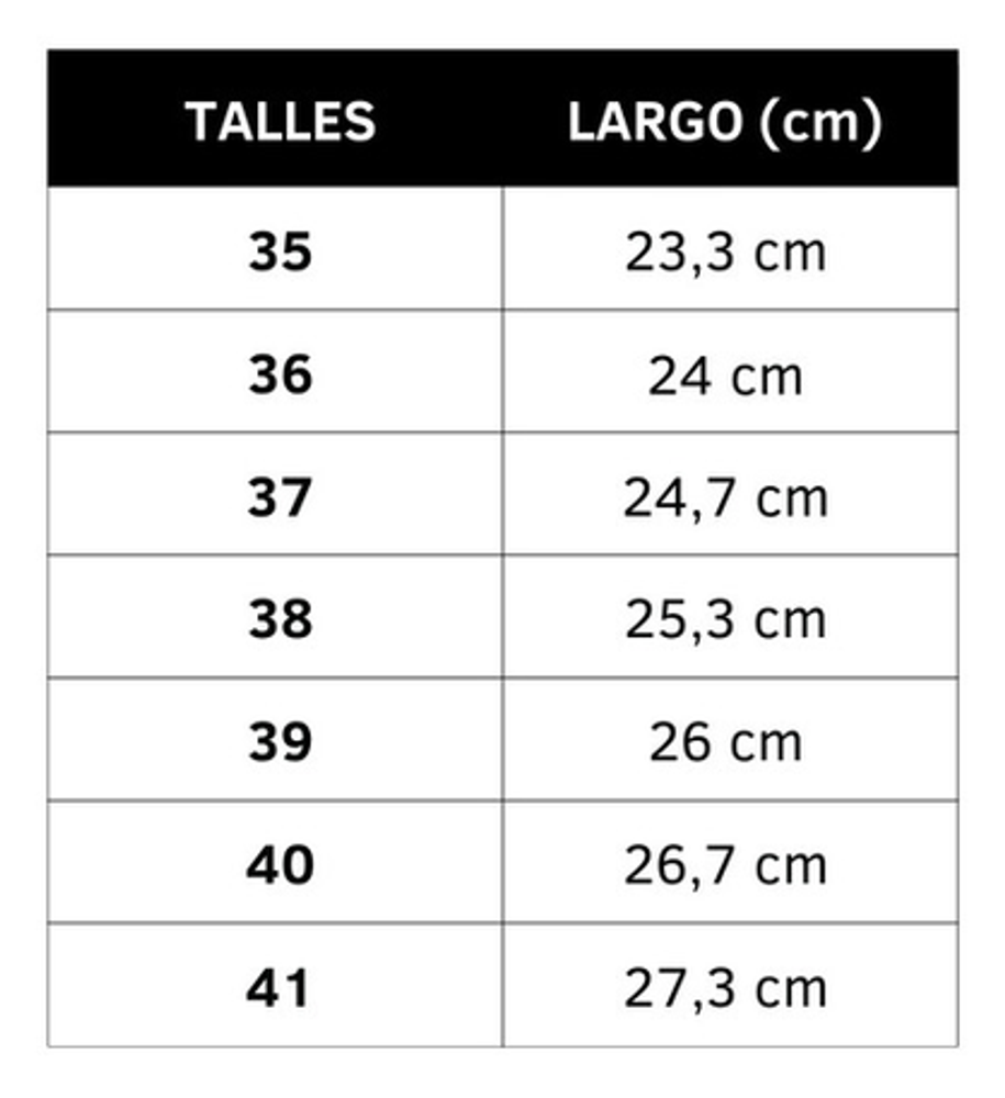 Talles: Por favor consultar la tabla de talles que se encuentra en las imágenes del producto. Se recomienda sumar 0,5cm al largo total del pie para obtener una mejor comodidad.