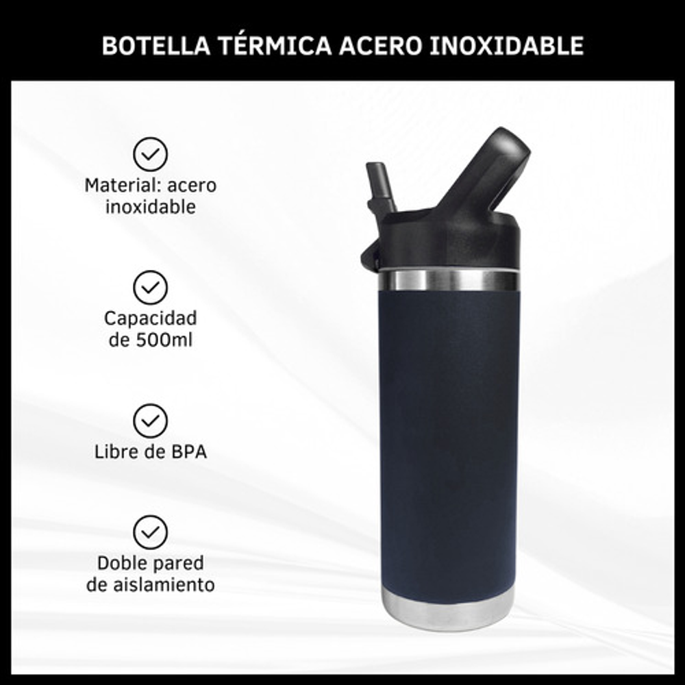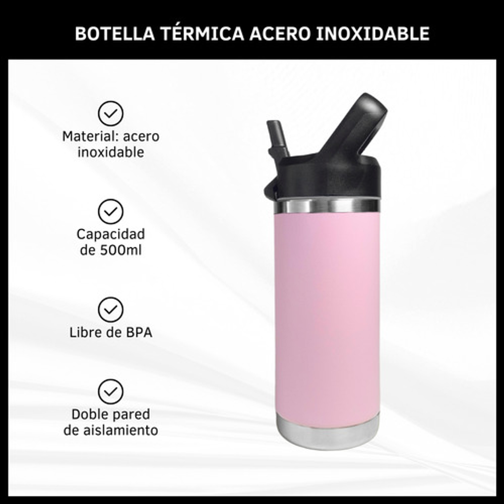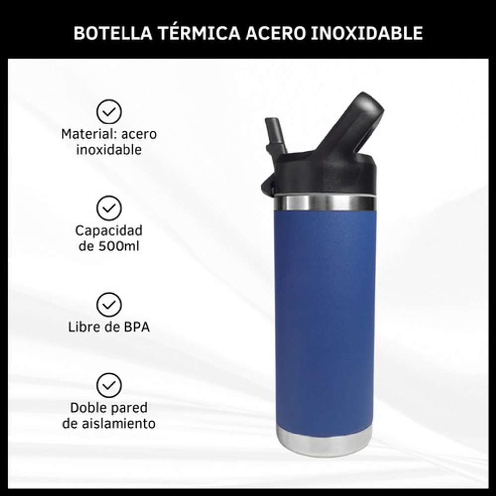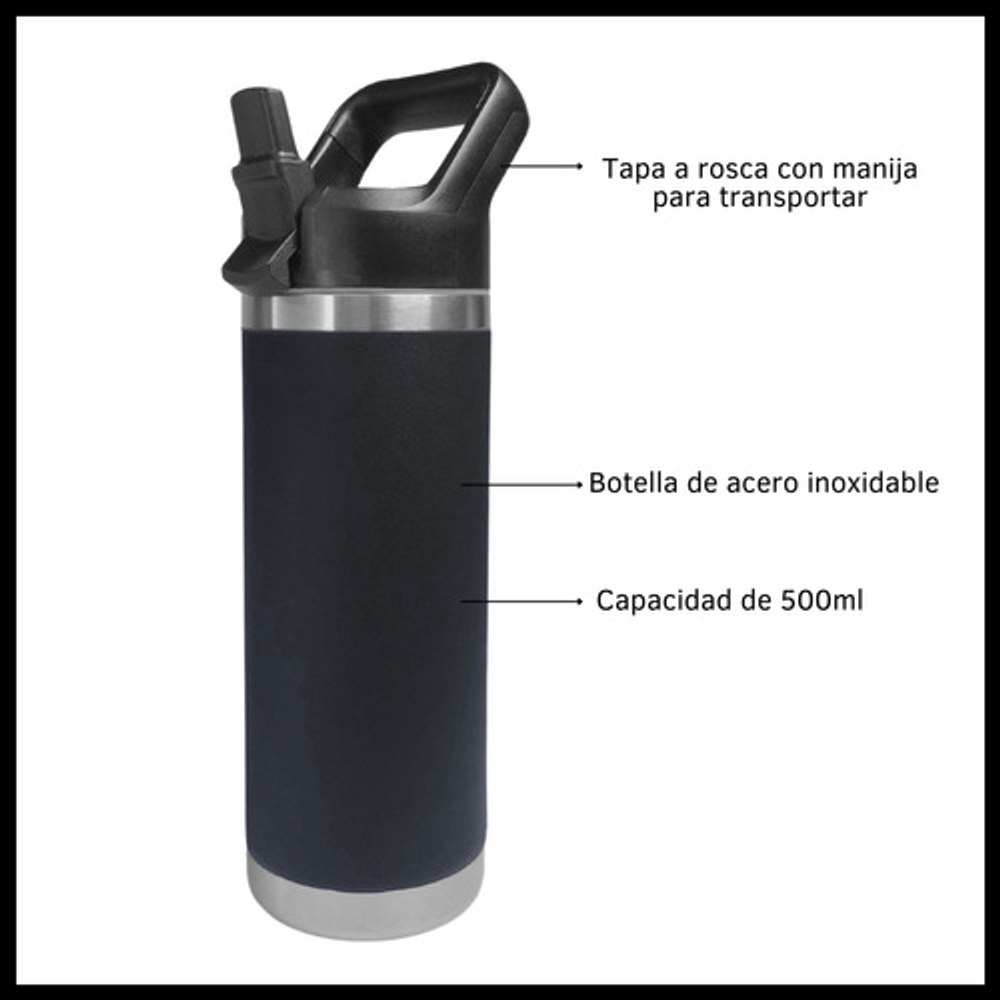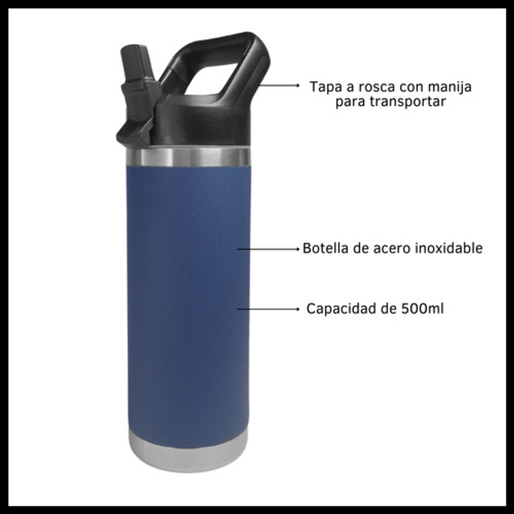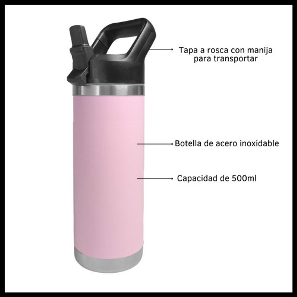 Características: • Doble pared de aislamiento. • Material: acero inoxidable. • Manija fácil transporte. • Apto para frío y calor. • Boquilla deslizante. • Capacidad: 500ml. • Libre de BPA.