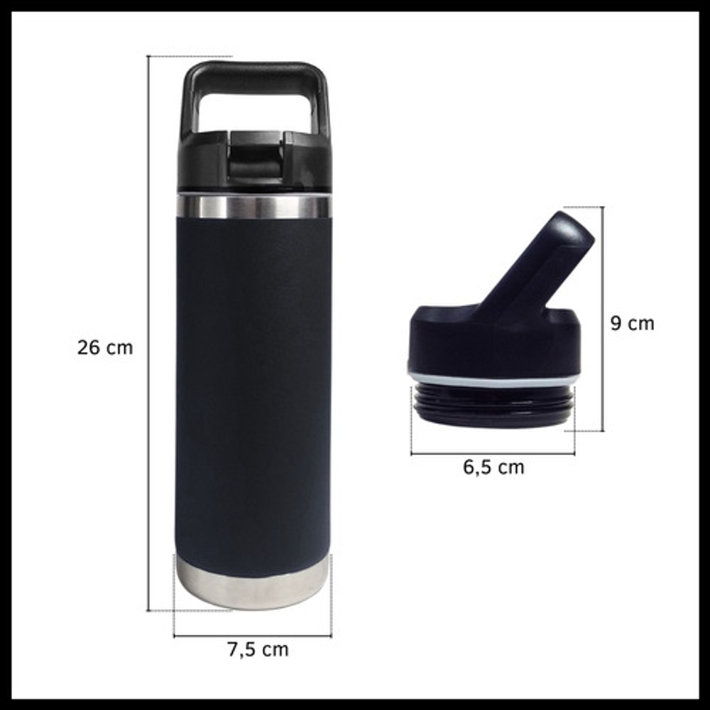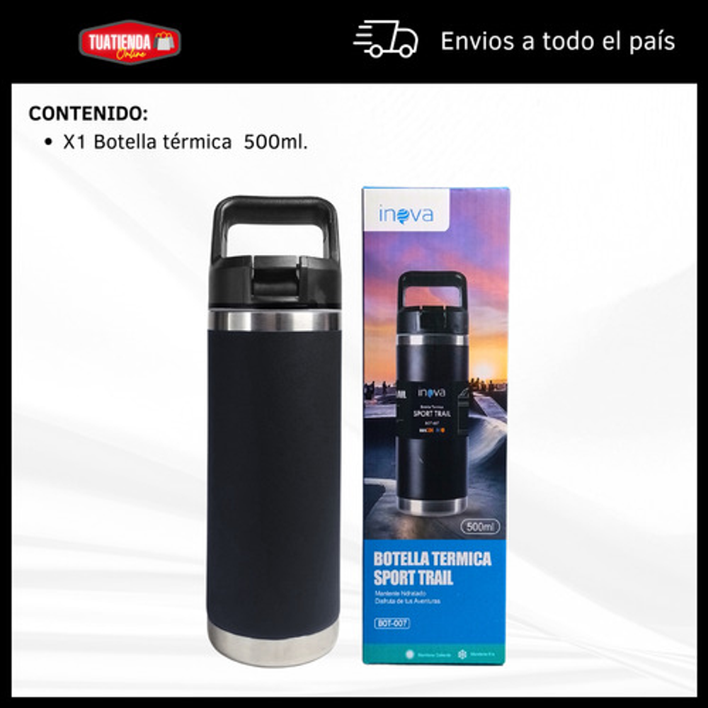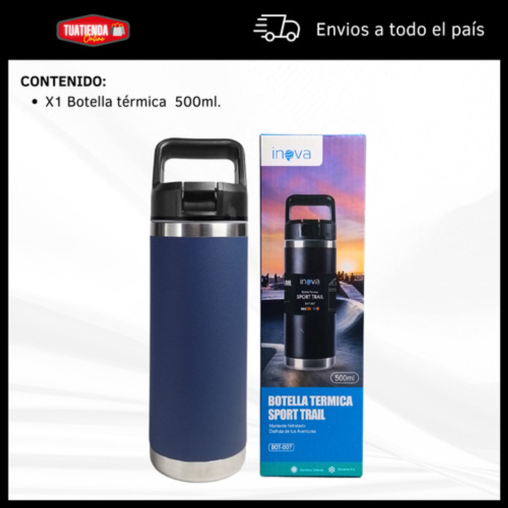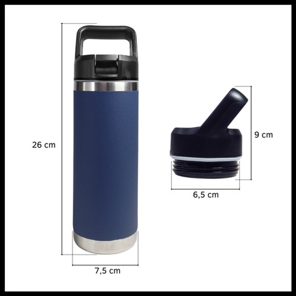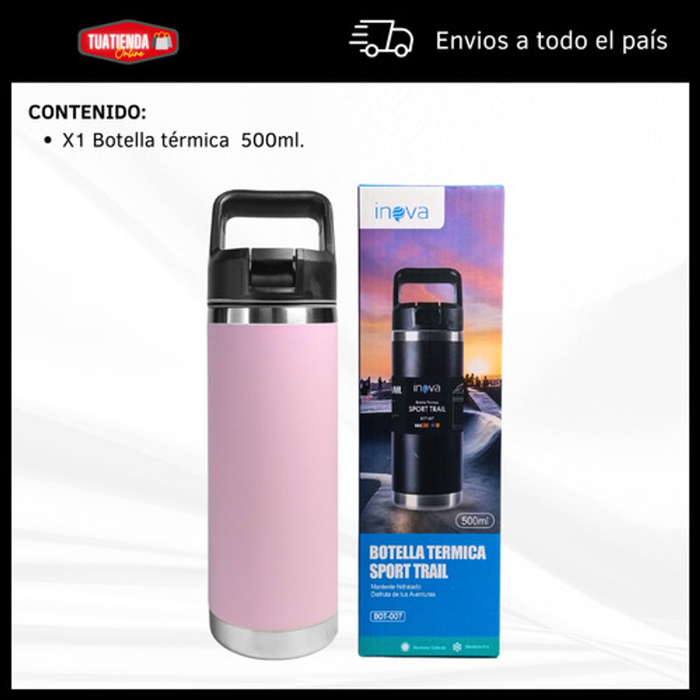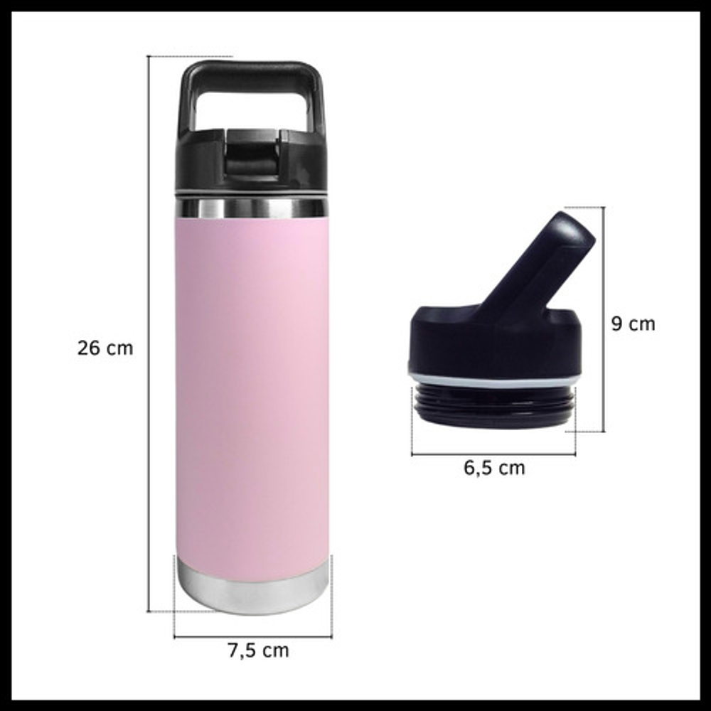 Características: • Doble pared de aislamiento. • Material: acero inoxidable. • Manija fácil transporte. • Apto para frío y calor. • Boquilla deslizante. • Capacidad: 500ml. • Libre de BPA.