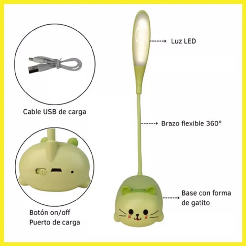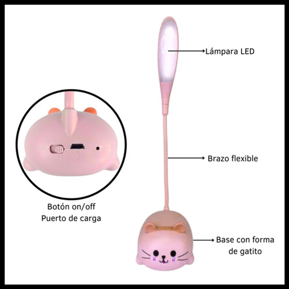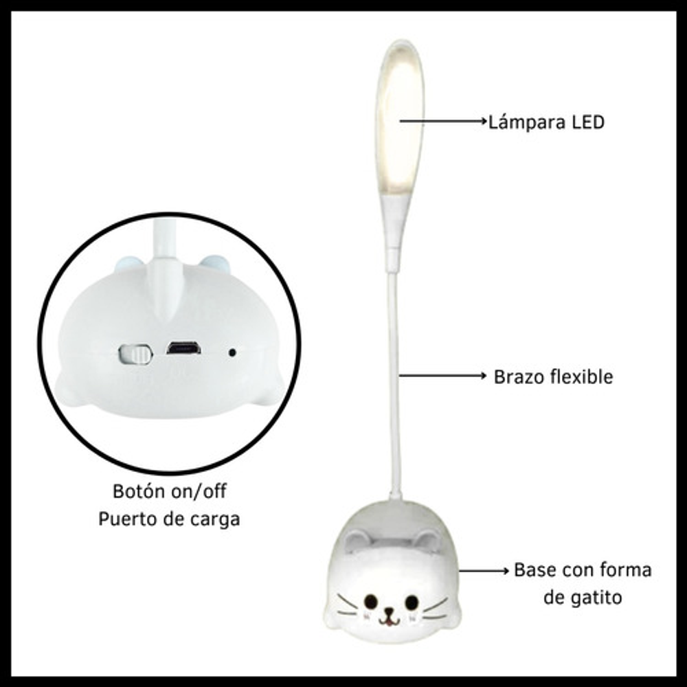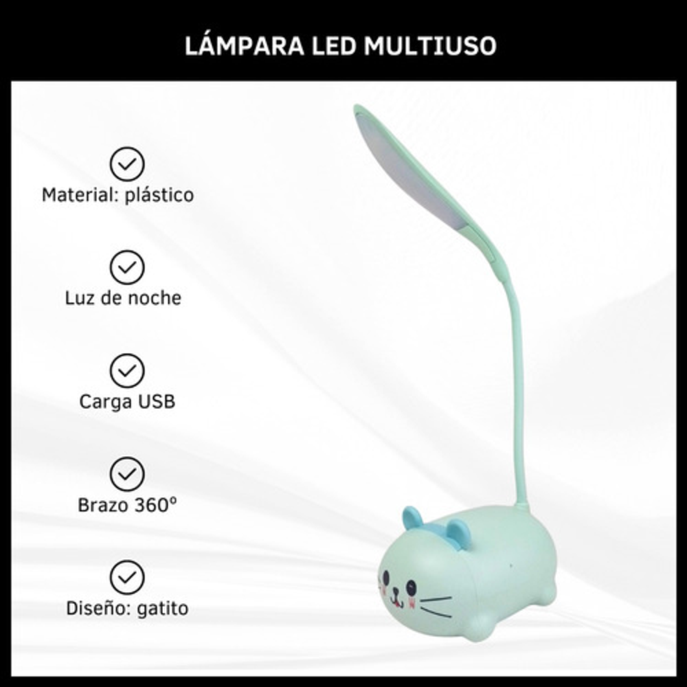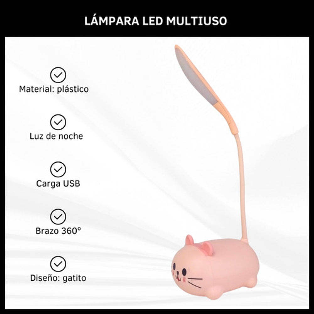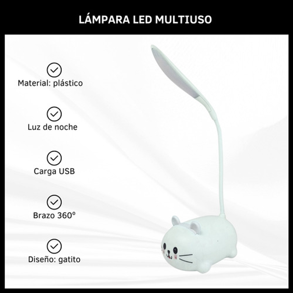 Características: • Material: plástico. • Diseño de gatito. • Luz de noche. • Carga USB. • Brazo 360º.
