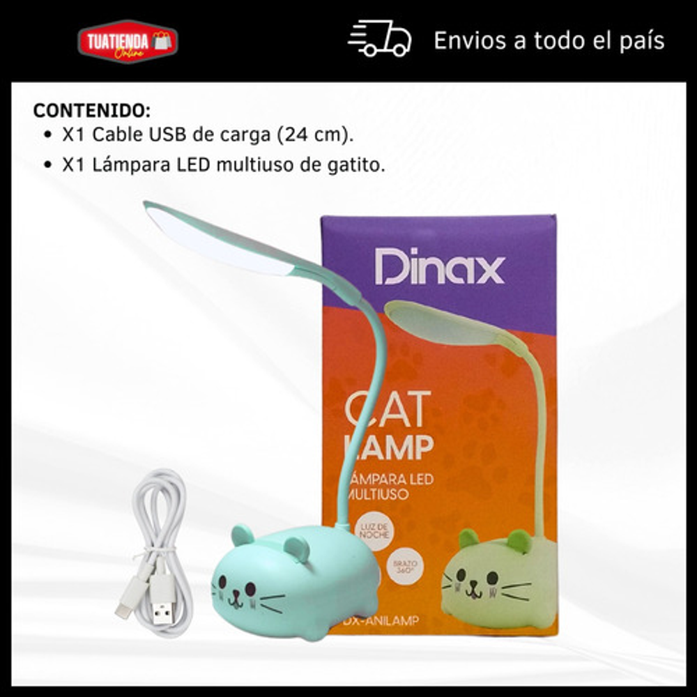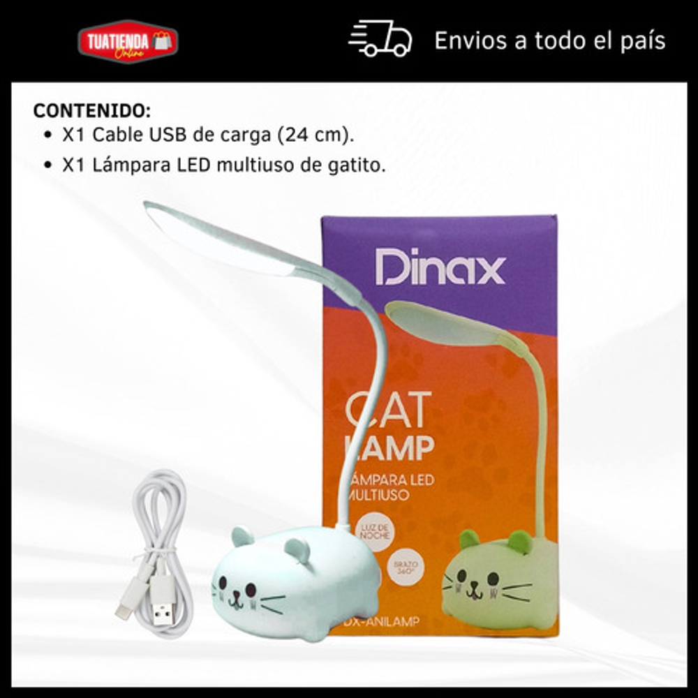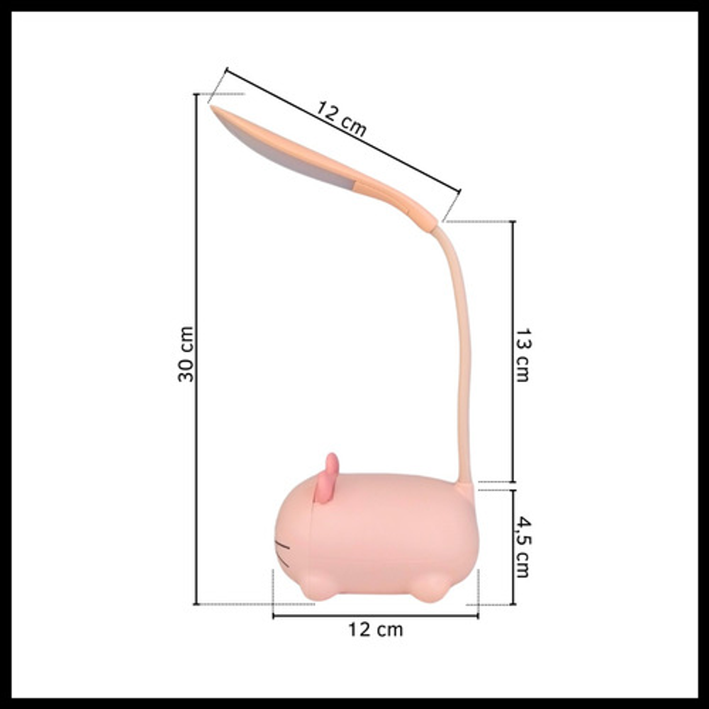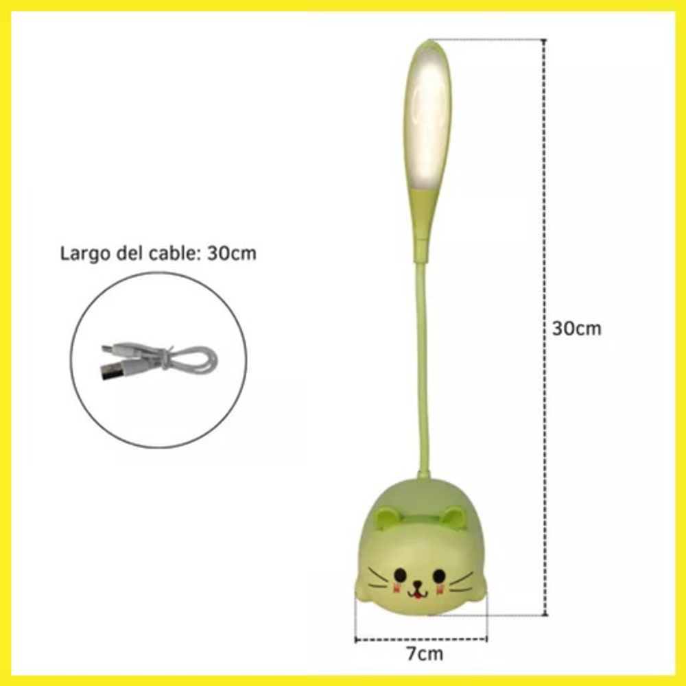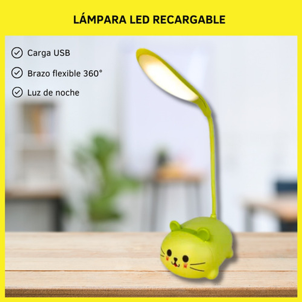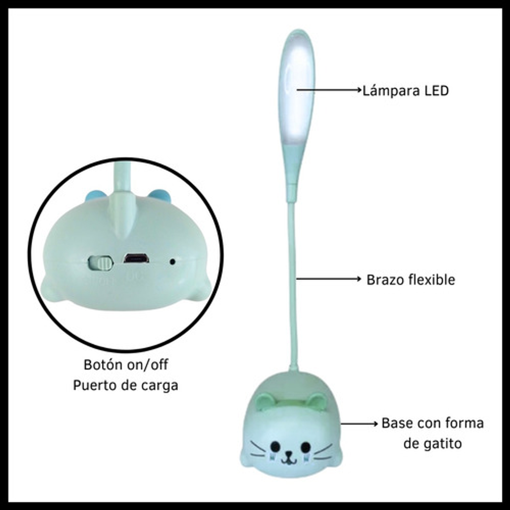Características: • Material: plástico. • Diseño de gatito. • Luz de noche. • Carga USB. • Brazo 360º.