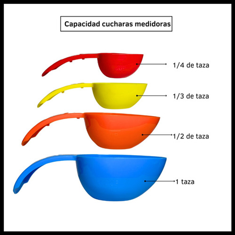Medidas: 1/4, 1/2, 1/3, 1 taza.