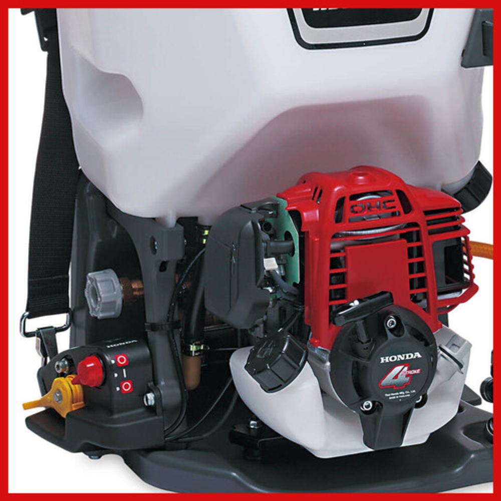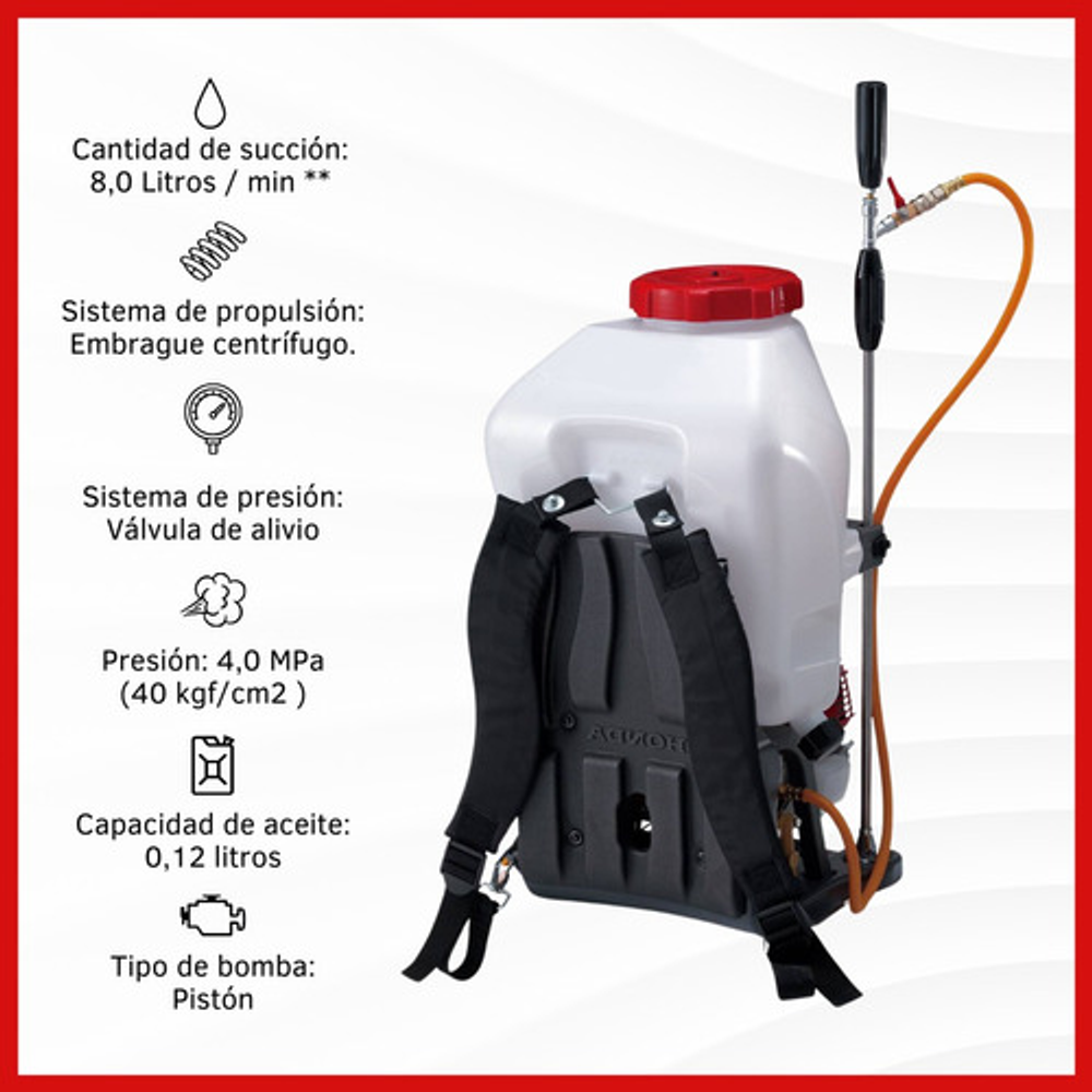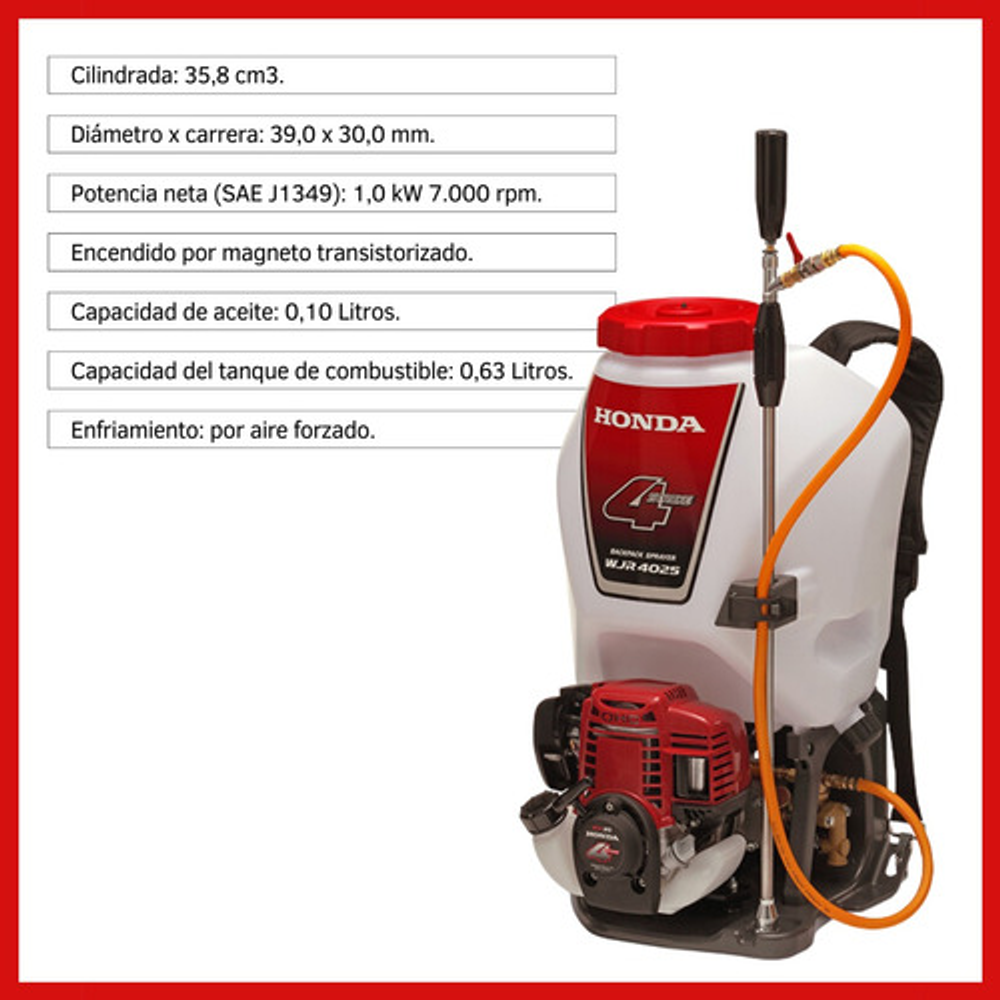 Características: -Modelo de motor: GX35T 4 Tiempos OHC – Cilindro simple. -Cilindrada: 35,8 cm3. -Diámetro x carrera 39,0 x 30,0 mm. -Potencia neta (SAE J1349)1,0 kW 7.000 rpm. -Sistema de encendido: magneto transistorizado. -Capacidad de aceite:0,10 Litros. -Capacidad del tanque de combustible:0,63 Litros. -Aceite recomendado: SAE 10W-30 API clasificación de servicio SE o superior. -Sistema de enfriamiento: Por aire forzado. -Tipo de bomba: Pistón. -Cantidad de succión: 8,0 Litros / min **. -Sistema de propulsión: Embrague centrífugo. -Sistema de presión: Válvula de alivio. -Presión:4,0 MPa (40 kgf/cm2 ). -Capacidad de aceite: 0,12 litros.