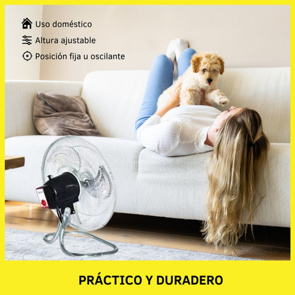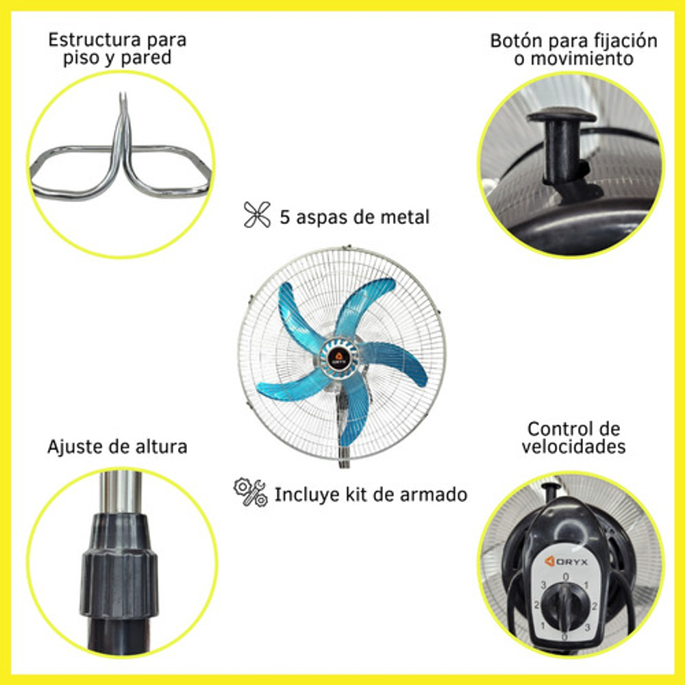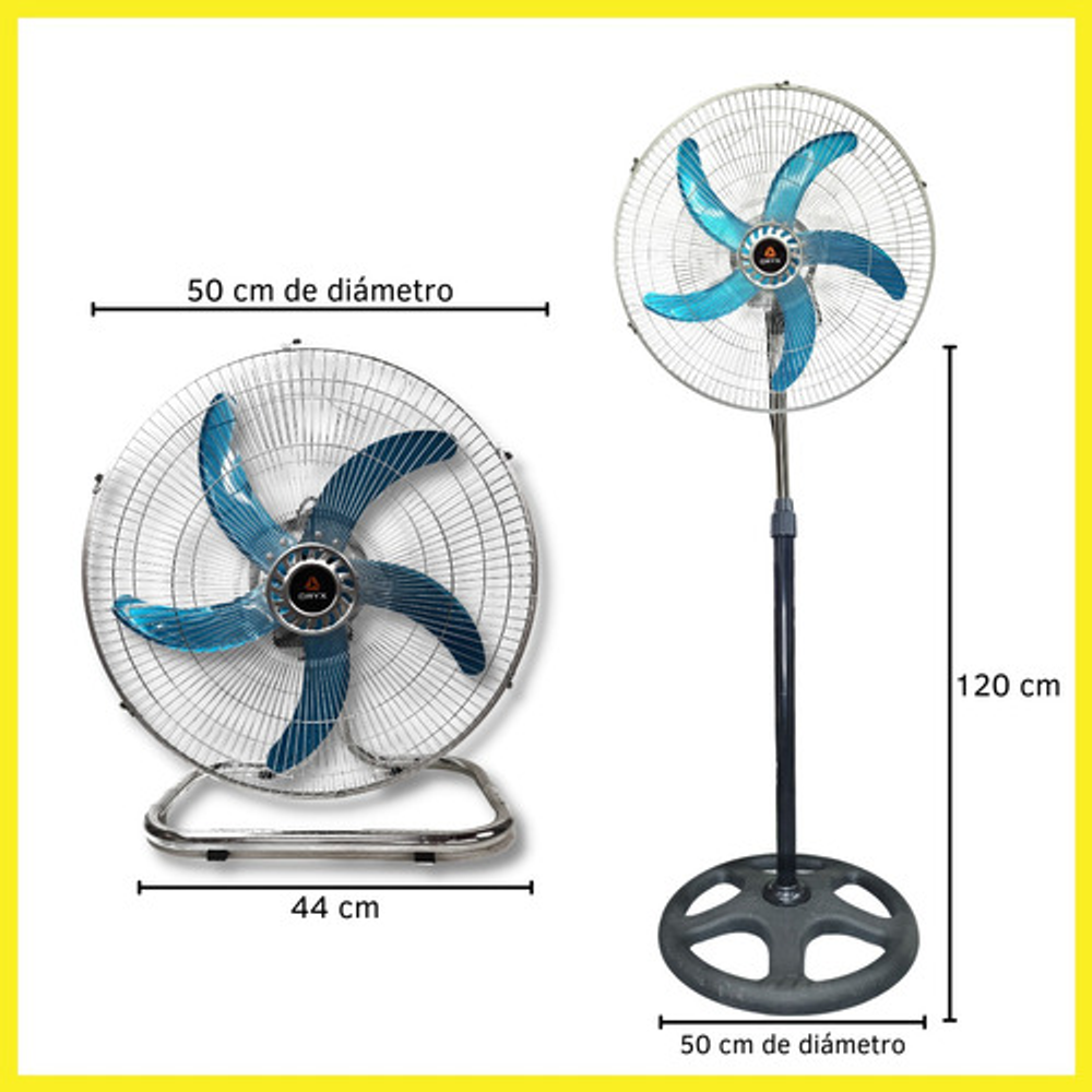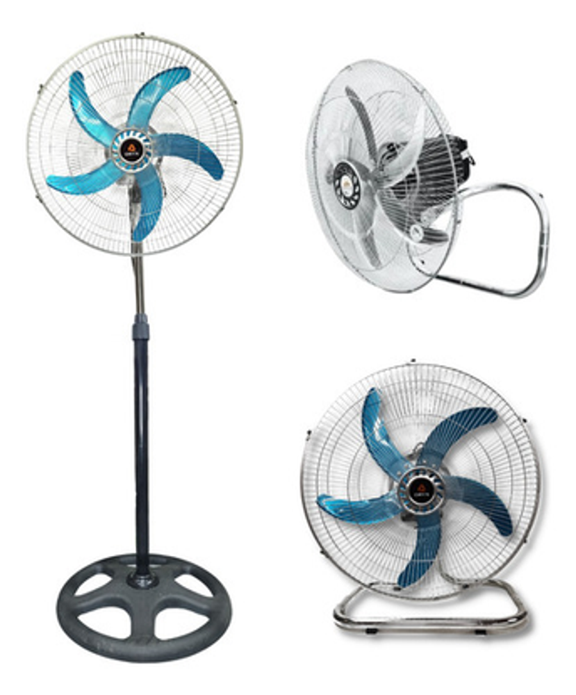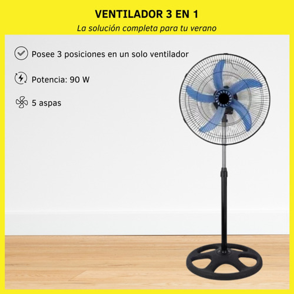 CARACTERÍSTICAS: •Diseño 3 en 1. •5 aspas de metal. •Potencia de 90W. •3 velocidades. •Altura ajustable. •Posición fija o de giro.